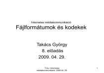 Internetes médiakommunikáció Fájlformátumok és kodekek Takács György 8. előadás 2009. 04. 29. T.Gy. Intrernetes médiakommunikáció. 2009.04. 29. 1 Fontos cél a kérdőív alapján! Hogyan csináljunk internetes műsorszórást! T.Gy. Intrernetes médiakommunikáció. 2009.04. 29. 2 T.Gy. Intrernetes médiakommunikáció. 2009.04. 29. 3 Hang és videó elérése a HTTP használatával • A HTTP lényegében egy fájl visszanyerési protokoll • Teljes fájlt kell letölteni a TCP miatt • Fájlformátumokat eleinte a helyi hozzáférésre tervezték – nagy fájlméretek – letöltés közbeni valós idejű lejátszásra alkalmatlanok T.Gy. Intrernetes médiakommunikáció. 2009.04. 29. 4 Mi köze ennek a fájlformátumhoz és a kodekhez? • A lejátszás megkezdése előtt a teljes fájl letöltődik. A lejátszáshoz szükséges valamennyi információ és erőforrás helyben a fogadó számítógépben egyeztetetten rendelkezésre áll. A tartalom lejátszható a kodekkel, menthető, rendezhető, szerkeszthető, átkódolható, sokszorosítható, árulható a tartalom tulajdonosának bevonása nélkül. • Bármely értelmes felhasználó által beszerezhető és legálisan birtokolható eszközzel a fentiekben felsorolt műveletek elvégezhetők. Vita esetén nehezen választhatók szét a saját, vagy oktatási célú felhasználások a kereskedelmi célú alkalmazásoktól. • Sűrű felhasználónál a hálózat túlterhelődik. • Hirtelen csatornaváltás nem lehetséges, még gigabites T.Gy. Intrernetes 5 hozzáférésnél sem! médiakommunikáció. 2009.04. 29. T.Gy. Intrernetes médiakommunikáció. 2009.04. 29. 6 Folyam protokollok beépítése a webbe • Előzőek alapján HTTP helyett UDP alapú protokollok használata • folyam protokollok • gyorsan kezdi lejátszani és nagymértékben tömörít T.Gy. Intrernetes médiakommunikáció. 2009.04. 29. 7 Fájl formátumok There are many video file formats to choose from when creating video streams. The most common formats are: • Windows Media • RealMedia • Quicktime • MPEG (in particular MPEG-4) • Adobe Flash T.Gy. Intrernetes médiakommunikáció. 2009.04. 29. 8 • There are pros and cons for each format but in the end it comes down to personal preference. Be aware that many of your users will have their own preferences and some users will only use a particular format, so if you want to reach the widest possible audience you should create separate files for each format. In reality this isn't usually practical so you need to make a judgment call on which formats to provide. Obviously the better you understand all the options, the better your decision is likely to be. T.Gy. Intrernetes médiakommunikáció. 2009.04. 29. 9 Downloading • When you download a file the entire file is saved on your computer (usually in a temporary folder), which you then open and view. This has some advantages (such as quicker access to different parts of the file) but has the big disadvantage of having to wait for the whole file to download before any of it can be viewed. If the file is quite small this may not be too much of an inconvenience, but for large files and long presentations it can be very off-putting. • The easiest way to provide downloadable video files is to use a simple hyperlink to the file. A slightly more advanced method is to embed the file in a web page using special HTML code. • Delivering video files this way is known as HTTP streaming or HTTP delivery. HTTP means Hyper Text Transfer Protocol, and is the same protocol used to deliver web pages. For this reason it is easy to set up and use on almost any website, without requiring additional software or special hosting plans. T.Gy. Intrernetes médiakommunikáció. 2009.04. 29. 10 Streaming • Streaming media works a bit differently — the end user can start watching the file almost as soon as it begins downloading. In effect, the file is sent to the user in a (more or less) constant stream, and the user watches it as it arrives. The obvious advantage with this method is that no waiting is involved. Streaming media has additional advantages such as being able to broadcast live events (sometimes referred to as a webcast or netcast). • True streaming video must be delivered from a specialized streaming server. T.Gy. Intrernetes médiakommunikáció. 2009.04. 29. 11 Progressive Downloading • There is also a hybrid method known as progressive download. In this method the video clip is downloaded but begins playing as soon as a portion of the file has been received. This simulates true streaming, but doesn't have all the advantages T.Gy. Intrernetes médiakommunikáció. 2009.04. 29. 12 Which Method to Use? • The method you choose will depend on your situation, but most people will opt for HTTP streaming (download or progressive download). This is the easiest and cheapest way to get started. If necessary you can upgrade to a streaming server later. • Still, you will want to understand both options so the next two pages of this tutorial look at each one in a bit more detail. After that we'll talk about how to create the actual video files. T.Gy. Intrernetes médiakommunikáció. 2009.04. 29. 13 Streaming Video Servers • A streaming media or streaming video server is a specialized application which runs on an Internet server. This is often referred to as "true streaming", since other methods only simulate streaming. True streaming has advantages such as: • The ability to handle much larger traffic loads. • The ability to detect users' connection speeds and supply appropriate files automatically. • The ability to broadcast live events. • There are two ways to have access to a streaming server: • Operate you own server (by purchasing or leasing) • Sign up for a hosted streaming plan with an ISP (Internet Service Provider) T.Gy. Intrernetes médiakommunikáció. 2009.04. 29. 14 Operate your own server • To run your own s