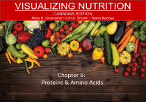 VISUALIZING NUTRITION CANADIAN EDITION Mary B. Grosvenor • Lori A. Smolin • Diana Bedoya Chapter 6: Proteins & Amino Acids CHAPTER 6: PROTEINS & AMINO ACIDS LEARNING OBJECTIVES At the end of this chapter, you should be able to: • Describe the structure of proteins and amino acids and explain their role in health and disease • Plan a diet to meet protein recommendations THINK about this – then share within a PAIR – then SHARE with the class • What do you know about proteins and amino acids? • What are benefits of eating plant foods over animal foods? Sources of protein • Animal: meat, eggs, dairy products • High in saturated fat and cholesterol; provide B vitamins and some absorbable minerals • Plant: grains, nuts, legumes • Low in saturated fat and cholesterol; high in fiber, phytochemicals, and unsaturated fat • Legumes: starchy plant seeds producing bean pods, including peas, peanuts, beans, soybeans, lentils Sources of protein a. Animal products are high in protein, iron, zinc, and calcium but add saturated fat and cholesterol to the diet. Sources of protein Michael Newman/Photo Edit b. Plant sources of protein are rich in fibre, phytochemicals, and monounsaturated and polyunsaturated fats. Amino acids • Amino acids: building blocks of proteins • Carbon, hydrogen, amino group (contains nitrogen), acid group, and a unique side chain • 20 different side chains make 20 different amino acids Amino acids link to form proteins • We obtain amino acids from eating plant and animal foods. • Our bodies reassemble the amino acid building blocks into our body proteins. Building blocks Match the building blocks with the nutrient: ____ complex carbohydrates a) amino acids ____ triglycerides b) fatty acids and glycerol ____ proteins c) monosaccharides Essential vs. non-essential amino acids • Essential/indispensable: Cannot be made in the body so “essential” to eat them • If one is missing, body proteins are broken down to make new proteins • Non-essential/dispensable: Body can make them from essential amino acids so not essential to eat them Essential vs. non-essential amino acids b. Twenty amino acids are commonly found in proteins. The table shown here lists them based on whether they are essential or nonessential and indicates those that are conditionally essential. Essential vs. non-essential amino acids Food A Food B Essential vs. non-essential amino acids Can you use only the amino acids from Food A to make this protein? Essential vs. non-essential amino acids Can you use only the amino acids from Food A to make this protein? The yellow triangle is a nonessential amino acid Essential vs. non-essential amino acids Can you use only the amino acids from Food A to make this protein? The blue square is a limiting amino acid Essential vs. non-essential amino acids Can you use only the amino acids from Food A to make this protein? Essential vs. non-essential amino acids Can you use only the amino acids from Food B to make this protein? Essential vs. non-essential amino acids Can you use only the amino acids from Foods A and B to make this protein? Essential vs. non-essential amino acids Did you use all of the amino acids from Foods A and B to make this protein? It not, what did the body do with the extras? Essential vs. non-essential amino acids Foods A and B are complementary: each supplies some amino acids for the full set of needed amino acids Essential vs. non-essential amino acids Essential amino acids Cannot be made Need to be eaten Non-essential amino acids Can be made from others Conditionally essential amino acids • Under certain conditions some of the nonessential amino acids cannot be made in the body • Example: in phenylketonuria (PKU) phenylalanine cannot be converted to tyrosine thus tyrosine, a nonessential amino acid in healthy individuals, becomes an essential amino acid in people with PKU Protein structure • Peptide bonds: join the acidic group of one amino acid with the amino group of another amino acid • Polypeptides: a chain of amino acids linked by peptide bonds • Proteins: made of one or more polypeptide chains folded into specific three-dimensional structures Amino acids link to form proteins Protein structure vs. function • Shape of proteins determines their functions • If protein shape is changed, then protein function may change Protein denaturation • Denaturation: change in a protein’s threedimensional shape • Occurs with: • Heat from cooking • Acidity (example: low pH in the stomach) • Mechanical agitation Protein denaturation © Can Stock Photo Inc./ glorcza When an egg is cooked, the heat denatures the protein. The protein in a raw egg white forms a clear, viscous liquid, but when cooking denatures it, the egg white becomes white and firm and cannot be restored to its original form. Other factors that denature the proteins in food include mechanical agitation, such as when cream is whipped to make whipped cream, and the addition of acid, such as when milk is curdled by the addition of an acid such as lemon juice. Concept check • Which chemical element is found in protein but not in carbohydrate or lipid? • What determines whether an amino acid must be consumed in the diet? • What determines the shape of a protein? • How does denaturation affect protein function? Protein digestion • Proteins have to be broken down to tripeptides, dipeptides and amino acids, before they can be absorbed into the mucosal cells of the small intestine • Mechanical digestion of proteins starts in the mouth, continues in the stomach and the small intestine • Chemical digestion of proteins begins in the stomach but most of it occurs in the small intestine Protein absorption • In the mucosal cells of the small intestine dipeptides and tripeptides are broken down to single amino acids • Amino acids are moved from the mucosal cells to blood by the transporting system • Since the transporting system has a li