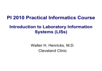PI 2010 Practical Informatics Course Introduction to Laboratory Information Systems (LISs) Walter H. Henricks, M.D. Cleveland Clinic Laboratory Information System (LIS) • Interrelated programs and hardware that provide electronic data processing and information management functions necessary for laboratory operations • Database that establishes and maintains standard definitions and information processing procedures (Elevitch and Aller) Walter H. Henricks, M.D. Introduction to LISs – Outline LIS architecture • LIS dictionaries (a.k.a. maintenance tables) • LIS functions in laboratory workflow – Clinical laboratory (CP) – Anatomic pathology (AP) Walter H. Henricks, M.D. Building Blocks of Laboratory Information Systems LIS application software Database Management System (DBMS) Operating System Hardware Walter H. Henricks, M.D. Host-based LIS Architecture Terminal Server Dumb Terminals Mainframe computer Mainframe: • controls all LIS functions and transactions • holds database and all LIS software Terminals: • data display and input only • PCs can connect using terminal emulation Walter H. Henricks, M.D. Client/Server LIS PC clients Client/server architecture Fax Print server server • PCs (clients) make requests of Database more powerful computers (servers) server that provide various LIS functions • Database server holds database • Other servers handle certain Interface server transactions (‘business logic”) - fax, print, interface • LIS software functions are distributed across all clients and servers Walter H. Henricks, M.D. Mainframe vs. Client/Server • Mainframe/Host-based • Client/Server – Typically characterbased user interface – Limited flexibility – Good security – Centralized maintenance and control – Single point of failure Walter H. Henricks, M.D. – Graphical user interface – Greater configurability – Greater security risks (e.g. viruses, PC ports) – Decentralized and more distributed maintenance – Multiple points of failure, though each less catastrophic Thin Client Architecture in LIS Thin client server “Thin” clients • Thin client generically refers to the setting in which a device (e.g. PC) runs application software that is relatively simple and requires less computer power and resources to operate • All application logic executes on thin client server • Resembles host-based/mainframe model in some respects (connection through an intermediate server) Walter H. Henricks, M.D. Database server Thin Client Computing Benefits Promised • Easier administration – standardized application/programs controlled centrally – Necessary to distribute software updates in a complex environment • • • • Cross-platform (PC, Mac) Lower hardware requirements and costs Remote access Less network traffic Walter H. Henricks, M.D. Thin Client Computing Considerations and Drawbacks • Hardware and license costs • Single point of failure for all workstations connected to thin client server • Effectiveness of vendor’s implementation of thin client • Inability to do specialized functions on thin client workstation, e.g. imaging, voice recognition Walter H. Henricks, M.D. Introduction to LISs – Outline • LIS architecture LIS dictionaries (a.k.a. maintenance tables) • LIS functions in laboratory workflow – Clinical laboratory (CP) – Anatomic pathology (AP) Walter H. Henricks, M.D. LIS Dictionaries define the framework for information processing and workflow throughout the laboratory • Standardize and structure lab conventions and procedures • Standardize laboratory and LIS terminology and definitions • Ensure entry of valid data by constraining data entry choices for data fields • Define content and format of elements that appear on reports (e.g. units of measure) • Define rules and calculations Walter H. Henricks, M.D. LIS Dictionaries – People, Places, Things • Test and test battery/profile definitions • Test worksheets / worklists • Person dictionaries (e.g., ordering physician, pathologist, technologist) • Security/access level privileges for user types • Patient locations • Laboratory locations (e.g. sections, “areas”) • Specimen types • Histologic stain protocols (e.g. Giemsa on gastric bx) • Analyzer/instrument interfaces • Autoverification parameters • Many others… Walter H. Henricks, M.D. TEST DEFINITION DICTIONARY TEST NAME: Hemoglobin TEST CODE: HGB LAB. DEPT: CORE CONTAINER TYPES: LAV WORKSHEET(S): CELCOUNTR IN BATTERIES: CBC, CBCDIF, HGBHCT AUTOVERIFY RANGE: 6.1-19.9 TEST BATTERY DICTIONARY CBC CBCDIF HGBHCT PTINR BMP Etc. AUTOVERIFICATION DICTIONARY RULES FOR HGB Etc. Walter H. Henricks, M.D. LAB DEPT DICTIONARY CORE CLINIC GASLAB Etc. CONTAINER TYPE DICTIONARY LAV BLUE RED Etc. INSTRUMENT INTERFACE TABLE BLDCTR INTERFACE MAINTENANCE CHEM INTERFACE MAINTENANCE Etc. Maintenance Definitions in AP LISs • Many dictionary types in AP LISs overlap with those in CP LISs, but… • AP LISs must support operations and data flow that are quite different from the clinical laboratory. • Specimen Type (or Part Type) and Special Stain dictionaries are analogous to test definitions in CP LIS. • Example: “stomach bx” defined in Specimen Type dictionary would be tied to histology protocols (e.g. H&E x2), special stain protocols (e.g. Giemsa), billing information, SNOMED codes, and other data. Walter H. Henricks, M.D. Dictionaries and maintenance tables tailor the LIS to your laboratory • Table definition is most critical to successful LIS implementation and requires time, attention, and planning. • Some dictionaries must be built in a specific sequence, since entries depend on other dictionaries. • Dictionaries may be pre-built by vendor, but more important is defining tables in a way that meets your lab’s specific needs • Modifying existing tests or adding new tests requires careful attention to ensure that all appropriate tables are updated and tha