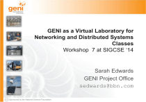 GENI as a Virtual Laboratory for Networking and Distributed Systems Classes Workshop 7 at SIGCSE ‘14 Sarah Edwards GENI Project Office sedwards@bbn.com Sponsored by the National Science Foundation Agenda Presentation and Demo: An Introduction to GENI (45min) Hands-on: Getting Started with GENI (45min) Break (10min) Hands-on: IPv4 Routing Assignment (50min) Resources for Instructors (15min) Miscellaneous GENI Topics & Wrap-Up (15min) Sponsored by the National Science Foundation GENI Introduction – SIGCSE ‘14 – 5 March 2014 www.geni.net 2 GENI Exploring Networks of the Future www.geni.net Sponsored by the National Science Foundation Outline • • • • • • GENI – Exploring future internets at scale The GENI Concept Building GENI Experimental and Classroom use of GENI What’s next for GENI? GENI: An experimenter’s view Sponsored by the National Science Foundation GENI Introduction – SIGCSE ‘14 – 5 March 2014 www.geni.net 4 Global networks are creating extremely important new challenges Science Issues We cannot currently understand or predict the behavior of complex, large-scale networks Innovation Issues Substantial barriers to at-scale experimentation with new architectures, services, and technologies Society Issues Credit: MONET Group at UIUC We increasingly rely on the Internet but are unsure we can trust its security, privacy or resilience Sponsored by the National Science Foundation GENI Introduction – SIGCSE ‘14 – 5 March 2014 www.geni.net 5 GENI: Infrastructure for Experimentation GENI provides compute resources that can be connected in experimenter specified Layer 2 topologies. Sponsored by the National Science Foundation GENI Introduction – SIGCSE ‘14 – 5 March 2014 www.geni.net 6 GENI: Infrastructure for Experimentation GENI provides compute resources that can be connected in experimenter specified Layer 2 topologies. Sponsored by the National Science Foundation GENI Introduction – SIGCSE ‘14 – 5 March 2014 www.geni.net 7 Multiple GENI Experiments run Concurrently Infrastructure can be shared between slices Experiments live in isolated “slices” Sponsored by the National Science Foundation GENI Introduction – SIGCSE ‘14 – 5 March 2014 www.geni.net 8 GENI is “Deeply Programmable” I install software I want throughout my network slice (into routers, switches, …) or control switches using OpenFlow Experimenters can set up custom topologies, protocols and switching of flows Sponsored by the National Science Foundation GENI Introduction – SIGCSE ‘14 – 5 March 2014 www.geni.net 9 GENI Compute Resources GENI Wireless compute nodes GENI Racks Existing Testbeds (e.g. Emulab) Sponsored by the National Science Foundation GENI Introduction – SIGCSE ‘14 – 5 March 2014 www.geni.net 10 GENI Networking Resources Networking within a Rack National Research Backbones (e.g. Internet2) Regional Networks (e.g. CENIC) WiMAX Base Stations Sponsored by the National Science Foundation GENI Introduction – SIGCSE ‘14 – 5 March 2014 www.geni.net 11 Outline • • • • • GENI – Exploring future internets at scale The GENI Concept Building GENI Experimental and Classroom use of GENI GENI: An experimenter’s view Sponsored by the National Science Foundation GENI Introduction – SIGCSE ‘14 – 5 March 2014 www.geni.net 12 A bright idea “I have a great idea.” “That will never work.” Sponsored by the National Science Foundation GENI Introduction – SIGCSE ‘14 – 5 March 2014 www.geni.net 13 Let’s try it out! My new architecture worked great in the lab, so now I’m going to try a larger experiment for a few months. He uses a modest slice of GENI, sharing its infrastructure with many other concurrent experiments. Sponsored by the National Science Foundation GENI Introduction – SIGCSE ‘14 – 5 March 2014 www.geni.net 14 It turns into a really good idea This service looks very useful His slice of GENI keeps growing, but GENI is still running many other concurrent experiments. Sponsored by the National Science Foundation GENI Introduction – SIGCSE ‘14 – 5 March 2014 www.geni.net 15 Attracts real users “Looks like an app to me.” “It’s my very own GENI slice.” Sponsored by the National Science Foundation GENI Introduction – SIGCSE ‘14 – 5 March 2014 www.geni.net 16 “Boy did I learn a lot!” “What a cool service.” (I wonder how it works.) “I always said it was a great idea.” (But way too conservative.) Sponsored by the National Science Foundation GENI Introduction – SIGCSE ‘14 – 5 March 2014 www.geni.net 17 ?? If you have a great idea, check out the NSF CISE research programs for current opportunities. Sponsored by the National Science Foundation GENI Introduction – SIGCSE ‘14 – 5 March 2014 www.geni.net 18 Moral of this story GENI is meant to enable . . . – At-scale experiments – Internet-incompatible experiments – Both repeatable and “in the wild” experiments – ‘Opt in’ for real users – Instrumentation and measurement tools GENI creates a huge opportunity for ambitious research! Sponsored by the National Science Foundation GENI Introduction – SIGCSE ‘14 – 5 March 2014 www.geni.net 19 Outline • • • • • GENI – Exploring future internets at scale The GENI Concept Building GENI Experimental and Classroom use of GENI GENI: An experimenter’s view Sponsored by the National Science Foundation GENI Introduction – SIGCSE ‘14 – 5 March 2014 www.geni.net 20 Growing GENI’s footprint Sponsored by the National Science Foundation GENI Introduction – SIGCSE ‘14 – 5 March 2014 www.geni.net 21 Federation GENI grows by GENI-enabling heterogeneous infrastructure My experiment runs across the evolving GENI federation. GENI Rack Commercial Clouds Backbone #1 Campus My GENI Slice Access #1 Research Testbed Corporate GENI suites Regional Non-US Testbeds This approach looks remarkably familiar . . . GENI Rack Avoid technology “lock in” and 