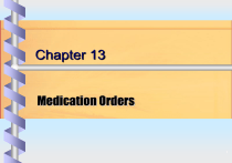 Chapter 13 Medication Orders 1 Objectives • Explain the benefits of Computer Physician Order Entry regarding medication orders. • Define standing, standing prn, stat, one-time, and short-series medication orders. • List the five components of a medication order. Copyright © 2009, 2004 by Saunders, an imprint of Elsevier Inc. All rights reserved. Slide 2 Objectives, continued • List four groups of drugs that usually have automatic “stop dates.” • Name two reference books for medications. • List four routes by which medications are administered. Copyright © 2009, 2004 by Saunders, an imprint of Elsevier Inc. All rights reserved. Slide 3 Objectives, continued • Demonstrate the procedure for using the Physicians’ Desk Reference (PDR). • Describe the general purpose for selected drug groups. • Name three common skin tests performed and explain the purpose of each. Copyright © 2009, 2004 by Saunders, an imprint of Elsevier Inc. All rights reserved. Slide 4 Objectives, continued • Recognize the most commonly used drugs, which are listed in italics in the “Drug Groups” section of the chapter, and name the drug group to which each belongs. Copyright © 2009, 2004 by Saunders, an imprint of Elsevier Inc. All rights reserved. Slide 5 Lesson 13.1 Copyright © 2009, 2004 by Saunders, an imprint of Elsevier Inc. All rights reserved. Slide 6 Adverse Drug Events (ADEs) 770,000 people are injured or die annually as a result of ADEs • 56% occurred at the stage of ordering • 34% at administration • 6% at transcribing • 4% at dispensing Copyright © 2009, 2004 by Saunders, an imprint of Elsevier Inc. All rights reserved. Slide 7 Computer Physician Order Entry (CPOE) & Clinical Decision Support System (CDSS) • Medications are ordered automatically when CPOE is implemented • Orders are sent directly to the pharmacy • Handwriting errors are reduced and fewer adverse drug events occur • Orders are integrated with patient information, allergies, lab results, and prescription data when used with a Clinical Decision Support System (CDSS) • Physicians are warned against drug interactions, allergies, or overdose Copyright © 2009, 2004 by Saunders, an imprint of Elsevier Inc. All rights reserved. Slide 8 Medical Administration Record (MAR): Computerized or Handwritten • Medication orders are printed or written on the MAR • The MAR is a permanent part of the patient’s chart Copyright © 2009, 2004 by Saunders, an imprint of Elsevier Inc. All rights reserved. Slide 9 Medication Names • Official name: name under which drug is listed in official government publications of drug standards • Chemical name: name that describes the chemical composition of the drug • Generic name: shortened name given to the drug by the developer; generic names are not capitalized Copyright © 2009, 2004 by Saunders, an imprint of Elsevier Inc. All rights reserved. Slide 10 Medication Names, continued • Brand name, trade name, or proprietary name: name given to and registered by the manufacturer The brand name is always capitalized and may have a trademark symbol (™ or ®) A drug has only one generic name but may have many trade names, depending on how many companies manufacture it Copyright © 2009, 2004 by Saunders, an imprint of Elsevier Inc. All rights reserved. Slide 11 5 Components of a Medication Order 1. Name of medication 2. Dose 3. Route 4. Frequency 5. Qualifying phrase Example: Demerol 100 mg IM q 4 hrs for pain (1) (2) (3) (4) (5) Copyright © 2009, 2004 by Saunders, an imprint of Elsevier Inc. All rights reserved. Slide 12 Medication Forms Copyright © 2009, 2004 by Saunders, an imprint of Elsevier Inc. All rights reserved. Slide 13 Medication Doses • Apothecary system • Metric system Copyright © 2009, 2004 by Saunders, an imprint of Elsevier Inc. All rights reserved. Slide 14 Apothecary System • Grain • Dram • Ounce gr dr or or • Measurements in this system are written in lower case Roman numerals. These numerals have a line over them and may be dotted to avoid confusion with similar-appearing letters or numerals Copyright © 2009, 2004 by Saunders, an imprint of Elsevier Inc. All rights reserved. Slide 15 Metric System • Weight • Volume • Length gram (g) liter (L) meter (M) • Smaller and larger units in the metric system can be indicated by attaching prefixes to the basic units Kilo- is used to enlarge the basic unit 1000 times Copyright © 2009, 2004 by Saunders, an imprint of Elsevier Inc. All rights reserved. Slide 16 Metric System, continued • centi (cm) is used to diminish the basic unit by 100 • milli (mm), (mL), and (mg) diminishes the basic unit by 1000 • The symbol µ micro (micrometer or 0.001 millimeter) • The terms milliliter (ML) and cubic centimeter (CC) are used interchangeably Copyright © 2009, 2004 by Saunders, an imprint of Elsevier Inc. All rights reserved. Slide 17 Metric System, continued • The metric system uses the Arabic numerals that we all know, e.g., 1, 2, 3 • Abbreviations are placed after the number, as in 50 mg or 500 mL • Quantities less than 1 and fractions are written in decimal form as in 0.25 mg, 1.25 mg, and 1.5 g Copyright © 2009, 2004 by Saunders, an imprint of Elsevier Inc. All rights reserved. Slide 18 Routes for Administering Medication • PO • Sub-ling - SL • Topical • Inhalants Oral Under the tongue Sprays, creams, suppositories Nebulizers Copyright © 2009, 2004 by Saunders, an imprint of Elsevier Inc. All rights reserved. Slide 19 Routes for Administering Medication, continued Parenteral: Intramuscular (IM) Intravenous (IV) Subcutaneous (SQ) Intradermal (ID) Transdermal Copyright © 2009, 2004 by Saunders, an imprint of Elsevier Inc. All rights reserved. Slide 20 Angle of Needle Insertion for Parenteral Injections From Potter PA, Perry AG: Fundamentals of Nursing, 6th ed, St. Louis, Mosby, 2005. Copyright © 2009, 2004 by Saunders, an imprint of Elsevier Inc. All rights res