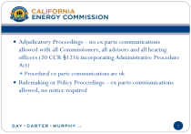 Adjudicatory Proceedings – no ex parte communications allowed with all Commissioners, all advisors and all hearing officers (20 CCR § 1216 incorporating Administrative Procedure