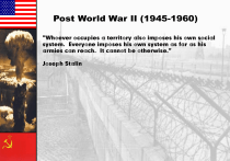 Post World War II (1945-1960) “Whoever occupies a territory also imposes his own social system. Everyone imposes his own system as far as his armies can reach. It cannot be otherwise.” Joseph Stalin I. The Cold War A. Roots of the Cold War 1. during WWII, Russian troops liberated eastern Europe while American troops freed western Europe 2. Soviet Viewpoint a. need a “buffer zone” to protect from third German attack b. Allies not truthful about creation of an atomic bomb c. Allies were late in opening a western front 3. American Viewpoint a. Stalin refused to allow free elections in eastern Europe b. creation of communist, satellite governments in Eastern Europe creating an “Iron Curtain between east and west” From Stettin in the Balkans, to Trieste in the Adriatic, an iron curtain has descended across the Continent. Behind that line lies the ancient capitals of Central and Eastern Europe. -- Sir Winston Churchill, 1946 B. Containment 1. Truman Doctrine a.US promises to send troops to any nation fighting communism b.US begins policy of stopping the spread of communism (containment) 2. Marshall Plan a. US sees Europe as a “breeding ground” for communism b. US offers monetary aid ($13 billion) to any nation in need including communist countries C. Germany 1. during the war, Allied leaders met at Yalta to discuss the fate of Germany 2. Germany is divided into two nations; West Germany is democratic and East Germany is communist 3. Berlin is also divided although it is on the eastern side 4. Stalin attempts to gain control of all of Berlin by closing all roads into the city 5. President Truman refuses to give up Berlin and Allies send in supplies for 11 months until Stalin gives up (Berlin Airlift) D. Collective Security 1. western Europeans nations and the United States create military defense alliance (NATO) 2. first peacetime military alliance 3. US will create other alliances with other nations throughout the world (MEATO, ANZUS, etc) 4. Eisenhower Doctrine a. called for the use of American troops to spread communism in the Middle East b. used to prevent communist threats in numerous nations E. Korean War 1. after WWII, Korea was divided into (communist) North and (capitalist) South 2. in 1950, North Korea invaded South Korea 3. the United States with approval from the United Nations sent troops led by General Douglas MacArthur to liberate South Korea 4. US pushed North Korean troops back to the Chinese border (Yalu River) 5. “Red China” a. after WWII, Mao attacks corrupt Nationalist government b. in 1949 communists gain control and People’s Republic of China is formed c. Chinese “volunteers” cross border forcing United Nations troops to retreat 6. Total War or Containment? a. General MacArthur wanted to escalate the war into China b. President Truman feared Russian involvement and rejected the request c. MacArthur criticism of the President led to his firing in 1951 7. in 1953, an armistice ends the war and established the 38th parallel as the dividing line F. Arms/Space Race 1. US and Soviet Union build weapons of “mass destruction” (bombs, missiles) 2. both nations spend trillions on weapons and space programs 3. many Americans built bomb shelters to protect themselves 4. Massive Retaliation a. policy created by Eisenhower’s administration to rely on nuclear weapons rather than large military force b. used weapons as a threat (Brinksmanship) b. used weapons as a threat (Brinksmanship) 5. Sputnik a. first man-made satellite sent into space b. led to increase in missile production c. led to call for improvements in math and science (National Defense Education Act) II. Red Scare A. House Un-American Activities Committee (HUAC) 1. Congressional committee designed to check the loyalty of liberals, New Deal leaders and Hollywood 2. Hollywood Ten a. belief that many in Hollywood were communist sympathizers b. refusal to testify led to prison terms and blacklisting of 250 people B. Loyalty Review Board 1. created by President Truman to identify disloyal organizations 2. authorized FBI to attack the civil liberties of these people 3. over three million people were affected C. Espionage 1. former state department official, Alger Hiss, denies being a Russian spy but is convicted of perjury 2. The Rosenbergs a. in 1950, a couple is charged with selling atomic secrets b. tried, found guilty and executed for spying c. reminded many of the Sacco and Vanzetti case in the 1920s D. McCarthyism (1950-1954) 1. Senator McCarthy claimed that communists are in the State Department 2. accuses that Army is covering up foreign espionage 3. Army hearings made him look ridiculous 4. Arthur Miller’s The Crucible used the Salem Witch Trial as a metaphor for McCarthyism III. America at Home A. Politics 1. Election of 1948 a. Republicans nominate NY Governor Thomas Dewey b. many democrats were unhappy with Truman’s policies causing the party to split c. Strom Thurmond runs as a Dixiecrat who opposes civil rights d. Truman surprises nation with victory thanks to African-Americans, labor and farmers (New Deal Coalition) 2. Fair Deal a. President Truman’s domestic program b. expanded Social Security and increased minimum wage to $.75 3. Election of 1952 – “We Like Ike” a. Truman does not run for re-election (25% approval rating) and party nominates Adlai Stevenson b. Republicans nominate war hero, General Dwight Eisenhower (“I Like Ike”) c. military background and emphasis on combating Communism helps Eisenhower/Nixon win easily B. Economy 1. Demobilization a. many Americans feared a post war recession due to return of 9 million soldiers and loss of military contracts b. Congress passed the Serviceman Readjustment Act (GI Bill) which provided medical care for veterans and money for schooling c. led to firing of African-Americans and women 2. many workers went on strike demanding higher wages after government removed price controls 3. Taft-Hartley Act (1947) a. passed by re
