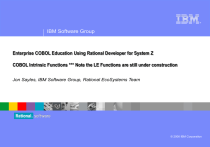 ® IBM Software Group Enterprise COBOL Education Using Rational Developer for System Z COBOL Intrinsic Functions *** Note the LE Functions are still under construction Jon Sayles, IBM Software Group, Rational EcoSystems Team © 2006 IBM Corporation IBM Trademarks and Copyrights © Copyright IBM Corporation 2007,2008, 2009. All rights reserved. The information contained in these materials is provided for informational purposes only, and is provided AS IS without warranty of any kind, express or implied. IBM shall not be responsible for any damages arising out of the use of, or otherwise related to, these materials. Nothing contained in these materials is intended to, nor shall have the effect of, creating any warranties or representations from IBM or its suppliers or licensors, or altering the terms and conditions of the applicable license agreement governing the use of IBM software. References in these materials to IBM products, programs, or services do not imply that they will be available in all countries in which IBM operates. This information is based on current IBM product plans and strategy, which are subject to change by IBM without notice. Product release dates and/or capabilities referenced in these materials may change at any time at IBM’s sole discretion based on market opportunities or other factors, and are not intended to be a commitment to future product or feature availability in any way. IBM, the IBM logo, the on-demand business logo, Rational, the Rational logo, and other IBM Rational products and services are trademarks or registered trademarks of the International Business Machines Corporation, in the United States, other countries or both. Other company, product, or service names may be trademarks or service marks of others. 2 Course Contributing Authors Thanks to the following individuals, for assisting with this course: Tom Ross, IBM 3 Purpose of This Document Course Name: COBOL Foundation Training - with RDz Course Description: Learn the COBOL language, RDz and learn z/OS terms, concepts and development skills in this course. Pre-requisites: Some experience in a 3rd or 4th Generation Language is expected. SQL is also recommended. Course Length: 10 days Topics (Agenda) Getting Started - installing and configuring RDz - and the course materials, and using Eclipse to edit COBOL COBOL General Language Rules Basic COBOL Statements Structured Programming Concepts and Coding Patterns Data - numeric and character - deep/dive Records and table handling - deep/dive Input/Output and Sequential File patterns Debugging Programs - Note: Deep dive on using RDz for common COBOL programming errors (001, 0C4, 0C7, infinite loops, fall-thru, etc.) COBOL Subprograms and the Linkage Section Advanced Character Manipulation COBOL Intrinsic Functions, Date and Time coding patterns, and Language Environment calls Reports and report writing patterns OS/390 Concepts and JCL (here's where the Sandbox/mainframe access starts) Compile/Link & Run Procs on the mainframe Indexed file Coding Patterns Sort/Merge and Master File Update Coding Patterns Accessing DB2 Data and Stored Procedures COBOL in the Real World: – – – – – – – CICS - lecture only IMS (DL/I and TM) - ditto Batch processing - ditto Java calling COBOL COBOL and XML Statements SOA and COBOL - creating and calling Web Services Web 2.0 using Rich UI 4 Course Details Audience This course is designed for application developers who have learned or programmed in a 3rd or 4th generation language – and who need to build leadingedge applications using COBOL and Rational Developer for System z. Prerequisites This course assumes that the student has a basic understanding and knowledge of software computing technologies, and general data processing terms, concepts and vocabulary. Knowledge of SQL (Structured Query Language) is assumed for database access is assumed as well. Basic PC and mouse-driven development skills, terms and concepts are also assumed. Note that we will be covering RDz's mainframe-editor-compliant function key idiom in this unit 5 Course RBD/EGL Development Units: Function Overview Alphanumeric Functions Date Functions Numeric and Integer Functions Appendices 6 Intrinsic Functions Some high-level programming languages have built-in functions that you can reference in your program as if they were variables that have defined attributes and a predetermined value. In COBOL, these functions are called intrinsic functions. They provide capabilities for manipulating strings, dates and numbers. Examples: 01 01 01 01 01 01 Tax-S Pic Tax-T Pic Tax-W Pic Tax-B Pic Ave-Tax Pic Median-Tax Pic Compute Ave-Tax = Compute Median-Tax = 99v999 value .045. 99v999 value .02. 99v999 value .035. 99v999 value .03. 99v999. 99v999. Function Mean (Tax-S Tax-T Tax-W Tax-B) Function Median (Tax-S Tax-T Tax-W Tax-B) 7 Coding Intrinsic Functions – 1 of 3 You code an intrinsic function in one of two ways: 1. Right-to-left (COBOL COMPUTE style) Specify the Data Division receiving variable name (must be type-compatible with the Function) Code the equal sign Code the reserved word: Function (this is capital-insensitive) Code the Function name Specify one or more parameters to the function – Separate the parameters by one or more blanks (spaces) Example: Compute Ave-Tax = Function Mean (Tax-S Tax-T Tax-W Tax-B) 2. Left-to-right (COBOL MOVE style) Code the COBOL MOVE keyword Code the reserved word: Function (this is capital-insensitive) Code the Function name Specify one or more parameters to the function – Separate the parameters by one or more blanks (spaces) Specify the receiving variable (must be type-compatible with the Function's return value) Example: MOVE Function Length (Output-Record) To Rec-Lth For Intrinsic functions that return a numeric value you can use either the MOVE or COMPUTE coding style For intrinsic functions that return a non-numeric value you MUST use the MOVE coding style 8 Coding Intrinsic Functions – 2 of 3 De