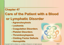 Chapter 47 Care of the Patient with a Blood or Lymphatic Disorder - Agranulocytosis - Leukemia - Coagulation Disorders - Platelet Disorders - Thrombocytopenia - Clotting Factor Defects - Hemophilia Copyright © 2007 by Mosby, Inc., an affiliate of Elsevier Inc. All rights reserved. Slide 1 Disorders of the Hematological and Lymphatic Systems • Agranulocytosis Etiology/pathophysiology • Severe reduction in the number of granulocytes Basophils, eosinophils, neutrophils • WBC extremely low – leukopenia Neutrophil count is < 200/mm3 – neutropenia o Normal = 3000 to 7000/mm3 • Causes of agranulocytosis Medications adverse reaction or toxicity primary cause Chemotherapy Radiation Neoplastic disease Viral and bacterial infections Copyright © 2007 by Mosby, Inc., an affiliate of Elsevier Inc. All rights reserved. Slide 2 Disorders of the Hematological and Lymphatic Systems • Agranulocytosis Etiology/pathophysiology • Suppression of bone marrow reduces the number and production of WBC • Leukocytes from bone marrow provide body protection against microorganisms • Protection is ineffective when bone marrow suppression has occured Copyright © 2007 by Mosby, Inc., an affiliate of Elsevier Inc. All rights reserved. Slide 3 Disorders of the Hematological and Lymphatic Systems • Agranulocytosis (continued) Clinical manifestations/assessment • Symptoms of infection Fever, headache, chills, fatigue • Ulcerations of mucous membranes Mouth, nose, pahrynx, vagina, rectum • Bronchial pneumonia • Urinary tract infection Assessment • Subjective data Note common complaints of fever, extreme fatigue, prostration Meds taken, OTC & prescription may cause condition Copyright © 2007 by Mosby, Inc., an affiliate of Elsevier Inc. All rights reserved. Slide 4 Disorders of the Hematological and Lymphatic Systems • Agranulocytosis (continued) Assessment • Objective data Fever over 100.6º F Erythema and pain from ulcers Ulcers are cultured Lung and bronchial auscultations reveals crackles and ronchi due to trapped exudates Causative chemical agents: o Analgesics (Butazolidin), antibiotics (chloramphenicol, penicillin derivatives, cephalosporins), antiepileptics (phenytoin), antihistamines, antineoplastic drugs (vincristine), antithyroid (PTU), diuretics, phenothiazides (thorazine, prolixin, sparine, compazine), Sulfonamides and derivatives Copyright © 2007 by Mosby, Inc., an affiliate of Elsevier Inc. All rights reserved. Slide 5 Disorders of the Hematological and Lymphatic Systems • Agranulocytosis (continued) Diagnostic Tests • Leukocytes with neutrophil differential < normal • Bone marrow study Medical management/nursing interventions • • • • • • • Remove cause of bone marrow depression Prevent or treat infections Blood and ulceration cultures PRBCs for transfusion G-CSF (filgrastim [Neupogen]) subQ for neutropenia Meticulous hand washing Strict asepsis Copyright © 2007 by Mosby, Inc., an affiliate of Elsevier Inc. All rights reserved. Slide 6 Disorders of the Hematological and Lymphatic Systems • Agranulocytosis (continued) Nursing Interventions • Directed at protecting the patient from infection • Meticulous hand washing • Strict asepsis Patient Teaching • Discuss frequent, thorough oral hygiene Treat or prevent mouth and pharyngeal infection • Explain need for soft, bland diet high in protein, vitamins and calories • Balanced rest and activity to prevent fatigue and malaise • Avoid crowds, people with infectious diseases, and cold or hot environments; • Teach S/Sx of infection and its intervention Copyright © 2007 by Mosby, Inc., an affiliate of Elsevier Inc. All rights reserved. Slide 7 Disorders of the Hematological and Lymphatic Systems • Agranulocytosis (continued) Prognosis • A potentially fatal condition due to possibility of a lifethreatening bacterial infection Copyright © 2007 by Mosby, Inc., an affiliate of Elsevier Inc. All rights reserved. Slide 8 Disorders of the Hematological and Lymphatic Systems • Leukemia Etiology/pathophysiology • Malignant disorder of the hematopoietic system • Excess leukocytes accumulate in the bone marrow and lymph nodes • Cause unknown Attributed to genetic origin, virus, previous radiation treatment, chemotherapeutic agent toxic to bone marrow • Marrow is replaced by white cells with abnormal numbers and forms of immature cells found in circulation and infiltrated into lymph nodes, spleen, liver • Increased WBCs lead to infiltration and damage to BM, lymph nodes, spleen, and organs Copyright © 2007 by Mosby, Inc., an affiliate of Elsevier Inc. All rights reserved. Slide 9 Disorders of the Hematological and Lymphatic Systems • Leukemia Etiology/pathophysiology – cont’d • Leukemic infiltration leads to: Hepatomegaly, splenomegaly, lymphadenopathy, bone pain, meningeal irritation, and oral lesion Hematopoietic function is disturbed by incompetent BM o Increased susceptability to infection Classification • Acute or chronic • Proliferating cells (lymphocytic, monocytic, etc.) • Types of leukocyte involved Myelogenous or lymphocytic origin • Four major types of leukemia ALL, AML, CML, CLL Copyright © 2007 by Mosby, Inc., an affiliate of Elsevier Inc. All rights reserved. Slide 10 Disorders of the Hematological and Lymphatic Systems • Leukemia (continued) Clinical manifestations/assessment • BM failures results from: 1. BM overcrowding by abnormal cells 2. inadequate production of normal marrow elements • Anemia • Thrombocytopenia; leukopenia • Leukemic cells infiltrate Organs leading to splenomegaly, hepatomegaly, lymphadenopathy, bone pain, meningeal irritation, oral lesions Enlarged lymph nodes and painless splenomegally first sign of disease in some Copyright © 2007 by Mosby, Inc., an affiliate of Elsevier Inc. All rights reserved. Slide 11 Disorders of the Hematological and Lymphatic Systems • Leukemia (continued) Diagnostic Tests • • • • • 