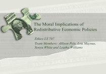 The Moral Implications of Redistributive Economic Policies Ethics LS 707 Team Members: Allison Pyle, Lou Maynus, Sonya White and Leatha Williams Key Terminology • Market Economy - An economy that operates by voluntary exchange in a free market and is not planned or controlled by a central authority; a capitalistic economy. • Mix-market Economy- A mixed economy is an economy that includes a variety of private and government control; reflecting characteristics of both capitalism and socialism. – The United States is a mixed marketed economy, because of substantial market regulation, agricultural subsidies, extensive government-funded research and development, Medicare/Medicaid. Present Status of the United States as an Economic System • The United States is a mixed marketed economy, because of: • substantial market regulation, • agricultural subsidies, • extensive government-funded • research and development and • Medicare/Medicaid. Source: Gordon, D. (n.d.). Justice and redistributive taxation: james buchanan versus lugwig von mises. Retrieved from https://mises.org/journals/rae/pdf/rae8_1_5.pdf Key Terminology- Policies of a Mixed Market Economy • Policy – this is a statement of what the government tend to do or not to do, enforce or not enforce in regards to laws, decisions or orders or any combination of the three (examples of policies are constitutional, statutory and regulatory) $ 3 major types of policies: $ Distributive – these policies primarily benefit a small group and is considered a political process because of logrolling and pork-barrel spending that is associated with it. $ Regulatory – governs the conduct of business and market to protect the welfare and interest of the population. $ Redistributive – the transference of resources in terms of wealth, property, various rights or other valued items from one group in the population to another group (i.e. social classes and racial groups). Source: Lending, B. (2001). Four systems of policy, politics and choice by theodore j. lowi. Retrieved from http://filebox.vt.edu/b/blending/vap-lowi-bl.htm Philosophical Underpinning of the United States Mixed Market Approach • Anglo-Saxon Model – Developed in the 1970s… out of Chicago School of Economics • Chicago School of Economic Thought: – Postwar – development – Root in John Maynard Keynes • Macroeconomics are rooted in Keynesian thoughts • Microeconomics are rooted in neoclassical thoughts • Major characteristics: – Low rates of taxation, open financial markets, low labor market protection and collective bargaining • Neoclassical Thoughts: Adam Smith, David Hume and John Stuart Mills – Free Trade: Laissez-faire – Labor vs. Mercantilism Source: Richter, E. (2004). Rhine capitalism, anglo-saxon capitalism and redistribution. Retrieved from https://publish.indymedia.org.uk/uk/servlet/OpenMir?do=getpdf&id=299588&forIE=.pdf Key Understandings: Present Status of Policies $ The United States government imposes taxes at all levels of government in order to finance spending programs intended to benefit citizens. $ The questions for this project regarding fiscal policies are: $ What is the cost verses the benefits of these fiscal policies? $ How are the cost and benefits of these fiscal policies distributed across social classes, age groups and racial classes? $ How much do people pay in taxes verses how much is spent on them by the government? Source: Prante, G. and Hodge, S. (2013). The distribution of tax and spending policies in the united states. Retrieved from http://taxfoundation.org/article/distribution-tax-and-spending-policies-united-states Present Status of Fiscal Policies Distribution vs. Redistribution 2012: Collected $4.2 Trillion, Spent $5.5 Trillion for a Deficit of $1.3 Trillion The chart is illustrating fiscal policy by income cohort and government levels Source: Prante, G. and Hodge, S. (2013). The distribution of tax and spending policies in the united states. Retrieved from http://taxfoundation.org/article/distribution-tax-and-spending-policies-united-states Spending Ratios by Income Cohort Pre/post-Redistribution Status of Government Redistribution Major Theorists What do they say about redistribution of wealth? John Rawls Adam Smith Immanuel Kant Ayn Rand Friedrich Nietzsche John Rawls' Method (Stanford, 2008) Original Position Veil of Ignorance Choosing principles that will govern the world All generations have the same rights to resources, future as well as present. Building a Better America One Wealth Quintile at a Time Harvard Business School Study – followed Rawls Surveyed to answer two questions – •Is there consensus among Americans? •Preferences of “regular Americans” John Rawls, 1971 Adam Smith Capitalism’s Founding Father “The great object of the political economy of every country is to increase the riches and power of that country.” Smith also argued that capital for the production and distribution of wealth could work most effectively in the absence of government interference. Such a laissez-faire—that is, “leave alone” or “allow to be”—policy (a term popularized by Wealth of Nations) would, in his opinion, encourage the most efficient operation of private and commercial enterprises. He was not against government involvement in public projects too large for private investment, but rather objected to its meddling in the market mechanism. Immanuel Kant Kant would say redistribution is immoral because the maxim on which it is based could not be universally applied without running into the law of non-contradiction. The welfare state is immoral also because it allows the recipient to make demands on the taxpayer with out providing the taxpayer with an equivalent value. Redistribution is immoral, more generally, because it allows one person to treat another as a means to the first person’s ends. Ayn Rand: Queen of the Universe Rand believed that a government that taxed billionaires