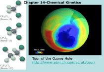 Chapter 14-Chemical Kinetics Tour of the Ozone Hole http://www.atm.ch.cam.ac.uk/tour/ 16 September INTERNATIONAL DAY FOR THE PRESERVATION OF THE OZONE LAYER The Ozone Hole of 2008 is larger than in 2007 Geneva, 16 September 2008 (WMO) - “After decades of chemical attack, it may take another 50 years or so for the ozone layer to recover fully. As the Montreal Protocol has taught us, when we degrade our environment too far, nursing it back to health tends to be a long journey, not a quick fix”, said Ban Ki-moon, Secretary-General of the United Nations, on the occasion of the International Day for the Preservation of Ozone Layer today. According to the World Meteorological Organization (WMO), the 2008 Antarctic ozone hole will be larger than the one of 2007. The observed changes in the stratosphere could delay the expected recovery of the ozone layer. It is therefore vital that all Member States with stratospheric measurement programmes continue to support and enhance these measurements. O3 concentration is reported in Dobson Units (DU) 1DU =2.69E15 O3 molecules/cm2 In September, 2006 the largest ozone hole ever was observed. Temperature inversions and wind direction changes dramatically influence air quality in cities like Salt Lake… Photo-chemical Smog NO(g) + O3(g) → NO2(g) + O2(g) In 1998, a total of 24.5 megatons of nitrogen oxide (NOx) compounds were released to the atmosphere. NOx compound are produced primarily in the combustion of hydrocarbons N2(g) + O2(g) → 2 NO(g) DH° = + 180.6 kJ 2 NO(g) + O2(g) → 2 NO2(g) DH° = - 114.2 kJ NO2(g) + hn → NO(g) + O(g) photochemical O2(g) + O(g) → O3(g) Ozone production Chemical Kinetics looks at both the chemical mechanism as well as the rate at which reactions occur. MECHANISM - how reactants combine to form products. This includes the order that bonds are broken and formed and the possible production of any intermediates. REACTION RATE - a measure of how fast a reaction occurs. This is measured by monitoring the decrease in concentration of the reactants and/or the increase in the concentration of the products. Conditions of temperature, concentration or pressure, the presence of catalyst, etc. that affect the reaction rate may also be specified. Chemical Reactions usually involve molecular collisions that result in bonds being broken or made. Both of these reactions are bimolecular…i.e. two molecules collide in order for the reaction to occur. CONDITIONS FOR BIMOLECULAR AND HIGHER REACTIONS: 1. Two Or Molecules Must Collide. 2. The Colliding Molecules Must Be In The Proper Orientation. 3. The Colliding Molecules Must Have Enough Energy to React. The Lewis structure of NO2 indicates that the nitrogen atom has an unpaired electron. Two NO2 molecules combine by using their unpaired electrons to form an N-N bond. Chemical Reaction Mechanism In the reverse of the previous reaction, a unimolecular elementary reaction may involve bond breakage. If an N2O4 molecule possesses enough energy (from heat or light), molecular vibrations can break the N-N bond to produce two NO2 molecules. When 3 molecules collide to form chemical product the reaction mechanism would be called ter-molecular. The reaction between O3 and NO is believed to occur by a mechanism that consists of the single bimolecular step illustrated here in a molecular view. A chemical reaction rate is the change in concentration of a reactant or product during a particular time interval for the reaction N2(g) + O2(g) → 2 NO(g) N2(g) + O2(g) → 2 NO(g) Reaction Rate Tutorial »PC version Learn to calculate the average and instantaneous rate from the rate expression and concentration vs. time data. Includes practice exercises. • (a) To calculate the average rate of reaction, determine how many moles are consumed during the time interval and divide by the time: • Dn = (0.25 mol/L) – (0.50 mol/L) = – 0.25 mol/L; • Rate = M/s = 0.25 M/30. s = 8.33E-3 • Round to two significant figures: Rate = 8.3E-3 M/s • NOTE UNITS of REACTION RATES • (b) The rate for any particular reagent is the coefficient for that reagent times the rate of reaction: Rate(NH3) = (2/3)(8.3-3 M/s) = 5.6 x 10-3 M/s • (c) The concentration of any particular reagent is its initial concentration minus the change during the time interval: • Change = (Coeff)(Rate)(time) = –(1/3)(8.3E-3M/s)(30 s) = –8.3 x 10-2 M • Concentration = (1.25 M) – (0.083 M) = 1.17 M Problem An engineer is studying the rate of the Haber synthesis: N2(g) + 3 H2(g) → 2 NH3(g) Starting with a closed reactor containing 1.25 mol/L of N2 and 0.5 mol/L of H2, the engineer find that the H2 concentration has fallen to 0.25 M after 30 seconds. (a) What is the average rate of reaction over this time. (b) What is the ave. rate of production of NH3. (c) What is the N2 concentration after 30s? (a) What is the average rate of reaction over this time. (b) What is the ave. rate of production of NH3. (c) What is the N2 concentration after 30s? 2 NO2 → 2 NO + O2 A plot of [NO2], [O2], and [NO] as a function of time (seconds) for the decomposition reaction of NO2. The concentration data are shown in the table. Reaction Rate for NO2 Decomposition 0.0012 Conc (mol/L) 0.001 0.0008 Initial Rate 0.0006 Instantaneous Rate 0.0004 Average Rate 0.0002 0 0 50 100 150 Time (s) 200 250 300 Instantaneous Rates The rate at t=0 is the instantaneous initial rate. This is the most common way of reporting rates in the laboratory RATE TYPES 1. INSTANTANEOUS RATE - the rate at a particular point in time during the reaction. The instantaneous rate is the slope of a tangent at any point in time along the curve. 2. INITIAL RATE - the instantaneous rate at t = 0. This is often the rate used in a discussion of the kinetics of a reaction. 3. AVERAGE RATE - the rate averaged over a particular time interval. The average rate determined by D[conc]/Dt under estimates the true average rate, (D[conc]/n)/ Dt, because the rate varies over time. Instantaneous R