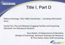 Title I, Part D Rebecca Derenge, Title I N&D Coordinator …including information from: Family Ties: The Link Between Engaging Families and Improving Education for Delinquent Students Gary Rutkin, US Department of Education, Mindee O’Cummings, American Institutes for Research, & Trina Osher, Osher-Huff Consulting, Is This the Education System We Want for Our Youth? Title I, Part D Subpart 1 – SA = State Agency Subpart II – LEA = Local Education Agency Keep in mind: It’s about being “kids” first—youth who need special help to do what their siblings and friends do naturally. Family Driven and Youth Guided Title I, Part D: Goals and Funding The goals of Title I, Part D, programs are to: – Improve educational services for these children so they have the opportunity to meet challenging state academic content and achievement standards – Provide them with services to transition successfully from institutionalization to further schooling or employment Title I, Part D: Goals and Funding The goals of Title I, Part D, programs are to: – Prevent at-risk youth from dropping out of school – Provide dropouts and children and youth returning from correctional facilities with a support system to ensure their continued education The Challenge of Education in Correctional Environments Why Is NDTAC Important? • Poor outcomes for youth who are N & D • Lack of services and supports for youth who are N &D • Challenges to monitoring N & D program outcomes • Challenges to continuous improvement in N & D programs Will This Fish Thrive? What is the the water? condition of What is the fish’s capacity to live in this kind of water? What happens when something changes? Can we manage the system for better outcomes? NDTAC's Mission The overarching mission of NDTAC is to improve educational programming for youth who are neglected and delinquent. Legislation requires NDTAC to: – Develop a uniform evaluation model for State Education Agency (SEA) Title I, Part D – Provide technical assistance (TA) to states to increase their capacity for data collection and their ability to use those data to improve educational programming for N/D youth – Serve as a facilitator between different organizations, agencies, and interest groups that work with youth in facilities for neglected and delinquent youth Title I, Part D: Requirements State agencies and districts that receive the funds are required to: – Meet the educational needs of neglected, delinquent, and at-risk children and youth, and assist in the transition of these students from correctional facilities to locally operated programs – Ensure that these students have the same opportunities to achieve as if they were in local schools in the state – Evaluate the program and disaggregate data on participation by gender, race, ethnicity, and age, not less than once every 3 years Title I, Part A AFTER THE FOCUS ON AT-RISK STUDENTS IN READING AND MATHEMATICS……. WHAT IS A MAJOR COMPONENT OF TITLE I, PART A? What Is Family Involvement? The term “parental involvement” means the participation of parents in regular, two-way, and meaningful communication involving student academic learning and other school activities, including ensuring— – That parents play an integral role in assisting their child’s learning; – That parents are encouraged to be actively involved in their child’s education at school; – That parents are full partners in their child’s education and are included, as appropriate, in decisionmaking and on advisory committees to assist in the education of their child. No Child Left Behind, Sec. 1902, Definitions What Youth Say About Involving Their Families • “My mom and I agreed on everything, and that was one of the biggest factors in getting through my treatment.” • “Family support is a strong issue, and they have to be involved in the treatment.” • “There should be some information for the parents to encourage them to want to be involved.” • “If the child gives up, the parent or support needs to want it for them. It’s sad to see the parent give up.” Blamed and Ashamed: The Treatment Experiences of Youth With Co-Occurring Substance Abuse and Mental Health Disorders and Their Families. Federation of Families for Children’s Mental Health Who Has Responsibility for Family Involvement? • Families, administrators, school staff, students, and, in many cases, the courts. • What is the educational administrator’s role? – Administrators are usually responsible for implementing policies that make the facility accessible to and hospitable for families. – Educational leaders should ensure that students have access to their families and that families have access to their children. • What should families do? – Get involved. Don’t wait to be asked. Offer to help the school. Why Be Concerned with Conditions for Learning and Family Involvement? Neglected, delinquent, and at-risk students are particularly susceptible to: – Low level of teacher support; – Negative peer relationships; – Chaotic and reactive environments; – Poor instructional and behavioral practices; and – Family-school conflict or disconnect. Family efficacy and trust are related to positive outcomes. Families: – Are forever; – Often know students’ strengths and needs; – May have other critical information; and – Are necessary to successful transitions. How Do We Make Practice Family-Driven? • A change in vocabulary is not enough to transform practice. • Communities, agencies, providers, and families need training, technical assistance, and ongoing support to make the paradigm shift. • State and national policies must encourage, support, and sustain: – The conditions that are necessary for it to happen; and – The capacities that must exist for it to happen. • A systemic approach to improving conditions and capacities Factors to Consider in Working with Families • Geography, transportatio