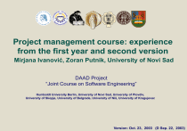 Project management course: experience from the first year and second version Mirjana Ivanović, Zoran Putnik, University of Novi Sad DAAD Project “Joint Course on Software Engineering” Humboldt University Berlin, University of Novi Sad, University of Plovdiv, University of Skopje, University of Belgrade, University of Niš, University of Kragujevac Version: Oct. 23, 2003 (D Sep. 22, 2003) SPM – Modification and improvement 2 Weeks (January 2006, DAAD support) Prof. Klaus Bothe, Institut für Informatik, HumboldtUniversität zu Berlin Modification and improvements of existing material (presentations) Additional sources • Internet sources • Books - T. DeMarco, T. Lister, Waltzing with Bears, Managing Risk on Software Projects, Dorset House Publishing, 1998, (for additional, further topic) - P. Martin, K. Tate, Getting started in Project Management, John Wiley & Sons, • Prof. Dr. Holger Schlingloff slides (Humboldt University, mostly for HR topics) DAAD project „Joint Course on Software Engineering“ © 2 Course Organization IV year students of Business Informatics, 14 students + significant number of voluntaries – concluded that course could be useful for them based on experience of previous generation of students VIII semester, 2 hrs lecture, 1 hr exercises Exam and final mark: • • • • 1/5 of points obtained by regular class attendance Practical assignment in MS Project Continual assessment (3 times during semester) Questionnaire of 10-20 different kinds of questions (multiplechoice, short answers, …) • Final questionnaire (improve results obtained during semester, for those who missed some of questionnaires) DAAD project „Joint Course on Software Engineering“ © 3 Content of Course Lectures Introduction + general overview of PMBOK (117 slides – now 116+74) IT management (59 +132) – avoided this year, a lot of overlapping subjects with other topics CMM and process improvement (51 – now 56) Cost estimation and COCOMO (71 – now 84) Software measurement and metrics (51 – now 55) Planning (77) Using tools - Microsoft project (65, Exercise) Ethical issues (87 – now 90, + Exercise) NEW - Human resources and management (students’ opinion is that part is extremely interesting and useful) DAAD project „Joint Course on Software Engineering“ © 4 SPM - Introduction Essential project properties Classifications of projects What is software, management Tasks of management, Why projects fail Activities of project management Real world example Project Management Body Of Knowledge, general overview DAAD project „Joint Course on Software Engineering“ © 5 Content of Course Lectures Introduction + general overview of PMBOK (117 slides – now 116+74) IT management (59 +132) – avoided this year, a lot of overlapping subjects with other topics CMM and process improvement (51 – now 56) Cost estimation and COCOMO (71 – now 84) Software measurement and metrics (51 – now 55) Planning (77) Using tools - Microsoft project (65, Exercise) Ethical issues (87 – now 90, + Exercise) NEW - Human resources and management DAAD project „Joint Course on Software Engineering“ © 6 SPM – CMM and process improvement Software Process, Improvement, Process Improvement Frameworks Quagmire Maturity Models, Improvement levels, Level Requirements CMM Integration and benefits DAAD project „Joint Course on Software Engineering“ © 7 Content of Course Lectures Introduction + general overview of PMBOK (117 slides – now 116+74) IT management (59 +132) – avoided this year, a lot of overlapping subjects with other topics CMM and process improvement (51 – now 56) Cost estimation and COCOMO (71 – now 84) Software measurement and metrics (51 – now 55) Planning (77) Using tools - Microsoft project (65, Exercise) Ethical issues (87 – now 90, + Exercise) NEW - Human resources and management DAAD project „Joint Course on Software Engineering“ © 8 SPM – Cost estimation and COCOMO Software cost estimation, general information and some techniques, problems Quality and productivity COCOMO and COCOMO II model DAAD project „Joint Course on Software Engineering“ © 9 Content of Course Lectures Introduction + general overview of PMBOK (117 slides – now 116+74) IT management (59 +132) – avoided this year, a lot of overlapping subjects with other topics CMM and process improvement (51 – now 56) Cost estimation and COCOMO (71 – now 84) Software measurement and metrics (51 – now 55) Planning (77) Using tools - Microsoft project (65, Exercise) Ethical issues (87 – now 90, + Exercise) NEW - Human resources and management DAAD project „Joint Course on Software Engineering“ © 10 SPM – Software measurement and metrics Software Measurement, Classification Project Metrics, Typical Metrics Defects, Removal Efficiency Software Metrics Classification Personnel Metrics Hardware Metrics DAAD project „Joint Course on Software Engineering“ © 11 Content of Course Lectures Introduction + general overview of PMBOK (117 slides – now 116+74) IT management (59 +132) – avoided this year, a lot of overlapping subjects with other topics CMM and process improvement (51 – now 56) Cost estimation and COCOMO (71 – now 84) Software measurement and metrics (51 – now 55) Planning (77) Using tools - Microsoft project (65, Exercise) Ethical issues (87 – now 90, + Exercise) NEW - Human resources and management DAAD project „Joint Course on Software Engineering“ © 12 SPM – Planning Kinds of planning (Time, Capacity, Cost) Net-planning (rules, steps, activity lists, critical paths) Management of big software projects, PERT Technique, MPM: Metra-Potential-Method Gantt chart Tools and algorithms DAAD project „Joint Course on Software Engineering“ © 13 Content of Course Lectures Introduction + general overview of PMBOK (117 slides – now 116+74) IT management (59 +132) – avoided this year, a lot of overlapping subjects with other topics CMM and proces