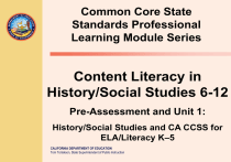 Common Core State Standards Professional Learning Module Series Content Literacy in History/Social Studies 6-12 Pre-Assessment and Unit 1: History/Social Studies and CA CCSS for ELA/Literacy K–5 CALIFORNIA DEPARTMENT OF EDUCATION Tom Torlakson, State Superintendent of Public Instruction Welcome to the Series Common Core State Standards (CCSS) Professional Learning Modules Available on the Brokers of Expertise Web Site at www.myboe.org Welcome Message Lupita Alcala, Deputy Superintendent Instruction and Learning Support Branch California Department of Education (CDE) http://myboe.org/portal/default/Group/Viewer/GroupView?action=2&gid=2996 2 | California Department of Education Module Overview Overarching Module Goals • Understand the intent and organization of the CA CCSS for ELA/Literacy and how they specifically relate to history/social studies • Understand how building literacy in history/social studies improves learning of the content and helps prepare students for college and career • Learn techniques for implementing the CA CCSS for ELA/Literacy in the main disciplines of history/social studies: history, civics and government, economics, and geography 3 | California Department of Education Module Unit Outline: • Unit 1: Introduction to Content Literacy in History/Social Studies 6–12 • Unit 2: Close Reading and the CA CCSS in History/Social Studies • Unit 3: CA CCSS Implications for Civics and Government, Geography, and Economics 4 | California Department of Education Metacognitive Journal Throughout this module you will be asked to predict, reflect, and synthesize your ideas through reflection questions. As you address each question, you may want to create your own journal to record and collect your thoughts. 5 | California Department of Education What do you know? Pre-Assessment Assess your knowledge of Content Literacy in History/Social Studies prior to beginning the module: • Complete the “Pre-Assessment” • Work independently, without discussion or assistance form others 6 | California Department of Education Unit 1: Learning Objectives • Understand the relationship among the CA CCSS for ELA/Literacy and history/social studies instruction. • Examine the organization and structure of the CA CCSS for ELA/Literacy and the College and Career Readiness Anchor Standards and how these standards support 21st century learning. • Explore the Reading Standards for Literacy in History/Social Studies 6–12. • Explore the difference between primary and secondary sources. • Examine text complexity in history/social studies content-area reading. 7 | California Department of Education The CCSS and History/Social Studies Reading is critical to building knowledge in history/social studies as well as in science and technical subjects. College and career ready reading in these fields requires an appreciation of the norms and conventions of each discipline, such as the kinds of evidence used in history and science; an understanding of domain-specific words and phrases; an attention to precise details; and the capacity to evaluate intricate arguments, synthesize complex information, and follow detailed descriptions of events and concepts. In history/social studies, for example, students need to be able to analyze, evaluate, and differentiate primary and secondary sources…. Students must be able to read complex informational texts in these fields with independence and confidence because the vast majority of reading in college and workforce training programs will be sophisticated nonfiction. It is important to note that these Reading standards are meant to complement the specific content demands of the disciplines, not replace them.“ CA CCSS for ELA/Literacy, p.74 8 | California Department of Education Literacy in Content Areas Watch “Literacy in Other Disciplines” • http://www.myboe.org/portal/default/Content/V iewer/Content?action=2&scId=508656&sciId= 16200 • Reflect and Discuss: – According to David Coleman, why is it important to develop literacy in history/social studies? 9 | California Department of Education History/Social Studies and 21st Century Skills • “The Partnership for 21st Century Skills is a national organization that advocates for 21st century readiness for every student. As the United States continues to compete in a global economy that demands innovation, P21 and its members provide tools and resources to help the U.S. education system keep up by fusing the 3Rs and 4Cs (Critical thinking and problem solving, Communication, Collaboration, and Creativity and innovation)." Partnership for 21st Century Skills 2013 10 | California Department of Education 21st Century Skills in Action Watch: “21st Century Skills in Action: Critical Thinking, Creative Thinking, and Problem Solving” • http://myboe.org/portal/default/Content/Viewer/Content?action= 2&scId=508656&sciId=16098 Social Studies 21st Century Skills Map: • http://www.p21.org/storage/documents/ss_map_11_12_08.pdf Reflect and Discuss: • What is one instructional practice you can use to build 21st Century Skills? 11 | California Department of Education The Common Core Shifts for ELA/Literacy Common Core Shifts for ELA/Literacy Shift 1: Building knowledge through content-rich nonfiction Students read a balance of informational and literary texts, moving from a 50/50 balance in K-5 to increasing emphasis on literary nonfiction (across content areas) in grades 6-12. Shift 2: Reading, writing and speaking grounded in evidence from text – both literary and informational Writing from sources rather than relying solely on prior knowledge and experience. For example, using evidence from texts to present careful analyses, well-defended claims, and clear information. Shift 3: Regular practice with complex text and academic language Building upon a “staircase of text complexity” to prepare students for the demands of college- and career-level reading; focus on academic vocabulary a