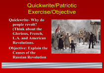 Quickwrite/Patriotic Exercise/Objective Quickwrite- Why do people revolt? (Think about the Glorious, French, L.A. and American Revolutions. Objective: Explain the Causes of the Russian Revolution Extra Credit Could your grade use a boost? Are you a kinesthetic learner? Can you dance? If you answered yes to the questions above, then consider this! Russian Revolution People tired of the extravagance of the Czars While living in squalor Causes of the Russian Revolution World War I Domestic (at home) issues INVOLVEMENT IN WWI Russia had entered WWI unwillingly Czar takes direct command of army (leaves the country in his wife’s hands) Huge casualties, deserters, and issues back home force Russia out Treaty of Brest-Litovsk. Nicholas blamed for the war AND the issues at home… such as: Issues at home Failure to modernize left millions in serfdom. Food shortages: – High inflation meant people couldn’t afford food. – Lack of transportation (trains) Industrial Revolution Issues (i.e. low wages, unsafe conditions, etc) Lower class suffering! Lack of any representation – monarchy Many inspired by Socialist ideas of Karl Marx (Russian Bolsheviks) Review Turn to a partner and explain which of the issues at home you think was the most important. You have two minutes to share. “It is a job I have feared all my life.” Nicholas Romanov Last of the Romanovs Reluctant czar Family man (wife - grand daughter of Queen Victoria) First job of royal family – have a male heir. Successful? They finally have a boy but he is afflicted with hemophilia Quickwrite Quickwrite- What were the causes of the Russian Revolution? Objective- What are the causes of the Russian Revolution (Problems at homeRasputin and March Rev.) Rasputin- The Holy Healer A healer is hired to cure the boy. Tsarina Alexandra is ruling on the advice of Rasputin while Nicholas is at war. Russians question his intent. – Although able to soothe the heir, – Wild behavior and his influence with the czarina will lead to his removal – Many feel that his death would end some of Russia’s problems. But killing him would not be easy!!! There lived a certain man in Russia long ago (Spoken:) He was big and strong, in his eyes a flaming But when his drinking and lusting and his hunger glow for power became known to more and more Most people looked at him with terror and with people, fear the demands to do something about this But to Moscow chicks he was such a lovely outrageous dear man became louder and louder. He could preach the bible like a preacher "This man's just got to go!" declared his enemies Full of ecstasy and fire But the ladies begged "Don't you try to do it, But he also was the kind of teacher please" Women would desire RA RA RASPUTIN Lover of the Russian queen There was a cat that really was gone RA RA RASPUTIN Russia's greatest love machine It was a shame how he carried on He ruled the Russian land and never mind the czar But the kasachok he danced really wunderbar In all affairs of state he was the man to please But he was real great when he had a girl to squeeze For the queen he was no wheeler dealer Though she'd heard the things he'd done She believed he was a holy healer Who would heal her son No doubt this Rasputin had lots of hidden charms Though he was a brute they just fell into his arms Then one night some men of higher standing Set a trap, they're not to blame "Come to visit us" they kept demanding And he really came RA RA RASPUTIN Lover of the Russian queen They put some poison into his wine RA RA RASPUTIN Russia's greatest love machine He drank it all and he said "I feel fine" RA RA RASPUTIN Lover of the Russian queen They didn't quit, they wanted his head RA RA RASPUTIN Russia's greatest love machine And so they shot him till he was dead (Spoken:) Oh, those Russians... Czar Abdicates Czar N. returns and is forced to step down. A temporary democratic government (the Duma) is put in place. Under house arrest Monarchy Absolutism Provisional democratic 1st Revolution Radical Bolsheviks Liberal Moderate Duma Conservative Reactionary Czar Provisional Govt - Duma Govt chooses to CONTINUE in WWI! – More dead soldiers. – No changes for the common people (no food, land, etc) Although Democratic, still much civil unrest. What could/should Russia do? Turn to a different partner than last time, and explain what the Russian options might be. Quickwrite Why was Rasputin important to the Russian Revolution? Today’s Objective: What were the causes and course of the Russian Revolution (November Rev. and Lenin). Rise of the Bolsheviks Means “Majority” Russian Socialist labor party Opponents of “nation of Russia” as well as the Orthodox church. Wanted a Socialist nation run by workers and soldiers, NOT an assembly. IT’S A COUP- Trotsky’s “red army” revolts, ending the DUMA. – Duma doesn’t fightBLOODLESS revolution Lenin seized power with Trotsky and Josef Stalin by his side. (NEW PLAYERS) November Revolution or was it October Bolsheviks- Lenin, Trotsky, Stalin First 2 acts: 1. They end Russian involvement in WWI. 2. Give peasants land. “private ownership shall be abolished forever”. Monarchy Communist Absolutism Totalitarian dictatorship 2nd Revolution Provisional democratic 1st Revolution Radical Bolsheviks Liberal Moderate Duma Conservative Reactionary Czar Vladimir Lenin Russian revolutionary Leader of the Bolshevik party 1st Premier of new Soviet Union Founder of the Communism in Russia. Civil War A war between 2 factions in Russia ensues: – the Reds (Bolsheviks) – the Whites (czar supporters) » West backs Czar-Bad! Lasts for 3 years! Romanovs moved from Moscow in fear that they will be restored to power- house arrest. “We will not surrender” to the Czarist forces. What to do with the family now? The Czar and his family were moved to a place called the “House of Special Purpose” “In view of the fact that your relatives continue their offensive against Soviet Russia, the Presidiu