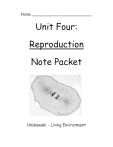 Name __________________________ Unit Four: Reproduction Note Packet Unislawski - Living Environment [CELL GROWTH AND DIVISION] Introduction to Biology Scientific Inquiry Note/Study Packet What is in this pile of papers???? 1. DIN Sign off Sheet: This must be brought to EVERY class. I will sign/stamp it at the start of class IF AND ONLY IF - It is out when I come to your seat - You are working on the DIN I will only come once; no second trips **** A completed sheet, handed in the day of the INDVIDUALTEST will count as a 100 test Grade for the unit *** 2. Cell Reproduction Vocabulary Practice Sheet & Experimental Design and Procedure Vocabulary Sheet, along with a glossary for each. You will have a vocabulary quiz on each sheet Cell Reproduction Vocabulary Quiz Date: _________________ 3. Blank Flash Cards: These or another WRITTEN STUDY TOOL must be completed as part of your quiz grade! 4. Last, but not least, unit notes The Test Dates for this Unit: Open Notes Test: _______________ Closed Notes Test: _______________ (Note Pack To Be Returned on Day of Individual Test For a Test Grade) 2 [CELL GROWTH AND DIVISION] Introduction to Biology 3 [CELL GROWTH AND DIVISION] Introduction to Biology Mitosis New York State Education Department Living Environment Core Curriculum Performance Indicators: 1.1.1c, 1.2.1, 1.2.2a, 1.2.3, 1.2.4, 1.3.1a, 1.3.3, 4.1.2c, 4.1.2g, 4.1.2j, 4.2.1d, 4.2.1k, 4.4.1b, 4.4.1d, 4.5.2a, 4.5.2i, 4.5.2j Upon completion of this unit the student will: recognize that the process of mitosis occurs in non-sex cells. recognize that the process of mitosis produces only one replication and division which produces the same numbers and kinds of chromosomes as in the parent cell. list the major phases and describe the major events in each phase during the process of cell division and mitosis in a typical animal cell. explain the difference between a chromatid, centromere, and a spindle fiber. list two ways the process of mitosis differs between plant and animal cells. list three significant results of mitosis. define the term cancer. explain the difference between asexual reproduction and sexual reproduction. correctly define what is meant by the following methods of asexual reproduction and list examples of each; binary fission, budding, sporulation, regeneration, and vegetative propagation. recognize that asexual reproduction is a form of mitosis and that individuals produced during asexual reproduction are genetically identical to their parent. . Feed the Need to Read and Succeed The following pages reinforce this section of the information: Pages 244 - 252 1. One of the key features that separates life from non-life is: 2. Do all cells have the ability to reproduce? 3. How do unicellular organisms reproduce? 4. What is cell division needed for in multicellular organisms? a. b. c. 4 [CELL GROWTH AND DIVISION] Introduction to Biology 5. Define asexual reproduction – a. The offspring produced are __________________________. b. What are the four benefits of reproducing asexually? i. ii. iii. iv. c. Who can reproduce asexually? 6. Define sexual reproduction – a. What is the benefit of sexual reproduction? b. Who can reproduce sexually? 7. Define genome – 8. DNA molecules in a cell are packaged into _________________________. 5 [CELL GROWTH AND DIVISION] Introduction to Biology Chromosomes 9. What is the purpose of chromosomes? a. Every cell must ____________________________________ before cell division. b. Each new daughter cell gets _____________________________________________. c. Cells of every organism have ____________________________________________. 10. Prokaryotic cells lack _________________. a. Where is their DNA? b. What form does their chromosome take? c. Draw a picture of a prokaryotic cell with chromosome below: 11. In eukaryotic cells, chromosomes are located in the _________________ and are made of ___________________. 12. What is chromatin made of? 13. What are nucleosomes? 14. What are chromosomes made of? 15. What must happen to prepare for cell division? a. Each duplicated chromosome forms ___________________________________. b. What is the centromere? 6 [CELL GROWTH AND DIVISION] Introduction to Biology Phases of the Cell Cycle 16. The cell cycle consists of: a. The Mitotic (M) Phase – b. Interphase – List the three parts of interphase: i. ii. iii. 17. Label this diagram: 18. What happens in the G1 phase? 19. What happens in the S phase? 20. What happens in the G2 phase? 21. Describe the two phases of cell division in eukaryotes: 7 [CELL GROWTH AND DIVISION] Introduction to Biology a. Mitosis – b. Cytokinesis – 22. Define each of these important structures in mitosis: a. Chromatid – b. Centromere – c. Centrioles – d. Spindle – Please draw and describe the Interphase stage of the cell cycle. Make sure to label all structures designated by the instructor REMEMBER; INTERPHASE IS NOT CONSIDERED PART OF MITOSIS Stage of Mitosis What Happens? What Does it Look Like? Interphase 8 [CELL GROWTH AND DIVISION] Stage of Mitosis Introduction to Biology What Happens? What Does it Look Like? Prophase Metaphase Anaphase Telophase 9 [CELL GROWTH AND DIVISION] Introduction to Biology 23. What is cytokinesis? 24. Describe how cytokinesis occurs in animal cells: 25. Why does the process have to be different in plant cells? 26. What forms instead in plant cells? Binary Fission 27. Prokaryotes reproduce by a type of cell division called _________________________. 28. What happens during binary fission? 29. The events of the cell cycle are controlled by a _____________________________________. 30. The control system has specific _________________________ where the cell cycle _______________ until a ______________________ is received. 31. Name the three cell cycle checkpoints: a. b. c. 32. Which checkpoint is the most important? a. What happens if the cell receives a go-ahead signal at this checkpoint? b. What happens if the cell does not receive a go-ahead signal? 1