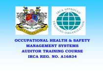 OCCUPATIONAL HEALTH & SAFETY MANAGEMENT SYSTEMS AUDITOR TRAINING COURSE IRCA REG. NO. A16834 1: Introduction 1.1 Background Development • During the Industrial Revolution, technological advances introduced and increased the use of machinery and toxic materials in the workplace. As a result, workers in factories faced health and safety risks that were previously unheard of. Health and safety problems and hazards that workers face include the following: • Poor working conditions • Exposure to toxic materials or chemicals • Long working hours • Work-induced stress • Excessive noise levels • Risks to life, eyes, and limb while working with machinery • In 1970, (OSHA) was established as a comprehensive occupational safety and health law “to assure so far as possible for every working man and woman in the nation safe and healthful working conditions and to preserve human resources [1].” • In addition, OHSAS 18001 specification and the accompanying OHSAS 18002 guidelines have been developed • OH&S management system to enable organization to control its OH&S risks and improve its performance. 1.2 Concepts of Occupational Health • Defined as "that science and art devoted to the anticipation, recognition, evaluation, and control of those environmental factors or stresses arising in or from the workplace, which may cause sickness, impaired health and well-being, or significant discomfort among workers or among the citizens of the community."[i] 1.3 Concepts of Safety Engineering • Interdisciplinary in nature & ought to be applied early in system development. • Control monetary and physical loses • Safety costs should be justified like other forces competing for limited organizational resources. • Safety should be considered a long-term investment. • Figure 1.1 shows that its application requires integration with many other functions Operations Engineering Environmental Security Medical Training SAFETY Industrial Hygiene Legal Test & Evaluation Transportation Information Systems Facilities Figure 1.1: Safety Interactions 1.4 Philosophy Supporting OH&S Management System Standards • safety denotes concern for physical injuries that might be experienced by the worker • Health denotes concern for physiological injuries • welfare refers to concern for a range of psychological conditions. • this type of approach promotes a holistic appreciation of a worker’s well being as well as a comprehensive understanding of the contribution of workplace conditions to it. The basic principles of a holistic approach to workplace health and safety are thus: • The health and safety of a worker is influenced by conditions of the workplace and by non- work related factors that can be potentiated by the workplace. • Workplace effects on human health and safety are not restricted to only the on- site workplace or the worker Environment Products & Processes Attributes Environmental Quality Workplace Raw Materials & Energy Labor Processing Environmental Health & Safety Community Occupational Health & Safety Groups Persons Institutions Product Worker Waste Occupational Health & Safety Occupational Health & Safety Figure 1.2: Holistic Overview of the Workplace, Environmental Quality & Human Community[i] 1.5 Modern OH&S Legislation • At both national and international levels, the modern corporation is perceived as having both a moral and a legal responsibility to protect its employees from: – Workplace sources of injury and; – Workplace insults to a worker’s pre- existing debilitation[i]. • By ensuring proper responsibilities, common problems such as those stated below can be avoided. – Lack of sufficient authority to implement safety– Isolation from higher decision makers who must bear the potential liability associated with workplace injury – Isolation from production- level personnel have primary responsibility for production but they play a crucial role in the implementation of an effective safety program. 1.6 Scope of OH&S Management Systems The scope of an OH&S management system, applicable to any organization, includes: • Establishing an OH&S management system to eliminate or minimize risk to employees and other interested parties who may be exposed to OH&S risks associated with its activities; • Implementing, maintaining and continually improving an OH&S management system; • Assuring itself of its conformance with its stated OH&S policy; • Demonstrating such conformance to others; 1.7 Definitions & Terminology 1. 2. 3. 4. 5. 6. The terms and definitions used in the OHSAS 18001 specifications are: Accident Audit Continual Improvement Hazard Hazard identification Incident NOTE: An accident where no ill heath, injury, damage, or other loss is also referred to as a “near miss”. The term “Incident” includes “near-misses”. 7. 8. Interested parties Non-conformance 9. 10. 11. 12. Objectives Occupational health and safety OH&S management system Organization NOTE: For organizations with more than one operating unit, a single operation unit may be defined as an organization. 13. Performance NOTE: Performance measurement includes of OH&S management activities and results. 14. 15. 16. 17. Risk Risk assessment Safety Tolerable risk Chapter 2 Introduction to OH&S Standards & Applications 2.1 Influence of the Working Environment There are various kinds of positive and negative factors in the working environments • Physical demands may refer to manual lifting loads and extended working hours. • For mental demand, it appears to be dependent on the level of mental work pressure and the experience of the worker involved. • Use of ear protection will be in order as excessive noise levels (>85 to 90 dB) can cause hearing loss. • Proper illumination is necessary to avoid having workers headaches and fatigue as a result of eyestrain. • Working temperature can cause great discomfort if it is too high or too low. mental and emotional factors to consider