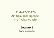CS4442/9542b Artificial Intelligence II Prof. Olga Veksler Lecture 1 Course Introduction 1 Outline • Syllabus • Course Introduction • Machine Learning (ML) • Natural Language Processing (NLP) • Computer Vision (CV) 2 Syllabus • Formal Prerequisites • AI 1 (CS 346) • not really necessary • CS2210 • First-year course in Calculus • Some Linear Algebra • Grading • 3 Short (1 hour) quizzes 18% each • Programming assignments (16%, 15%, 15 %) • in Matlab (and maybe C/C++) • I will give a short introduction to Matlab 3 Syllabus • Assignments • may discuss but work must be done individually • We will use an automatic program to check for cheating • Hand in by the midnight on the due date • Submission via WEBCT • Late penalty • 5% one day late • 10% two days late • 15% three days late • 20% four days late • Not accepted after 4 days • Sat and Sun count as 1 day 4 Syllabus • 3 short easy (really) quizzes • 1 hour each • open lecture notes • calculators OK, but no other electronic devices 5 Textbooks • We will not follow this textbook too closely • You should attend lectures, we will cover a lot of material not in the textbook • No required, only recommended books • Useful books: • ML: Duda, Hart, Stork, Pattern Classification, second edition. • NLP: Manning and Schutze, Foundations of Statistical Natural Language Processing • CV: R. Szeliski, Computer Vision: Algorithms and Applications • General AI: Artificial Intelligence: A Modern Approach second edition, S. Russell and P. Norvig 6 Course Intro: What is AI? • Branch of computer science which • is the science of making machines do things that would require intelligence if done by men (Minsky) • is the exciting new effort to make computers think (Haugeland) • is the study of the computations that make it possible to perceive, reason, and act (Winston) • is the study of how to do things which at the moment people do better (Rich & Knight) • “Artificial Intelligence” term was coined in 1956 by John McCarthy at MIT 7 Course Intro • AI is an extensive field of Computer Science • In this course, we offer a brief introduction three sub-fields of AI • Machine Learning • Natural Language processing • Computer Vision 8 What is Machine Learning? • Develop algorithms that allow computers to “learn” • In this course, we use a rather narrow definition of “learning” • Learn to assign an object or an example to one of the several pre-specified categories (a category is usually called a class) • also called Pattern Recognition • Example: tea cup face phone 9 ML Application: Face Detection • Objects – image patches • Classes – “face” and “not face” 10 ML Application: Character Recognition • Objects – images or image patches • Classes – digits 0, 1, …,9 Digit recognition, AT&T labs http://www.research.att.com/~yann/ License plate readers http://en.wikipedia.org/wiki/Automatic_number_plate_recognition 11 Slide Credit: D. Hoiem ML: Application: Medical Image Processing • Objects – pixels • Classes – different tissue types, stroma, lument, etc. 12 ML Application: speech understanding • Objects – acoustic signals • Classes – phonemes re-kig-'ni-sh&n 13 ML Application: Loan Approvals • Objects – people • Classes – “approve”, “deny” income debt married age John Smith 200,000 0 yes 80 Peter White 60,000 no 30 Ann Clark 100,000 10,000 yes 40 Susan Ho 0 25 1,000 20,000 no approve deny 14 What is Natural Language Processing? • Develop computers that can understand human (“natural”) language and speak human language • Computers would be much easier to use with Natural Language Interface • Can we “teach” them to understand human language? • Many approaches to NLP are based on Machine Learning 15 NLP Application: Machine Translation Президент США пока не принял решение, следует ли расширить американское военное присутствие в Ираке. Russian news Babel fish The President OF THE USA thus far did not accept the solution, should be enlarged American military presence in Iraq. does not work so well for poetry А вы, мои друзья последнего призыва! Чтоб вас оплакивать, мне жизнь сохранена. Над вашей памятью не стыть плакучей ивой, А крикнуть на весь мир все ваши имена! Да что там имена! Ведь все равно — вы с нами!.. Все на колени, все! Багряный хлынул свет! И ленинградцы вновь идут сквозь дым рядами — Живые с мертвыми: для славы мертвых нет. Russian poetry Babel fish But you, my friends of last call! In order you to mourn, to me life is preserved. Above your memory not to cool by weeping willow, A to shout to entire peace all your names! Yes that there names! Indeed nevertheless - you with us!.. All to the elbows, everything! Crimson gushed out light! And residents of Leningrad again go through the smoke by numbers - living with the corpses: there are no corpses for the glory. NLP Application: Speech Synthesis • Text to speech • http://www.cepstral.com/demos/ "My latest project is to learn how to better project my voice" speech 17 disambiguates parts of speech NLP Application: Automatic Summarization Three Bears Story Once upon a time there were three Bears, who lived together in a house of their own, in a wood. One of them was a Little Wee Bear, and one was a Middle-sized Bear, and the other was a Great Big Bear. One day, after they had made the porridge for their breakfast, and poured it into their porridge-bowls, they walked out into the wood while the porridge was cooling, that they might not burn their mouths by beginning too soon, for they w