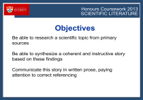 Honours Coursework 2013 2011 SCIENTIFIC LITERATURE Objectives Be able to research a scientific topic from primary sources Be able to synthesize a coherent and instructive story based on these findings Communicate this story in written prose, paying attention to correct referencing Honours Coursework 2013 2011 SCIENTIFIC LITERATURE Assessment 20% - literature web, Fri 22nd Feb 10% - first paragraph, Fri 1st March 70% - final report, Fri 22nd March 2500 words maximum Honours Coursework 2013 2011 SCIENTIFIC LITERATURE Lecture Schedule 1. Introduction 5. First sentence* 2. The key paper Literature web 3. Writing a paper 6. First paragraph* 7. Last paragraph* 4. Literature Reviews * class-led discussion Honours Coursework 2013 2011 SCIENTIFIC LITERATURE Literature Web Start with your Science paper • identify the key papers leading up to it • Identify the key papers leading from it Honours Coursework 2013 2011 SCIENTIFIC LITERATURE Literature Web Example: Constraints on Melt Movement Beneath the East Pacific Rise From 230Th-238U Disequilibrium Haibo Zou, Alan Zindler, Yaoling Niu Science 4 January 2002: Vol. 295 no. 5552 pp. 107-110 DOI: 10.1126/science.1064295 Honours Coursework 2013 2011 SCIENTIFIC LITERATURE Key papers leading up to it Experimental technique Idea itself Off axis Volcanism Model Honours Coursework 2013 2011 SCIENTIFIC LITERATURE Key papers leading from it Has only been cited 20 times… (well in 2012 it had) Honours Coursework 2013 2011 SCIENTIFIC LITERATURE Key papers leading from it Has only been cited 20 times… (well in 2012 it had) Honours Coursework 2013 2011 SCIENTIFIC LITERATURE Key papers leading from it Do any stand out? Honours Coursework 2013 2011 SCIENTIFIC LITERATURE Key papers leading from it Check on the standing of the journals Geochemistry & Geophysics Honours Coursework 2013 2011 SCIENTIFIC LITERATURE Check on the standing of the journals Honours Coursework 2013 2011 SCIENTIFIC LITERATURE Literature Web Concept Goldstein et al., Nature, 1994, 367, 157-159 Model Spiegelmann & Earth Planet. Lett., 1993, 118,1-20 Idea Hoffman Earth Planet. Lett., 1998, 90, 297-314 Zou et al. Science 2002, 295, 107-110 Exp technique Scheiner et al. Science 1998, 260, 5367 Honours Coursework 2013 2011 SCIENTIFIC LITERATURE Literature Web Crawford & Webb, Earth Planet. Lett., 2002, 203 117-130. Zou et al. Science 2002, 295, 107-110 Data for specific location Stracke et al., Earth Planet. Lett., 2006, 244, 97-112 Sims et al., Geosc. Geoan. Res. 2008, 32, 65-91 Zou et al., Chem. Geol. 2008, 255, 134-142. Assessment of Method Stand Ref Source Data for specific location Honours Coursework 2013 2011 SCIENTIFIC LITERATURE Searching the Chemical Literature Yale University Science Library Traditional Structure of Chemical Literature Primary Materials- information reported by scientists • Original Articles and Letters / electronic journals • Patents • Technical Reports • Conference Proceedings • Dissertations Honours Coursework 2013 2011 SCIENTIFIC LITERATURE Searching the Chemical Literature Yale University Science Library Traditional Structure of Chemical Literature Secondary Materials- repackaged and better organized information reported by researchers • Review Articles • Abstracts • Bibliographies • Indexes • Dictionaries/Handbooks • Tables/Datasets • Trade Catalogs, Bulletins • Advertisements • Treatises • Chemical Safety Information Honours Coursework 2013 2011 SCIENTIFIC LITERATURE Searching the Chemical Literature Yale University Science Library Traditional Structure of Chemical Literature Tertiary Materials - works designed to teach you how to use primary and secondary works Honours Coursework 2013 2011 SCIENTIFIC LITERATURE Searching the Chemical Literature Yale University Science Library Issues to Consider When Choosing a Reference Tool • Scope - Does the tool cover the type of information you are looking for? • Comprehensiveness - Does the reference tool cover "everything" published in the field or do the editors draw from specific sources? • Chronological coverage - From how far back in time is information gathered? How recently has the reference tool been published? • Access points - How is to tool indexed? What do you have to know before you can use the tool? • Quality - Who compiled the information presented in the reference tool? Did the original information come from reputable sources? Is there a system of fact checking in place? Honours Coursework 2013 2011 SCIENTIFIC LITERATURE Searching the Chemical Literature Yale University Science Library Learning to use a reference tool •Front matter - The first few pages of most print resources contain tips on how to best use the tool, as well as the name of the editor, publisher information, copyright date, scope, comprehensiveness, and chronological coverage of a reference tool. Usually, a labeled sample record and a key to abbreviations is also available in the front matter. •Help systems - Electronic reference tools are usually equipped with help systems. These builtin systems provide information about: • • • truncation implied adjacency protocols for searching the database Honours Coursework 2013 2011 SCIENTIFIC LITERATURE Writing a Paper I will base this on the American Chemical Society Style Guide for preparing camera ready manuscripts “ACS Books: Instructions for Authors” Reproduced with permission. (NB different Journals use different styles and different style sheets – choose one and be consistent) Honours Coursework 2013 2011 SCIENTIFIC LITERATURE Introduction Preparing a “camera ready” manuscript is not an easy task… ACS will not accept your manuscript if • • • • • It is the verbatim reproduction of a prior publication The type is not clear and/or reasonably sized References are called out inappropriately Correct margins are not used Text is wrapped on the left and right sides of artwork Honours Coursework 2013 2011 SCIENTIFIC LITERATURE Gen