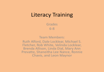 Literacy Training Grades 6-8 Team Members: Ruth Alford, Dale Locklear, Michael S. Fletcher, Rob White, Velinda Locklear, Brenda Allison, Linda Dial, Mary Ann Prevatte, Shaneitha Lee Nance, Ronnie Chavis, and Leon Maynor Definition of Literacy The United Nations Educational, Scientific and Cultural Organization (UNESCO) defines literacy as the "ability to identify, understand, interpret, create, communicate, compute and use printed and written materials associated with varying contexts. Literacy involves a continuum of learning in enabling individuals to achieve their goals, to develop their knowledge and potential, and to participate fully in their community and wider society." “Every Teacher is a Teacher of Reading” • Reading strategies can be addressed in all subject areas. – Social Studies – Science – Physical Education – Math – Etc. 6-8 Data • Goal Summaries – District – School – Teacher • Formative Data – Discovery – STAR Tests – Success Maker – Teacher Assessments (varied) THE BASICS: Text Features http://link2literacy.blogspot.com/2010/01/best-ideas-teaching-textfeatures.html (used as a resource for presentation) Title What is it? A title is the name of a book, essay, article, etc. Purpose: • To hint at what the text might be about. • To give a brief summary of the text content. Table of Contents What is it? The table of Contents is a list of chapters or article titles found at the beginning of the text. Purpose: • To help readers, at a glance, find out about topics or concepts discussed in the book or magazine. Pictures What is it? Pictures are images or graphics often found in writing. Purpose: • To help us VISUALIZE what we are reading about. • To catch readers’ attention and make the text seem more interesting. Caption What is it? A caption is text in smaller print that is found next to a picture inserted in the main body of the text. Purpose: • To give a brief explanation of the picture. Heading “Myths Explain the World” What is it? A heading is the title of a short section within the main body of a text. Purpose: • To give readers clues as to what they will read about next. • To make it easy to find the main ideas/topics within the body of the text. Subheading “Greek Gods” What is it? A subheading is the title of a small section found underneath a heading. Subheadings give clues about what’s coming next. Purpose: • To help organize the text into sections of information that support the main topic. • To make it easy to find important topics within the body of the text. Bold Words What is it? Bold Words are words in the text printed in darker ink; sometimes highlighted. Purpose: • To show readers important words. concepts, or ideas that should be studied or remembered. These words are the key to understanding the main ideas in the text. Rob and Big Rob & Big was an American reality television series that followed the lives of professional skateboarder, Rob Dyrdek, and his best friend and body guard, Christopher "Big Black" Boykin. The Beginnings The show premiered on November 2, 2006 and ended on April 15, 2008. The series was produced by Ruben Fleischer and directed by Mark Jacobs. Footnote What is it? A footnote is an explanatory note inserted at the bottom of the page referring to a specific word or phrase in the text. Episode 1 After moving in, Big Black suggests to Rob that they get a bulldog, to complete the new family. The two fly to Arizona on a private jet to pick up their new little puppy. To welcome their new family member, the guys host a party with a surprise appearance by Three Six Mafia1. 1Three Six Mafia is an Oscar-Award winning American rap group originating from Memphis, Tennessee Purpose: • To give readers extra information they may need to fully understand the word or idea in context. Bullet Points What is it? Bullet Points are graphics that are used to list items or ideas in a text. Purpose: • To break up a lot of text into chunks of important info. • To create lists, summarize key ideas at the end of a chapter, etc. Charts and Tables What are they? • Tables are summaries of facts or data written in columns or rows. • Charts are visual representations of quantities or results. Purpose: • To organize information into a small space and an easy-to-read format. Graphs What is it? Graphs are visual comparisons of data and information in a bar/pie/line format. Purpose: • To help us read facts and figures in a short amount of time. Skateboard Glossary 360: when a skateboarder and his board turns 360 degrees while in the air. Axle: the metal rod that runs through the hangar of a skateboard’s truck. Deck: the flat, long, oval/rectangular, wooden part of the skateboard you stand on. Glossary What is it? A glossary is an alphabetized list of terms and definitions found in the back of the book or at the end of an article. Purpose: • To provide an easy-toaccess reference for important vocabulary. Insert What is it? An insert is a small section of text inserted into the main body of the text. Purpose: • To provide additional information that is not vital to the text, but is supplemental or interesting. Map What is it? A map is a diagrammatic representation of a specific location. Purpose: • To help us visualize where something is taking place. Colored Print What is it? Colored Print is text printed in a color other than black. Purpose: • To make important ideas, interesting facts, or titles/headings stand out. Font Size and Type Changes What is it? A change in the size of the text or the style in which it is written. Purpose: • To hint at important ideas that readers should pay close attention to. Index What is it? An alphabetical list of names and/or topics as well as lists of page numbers on which each item is mentioned. Purpose: • To help readers find all the pages in the text where each subject is discussed. Resources http://www.montgomeryschoolsmd.org/schools/westlandms