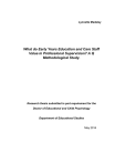 Lynnette Madeley What do Early Years Education and Care Staff Value in Professional Supervision? A Q Methodological Study. Research thesis submitted in part requirement for the Doctor of Educational and Child Psychology Department of Educational Studies May 2014 What do early years education and care staff value in professional supervision? A Q methodological study. Abstract The statutory requirement for staff supervision, as set out in the revised Early Years Foundation Stage (2012), does not stipulate a specific model to be followed. This leaves early years settings with a wide range of theories and models with which to consult. The literature suggests that the term ‘supervision’ can have different meanings for different professional groups. The aim of this study was to gain an understanding of what early years educators and carers would value in their supervision. A research methodology was sought which minimised the potential for researcher bias and maximised the opportunity for early years workers to give their personal view. Q methodology was employed to explore how 30 early years workers ranked statements of potential features of supervision. The Q set of 54 statements was developed through a focus group with early years staff and consultation with supervision literature. The participants were asked to sort statements from ‘most disagree’ (aspect I would least value) to ‘most agree’ (aspect I would value highly). The majority of participants in this study were not receiving supervision at the time of the research. Factor analysis was used to identify viewpoints which were common to a group of participants. In the results section each of the three emerging viewpoints are presented as a Q sort arrangement and also a written description produced by interpreting the factor analysis results using factor arrays and ‘crib sheets’. The emergent viewpoints are discussed along with the implications for early years settings and other professionals supporting early education. The role of the Educational Psychologist in working systemically with early years settings will also be considered in light of the findings. Contents 1. Introduction .................................................................................................................. 1 2.0. Literature Review ........................................................................................................ 5 2.1. Background to Early Years Education and Care ............................................ 5 2.2. Early Intervention and Early Years provisions ................................................ 6 2.3. Challenges Facing Staff Working in Early Years ............................................ 9 2.4.0. Supervision.......................................................................................................... 12 2.4.1. Definitions of Supervision ........................................................................... 13 2.4.2. Models of Supervision .................................................................................. 15 2.4.2 (i) Developmental Models ............................................................................. 15 2.4.2 (ii) Orientation-specific Models of Supervision ...................................... 17 2.4.2 (iii) Integrated Models of Supervision........................................................ 18 2.4.3. Structure of Supervision .............................................................................. 19 2.4.4. Supervision Orientations ............................................................................. 20 2.4.5. Limitations of Supervision .......................................................................... 21 2.4.6. Potential Factors Affecting Views on Supervision ............................... 23 2.5. Conclusion .............................................................................................................. 23 3.0. Methodology ............................................................................................................... 25 3.1. Introduction ............................................................................................................ 25 3.2. My Philosophical Position .................................................................................. 25 3.3. What do I want from a methodology? .............................................................. 26 3.4. Methodologies Considered................................................................................. 27 3.5. Overview of the Stages of a Q Study ............................................................... 28 3.6. A Brief Introduction to Q Methodology ........................................................... 29 3.7. Ontological and Epistemological Assumptions of Q .................................. 30 3.8. Strengths of Q ........................................................................................................ 31 3.9. Limitations of Q ..................................................................................................... 32 3.10. Mediating the limitations of Q.......................................................................... 32 3.11. Ethical considerations ....................................................................................... 33 3.12. Quality criteria...................................................................................................... 34 3.13. Methodology Summary ..................................................................................... 37 Procedures.............................................................................................................. 38 4.0. 4.1. Development of the Concourse and Q set ................................................. 38 4.2. Participants (P Set) ........................................................................................... 39 4.3. Q Sort ...........................................