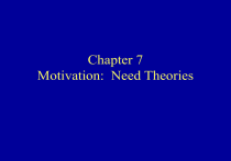 Chapter 7 Motivation: Need Theories Learning Goals • Discuss the role of needs in behavior in organizations • Describe the major need hierarchy theories of motivation • Appreciate that the importance of particular needs varies from person to person Learning Goals (Cont.) • Understand how some needs may be learned • Distinguish between motivator and hygiene factors in a person's environment • Discuss the international and ethical issues in motivation Chapter Overview • Introduction • Overview of Where We are Headed • Murray's Theory of Human Personality: The Concept of Needs • Maslow's Hierarchy of Needs Theory • E.R.G. Theory Chapter Overview (Cont.) • McClelland's Achievement Motivation Theory • Herzberg's Motivator-Hygiene Theory • International Aspects of the Need theories of Motivation • Ethical Issues and the Need Theories of Motivation Introduction • Assumptions of motivation Theories – Behavior has a starting point, a direction, and a stopping point – Focus is on voluntary behavior under the control of the person – Behavior is not random. It has purpose and direction Introduction (Cont.) Motivation defined Motivation is a psychological process that causes the arousal, direction, and persistence of voluntary actions that are goal directed. Introduction (Cont.) Motivation is the psychological process that leads to Choice of behavior that results in Some level of job performance The Motivation-Behavior-Job Performance Sequence Introduction (Cont.) • Why know about motivation? – Help you understand your behavior and the behavior of others – Can help a manager build and manage a “system of motivation.” – Offers conceptual tools for analyzing motivation problems in organizations Overview of Where We are Headed • Need theories (Chapter 7) – – – – – Murray’s Theory of Human Personality Maslow’s Hierarchy of Needs Theory E.R.G. Theory McClelland’s Achievement Motivation Theory Herzberg’s Motivator-Hygiene Theory Overview of Where We are Headed (Cont.) • Cognitive and behavioral theories (Chapter 8) – – – – Expectancy Theory Equity Theory Goal Setting Theory Behavior Modification Murray’s Theory of Human Personality • Assumptions – – – – People can adapt to their changing environment Human behavior is goal directed Internal and external factors affect behavior People learn from interactions with their environment – Preconception of future affect behavior now Murray’s Theory of Human Personality (Cont.) • Needs – Basic to Murray's theory – Hypothetical concept: helps explain observable differences in behavior – “Invisible link” between a stimulus and a person’s reaction to the stimulus Murray’s Theory of Human Personality (Cont.) • Types of needs – Physical needs • Satisfaction of basic physical processes • Need for food, air, water, sex – Psychological needs • Focus on emotional and mental satisfaction • Example: the need for social interaction or to achieve difficult goals Murray’s Theory of Human Personality (Cont.) • Some needs in Murray's theory – n Order: organize and systematically arrange objects; be clean, neat, and tidy – n Achievement: attain difficult goals; perform as well as possible – n Recognition: receive credit for actions; to seek honors and recognition The small n in front of the name of each need is the psychologist’s abbreviation for the word need. See text book Table 7.1 Murray’s Theory of Human Personality (Cont.) • Some needs in Murray's theory (cont.) – n Dominance: influence others; affect the direction of a group – n Deference: respect authority; admire a person with authority – n Autonomy: be independent and not be influenced by others – n Affiliation: associate with others, have friends, and join groups Murray’s Theory of Human Personality (Cont.) • Characteristics of needs – Latent internal characteristics activated by a stimulus – A person tries to behave in a way that satisfies an activated need Strong need for affiliation: Meet someone you like and start talking to the person Murray’s Theory of Human Personality (Cont.) • Characteristics of needs (cont.) – Needs may show rhythmic patterns over time • Manager could satisfy a Need for Dominance in relationships with subordinates • Same manager is subordinate to someone else in the organization • Engages in behavior directed at the Need for Deference Murray’s Theory of Human Personality (Cont.) • Characteristics of needs (Cont.) – Opposite needs and behavior • Need for Dominance in work role, especially a manager or supervisor • Need for Deference in nonwork (family) role Work Nonwork Need for Dominance Need for Deference Murray’s Theory of Human Personality (Cont.) • Characteristics of needs (Cont.) – Multiple needs and behavior • One need is primary; other need serves the primary • Need for Achievement and Need for Affiliation • Example: joining student organizations. Such activities are important for finding a good job Need for Affiliation serves Need for Achievement Murray’s Theory of Human Personality (Cont.) • Implications – Understand own and other’s behavior – Needs vary in importance among people – Directs people’s behavior toward or away from objects – Such knowledge can help managers’ shape a motivation system – Help us understand behavior we see Maslow’s Hierarchy of Needs Theory • Five groups of basic needs • Healthy adults try to satisfy these needs • So basic that they motivate behavior in many cultures • Chronic frustration of needs can lead to psychopathological results Maslow’s Hierarchy of Needs Theory (Cont.) • Physiological needs: basic requirements of the human body; food, water, sleep, sex • Safety needs: desires of a person to be protected from physical and economic harm • Belongingness and love needs (social): desire to give and receive affection; be in the com