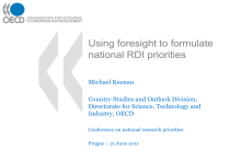 Using foresight to formulate national RDI priorities Michael Keenan Country Studies and Outlook Division, Directorate for Science, Technology and Industry, OECD Conference on national research priorities Prague – 21 June 2011 Some basic definitions to start with . . . • Prioritisation refers to the conscious and deliberate selection of certain activities, actors, policies or policy instruments at the expense of others with an impact on resource allocation • Foresight refers to systematic collective processes of exploring and anticipating the longer term with a view to identifying actions to take today in support of desirable futures • Prioritisation processes involve – Looking backwards to appreciate the evolution of scientific know-how – Understanding current strengths and weaknesses of the research and innovation system – Looking forwards to anticipate and shape future opportunities and challenges What form do RDI priorities take? Structural priorities Research Innovation Thematic priorities Linked S&T areas Issues Priorities at different levels: OECD (1991) proposes three levels: (i) policy (govt) (ii) strategic (research funding agencies) (iii) operational (research performing institutes) In other words, the activity of formulating and implementing S&T priorities tends to be highly decentralised. Why prioritisation? • Competing demands on S&T budgets – ‘internal’ scientific ‘excellence’ criteria alone would seem to be insufficient to limit the number of projects to the resources available. So other ‘external’ criteria – often oriented around ‘relevance’ – need to be employed • In addition, governments now view S&T as key determinants in the development of knowledge economies and these are viewed as requiring strategic steering • Concerns over the so-called innovation gap (particularly in Europe) mean that scientists alone cannot take the decision of which areas are to be pursued. Rather, this decision-making process needs to be opened-up to other actors in innovation processes • Conclusion: we need to instigate a process that will identify strategic S&T priorities, ‘strategic’ in the sense that priorities will contribute towards innovation. Moreover, this process needs to involve a widerange of actors, reflecting the nature of the innovation process. Contributions of research to innovation (1) • The main channels of interaction between research and innovation include the following: – – – – – – – Scientific record Technological development Mobility R&D collaboration Knowledge markets Spin-offs Advice, consultancy and extension • Several different actors are key in the operation of these channels • The ways in which these key actors conduct themselves are influenced by multiple shaping factors • Policies work by modulating these shaping factors and by influencing key actors directly Core Policies Discretionary organisational funding Shaping Factors Competitive R&D project grants Economic Development Support for R&D infrastructures Researchers Economic Specialisation Centres of excellence Research Universities Industrial Ecology Research > Innovation Public Research Institutes Geography Collaborative R&D programmes Scientific Record Scientific Unions Financial Markets Technology platforms Technological Development Technology Transfer Offices Scope and Scale of Public Research Cluster initiatives Mobility Large Domestic Firms R&D Collaboration Large Foreign Firms Public Research Specialisation Knowledge Markets Traditional SMEs Labour Market Regulation University-industry linkage schemes Spin-offs High-tech SMEs Academic Careers PhD studentships Advice, Consultancy and Extension Regulatory Organisations PSR Funding Regimes Post-doctoral fellowships Funding Organisations IPR Regimes Inter-sectoral mobility schemes Policy-Making Organisations Roles and Status of HEIs/PRIs Third Sector Organisations Scientific Community Norms Key Actors Open Innovation Science and technology parks Risk capital measures in support of spin-offs Entrepreneurship training schemes Technology diffusion schemes Examples of key actors, shaping factors and core research policies Innovation vouchers Technology incubators Contributions of research to innovation (2) Shaping factors Research activities Policies Innovation performance Actors All of these components can be subject to prioritisation and/or shape the implementation of priorities Attractiveness UK Foresight Prioritisation Criteria Economic and social needs Opportunities and threats Scientific and technological opportunities Feasibility Panel Strategic analysis Potential to apply (industrial strength) Strengths and weaknesses Scientific and technological strengths Attractiveness vs. Feasibility Matrix UK Technology Strategy Board Priority Criteria The degree to which technologies will have an impact on sectors that are a major UK strength (e.g. pharmaceuticals and aerospace) or have high growth potential; The degree to which a particular technology will have an impact on a number of sectors; Strength of the UK SET base relative to other countries; Potential economic, social, quality of life and environmental benefits and scope for cross-government collaboration (e.g. healthcare, energy); Potential for spillover benefits and whether there is an underpinning market failure; and The degree to which there is scope for effective action by Government or others. The importance of an international perspective • • • • • • Internationalisation of science Position of firms in global value chains Open innovation Global challenges Accessing international knowledge – absorptive capacity International benchmarking to determine relative strengths and weaknesses • International policy learning Assessment criteria and their operationalisation • How to assess whether a given scientific or technical area will further the pursuit of economic goals and social values more / less than any other a