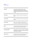 Glossary (See related pages) A-B design A single-subject experimental design in which measurements are repeatedly made until stability is presumably established (baseline), after which treatment is introduced and an appropriate number of measurements are made. A-B-A design Same as an A-B design, except that a second baseline is added. A-B-A-B design Same as an A-B-A design, except that a second treatment is added. A-B-C-B design Same as an A-B-A-B design, except that the second baseline phase is replaced by a modified treatment phase. abstract A summary of a study that describes its most important aspects, including major results and conclusions. accessible population The population from which the researcher can realistically select subjects for a sample, and to which the researcher is entitled to generalize findings. achievement test An instrument used to measure the proficiency level of individuals in given areas of knowledge or skill. action plan A plan to implement change as a result of an action research study. action research A type of research focused on a specific local problem and resulting in an action plan to address the problem. advocacy lens Exists when the researcher indicates or implies that the purpose of the research is to improve conditions of the participant population. age-equivalent score A score that indicates the age level for which a particular performance (score) is typical. alpha coefficient See Cronbach alpha. analysis of covariance (ANCOVA) A statistical technique for equating groups on one or more variables when testing for statistical significance; it adjusts scores on a dependent variable for initial differences on other variables, such as pretest performance or IQ. analysis of variance (ANOVA) A statistical technique for determining the statistical significance of differences among means; it can be used with two or more groups. aptitude test An ability test used to predict performance in a future situation. associational research/study A general type of research in which a researcher looks for relationships having predictive and/or explanatory power. Both correlational and causal-comparative studies are examples. assumption Any important assertion presumed to be true but not actually verified; major assumptions should be described in one of the first sections of a research proposal or report. average A number representing the typical score attained by a group of subjects. See measures of central tendency. B-A-B design The same as an A-B-A-B design, except that the initial baseline phase is omitted. background questions Questions asked by an interviewer or on a questionnaire to obtain information about a respondent's background (age, occupation, etc.). bar graph A graphic way of illustrating differences. baseline The graphic record of measurements taken prior to introducing an intervention in a time-series design. behavior questions See experience questions. bias Occurs when the design of a study systematically favors certain outcomes. biography/biographical study A form of qualitative research in which the researcher works with the individual to clarify important life experiences. boxplot A graphic summary of statistical data based on the minimum, first quartile, median, third quartile, and maximum. case study A form of qualitative research in which a single individual or example is studied through extensive data collection. categorical data/variables Data (variables) that differ only in kind, not in amount or degree. causal-comparative research Research to explore the cause for, or consequences of, existing differences in groups of individuals; also referred to as ex post facto research. census An attempt to acquire data from every member of a population. chaos theory A theory and methodology of science that emphasizes the rarity of general laws, the need for very large data bases, and the importance of studying exceptions to overall patterns. chi-square test (x 2) A nonparametric test of statistical significance appropriate when the data are in the form of frequency counts; it compares frequencies actually observed in a study with expected frequencies to see whether they are significantly different. closed-ended question A question and a list of alternative responses from which the respondent selects; also referred to as a closed-form item. cluster sampling/cluster random sampling The selection of groups of individuals, called clusters, rather than single individuals. All individuals in a cluster are included in the sample; the clusters are preferably selected randomly from the larger population of clusters. coding In qualitative research, the process of assigning meaning to chunks or segments of data. coding scheme A set of categories an observer uses to record the frequency of behaviors. coefficient of determination (r 2) The square of the correlation coefficient. It indicates the proportion of variance common to two variables. coefficient of multiple correlation (R A numerical index describing the relationship between ) predicted and actual scores using multiple regression. The correlation between a criterion and the "best combination" of predictors. cohort study A design (in survey research) in which a particular population is studied over time by taking different random samples at various points in time. The population remains conceptually the same, but individuals change (for example, graduates of San Francisco State University surveyed 10, 20, and 30 years after graduation). comparison group The group in a research study that receives a different treatment from that of the experimental group. concurrent validity (evidence of) The degree to which the scores on an instrument are related to the scores on another instrument administered at the same time, or to some other criterion available at the same time. confidence interval An interval used to estimate a parameter that is constructed in such a way that the interval has a predetermined probability 
