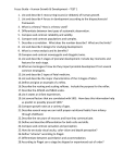 Focus Guide – Human Growth & Development – TEST 1 1. List and describe 3 reoccurring issues (or debates) of human growth. 2. List and describe 4 forces in development according to the biopsychosocial framework. 3. What is a theory? How is a theory used? 4. Differentiate between two types of systematic observation. 5. Compare and contrast reliability and validity. 6. Compare and contrast populations and samples. 7. Describe a correlation. What does the number describe? What are the limits? 8. List and describe 3 designs for studying development. 9. What is a meta-analysis and its benefits? 10.Compare and contrast monozygotic and dizygotic twins. 11.List and describe 3 stages of prenatal development. Include key moments and features for each stage. 12.What are teratogens? How do they impact prenatal development? List several common teratogens. 13.List and describe 3 types of fetal medicine. 14.List and describe the major characteristics of the 3 stages of labor. 15.Define and give an example of a reflex. 16.Describe the rooting and sucking reflexes. Include the purpose for the reflex. 17.Describe the APGAR and NBAS scales. 18.List 4 states an infant experiences. 19.List several factors that are correlated with SIDS. How does this information help us predict or possibly prevent SIDS? 20.Compare growth rates at a variety of ages. 21.Describe several ways we can instill proper nutritional habits from infancy through childhood. 22.Describe the structure of neurons and how they communicate. 23.Define and describe differentiation for both cells and skills. 24.Compare and contrast sensation and perception. 25.How do we study visual acuity, color vision and depth perception? 26.Define “scheme” according to Piaget. 27.Differentiate between assimilation and accommodation. 28.According to Piaget can a stage be skipped or experienced out of order? 29.Describe… a. Sensorimotor thinking b. Object permanence c. Symbols d. Preoperational thinking e. Egocentrism f. Appearance as reality 30.Differentiate between mental hardware and mental software. 31.What type of input results in an orienting response? 32.Describe Vygotsky’s Zone of Proximal Development and Scaffolding. 33.What is the function of private speech? 34.Differentiate between cooing and babbling. 35.Describe and give examples of the following fast mapping concepts … a. Joint attention b. Constraints on word names c. Underextension d. Overextension 36.Describe and give examples of the following sentence skills … a. Telegraphic speech b. Grammatical morphemes c. Overregulation 37.List and describe the first 3 stages of Erikson’s Theory of Development. What are some common characteristics of a child in each stage? How would a parent go about securing the best outcome for each stage? 38.List and describe four stages of forming attachments. 39.List and describe four types of attachment. Which type predicts better relationships later in life? What can a parent do to promote secure attachment? 40.Regarding daycare, what is more important to promoting secure attachment; quality daycare or sensitive parenting? 41.List three elements of basic emotions. 42.Define and give examples of social referencing. 43.List and describe 3 levels of play. Give an example of each. Focus Guide Practice Questions T1 (1-5) Multiple Choice Identify the choice that best completes the statement or answers the question. ____ 1. There are three fundamental characteristics of human development, according to your authors. Which of the following is NOT one of them? a. nature and nurture b. external and internal c. continuity and discontinuity d. universal and context-specific development ____ 2. Iggy wakes up one day and suddenly decides, “I am tired of being the nice guy that everyone pushes around. Starting today, I am going to be more assertive and less accommodating of other people’s needs. And if others don’t like it, I’m not going to care about that anymore.” Iggy’s belief that he can rapidly change a basic part of his own character demonstrates a belief in a. continuity. b. stability. c. discontinuity. d. context-specific development. ____ 3. The notion that development is best described in terms of a series of abrupt shifts in behavior BEST fits with the _____ approach. a. nature b. nurture c. continuity d. discontinuity ____ 4. The biopsychosocial framework organizes the contributions of many different forces in human development. Which of the following is NOT one of them? a. biological forces b. spiritual forces c. sociocultural forces d. psychological forces ____ 5. Why are theories such an important part of the understanding of human development? a. They provide the “whys” for development. b. They give definitive proof of relationships between various developmental factors. c. They allow us to understand the similarity between the developmental paths of human beings and higher animals, such as chimpanzees. d. They are scientifically irrefutable. ____ 6. A _________ is an organized set of ideas that is designed to explain development. a. theory b. prediction c. correlation coefficient d. structured observation ____ 7. Which of the following methods of collecting research data has the benefit of being easy to administer to large groups of participants? a. self-reports b. structured observations c. naturalistic observations d. correlational experiments ____ 8. Sally steps on her bathroom scale, and it tells her that she weighs 145 pounds. When she steps on it again after her shower, she gets the same result. In fact, it has told her that her weight is stable at 145 pounds for several days now. Which of the following qualities is demonstrated by this very consistent scale? a. standardization b. validity c. reliability d. normalization ____ 9. Sally steps on her bathroom scale, and it tells her that she weighs 145 pounds. When she steps on it again after her shower, she gets the same result. In fact, it has told her that her weight is stable