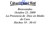 Bienvenidos Octubre 25, 2009 La Presencia de Dios en Medio de Caos Hechos 19 : 30-41 CON MI DIOS \\CON MI DIOS YO SALTARE LOS MUROS CON MI DIOS EJERCITOS DERRIBARE\\ EL ADIESTRA MI MANOS PARA LA BATALLA PUEDO TOMAR CON MIS MANOS EL ARCO DE BRONCE EL ES ESCUDO LA ROCA MIA EL ES LA FUERZA DE MI SALVACION MI ALTO REFUGIO, Y MI FORTALEZA EL ES MI LIBERTADOR EL SEÑOR ESTA EN ESTE LUGAR EL SEÑOR ESTA EN ESTE LUGAR (4X) PARA SANAR, PARA LIBRAR PARA ROMPER TODA OBRA DE MALDAD PARA SANAR, PARA LIBRAR MI ALMA EL SEÑOR EL SEÑOR EL SEÑOR ESTA AQUI CELEBRARÉ TU AMOR INCOMPARABLE, INIGUALABLE ES TU AMOR Y ME RODEA TU ME ABRAZASTE ME SONREÍSTE SEÑOR EN MI PECADO TU AMOR ME ALIMENTA, TU AMOR ME SUSTENTA . CELEBRARÉ TU AMOR TODOS LOS DÍAS CELEBRAR TU GRAN MISERICORDIA CELEBRARÉ TU GRACIA INMERECIDA CELEBRARÉ TU AMOR INMENSURABLE, INAGOTABLE ES TU AMOR Y NUNCA CAMBIA, ESTAS CONMIGO Y NO ME PUEDO ESCAPAR AUNQUE LO INTENTE TU AMOR ES ETERNO, TU AMOR ES PERFECTO CELEBRARÉ TU AMOR Y TU MISERICORDIA OH DIOS OH OH CERCA DE TI (JESUS) CERCA DE TI YO QUIERO ESTAR DE TU PRESENCIA NO ME QUIERO ALEJAR SI DECIDIERA NEGAR MI FE Y NO CONFIAR NUCA MÁS EN ÉL, NO TENGO A DONDE IR NO TENGO A DONDE IR SI DESPRECIARA EN MI CORAZON LA SANTA GRACIA QUE ME SALVO NO TENGO A DONDE IR NO TENGO A DONDE IR CONVENCIDO ESTOY QUE SIN TU AMOR SE ACABARÍAN MIS FUERZAS Y SIN TI MI CORAZÓN SEDIENTO SE MUERE, SE SECA CERCA DE TI YO QUIERO ESTAR DE TU PRESENCIA NO ME QUIERO ALEJAR CERCA DE TI JESÚS YO QUIERO ESTAR, DE TU PRESENCIA NO ME QUIERO ALEJAR ESPERAR EN TI Y ESPERARE, PACIENTEMENTE AUN QUE LA DUDA ME A TORMENTE YO NO CONFIO CON LA MENTE LO HAGO CON EL CORAZON ESPERAR EN TI DIFICIL SE QUE ES MI MENTE DICE NO, NO ES POSIBLE PERO MI CORAZON CONFIADO ESTA EN TI TU SIEMPRE HAS SIDO FIEL ME HAS SOSTENIDO Y ESPERARE, PACIENTEMENTE AUN QUE LA DUDA ME A TORMENTE YO NO CONFIO CON LA MENTE LO HAGO CON EL CORAZON Y ESPERARE, EN LA TORMENTA AUN QUE TARDARE TU RESPUESTA YOU CONFIARE EN TU PROVIDENCIA TU SIEMPRE TIENES EL CONTROL NO HAY NADIE COMO TU NO HAY NADIE COMO TU, NO HAY NADIE COMO TU, PRECIOSO Y GLORIOSO, TAN BELLO Y TAN HERMOSO SEÑOR AQUI ESTAMOS, DISPUESTOS ANTE TI PARA ADORARTE SEÑOR HOY TE ENTREGAMOS NUESTROS CORAZONES, COMO OFRENDA DE AMOR. SEÑOR HEMOS VENIDO A MINISTRARTE A LLORARTE SEÑOR RECONOSEMOS, QUE NO HAY NADIE COMO TU HOY TE CANTAMOS NO HAY NADIE COMO TU, NO HAY NADIE COMO TU, PRECIOSO Y GLORIOSO, TAN BELLO Y TAN HERMOSO JESUS PRECIOSO JESUS Bienvenidos Octubre 25, 2009 La Presencia de Dios en Medio de Caos Hechos 19 : 30-41 Hechos 19: 30-34 (LBLA) 30 Cuando Pablo quiso ir a la asamblea, los discípulos no se lo permitieron. 31 También algunos de los asiarcas, que eran amigos de Pablo, enviaron a él y repetidamente le rogaron que no se aventurara a presentarse en el teatro. 32 Así que unos gritaban una cosa y otros otra, porque había confusión en la asamblea, y la mayoría no sabía por qué razón se habían reunido. Hechos 19: 30-34 (LBLA) 33 Y algunos de la multitud dedujeron que se trataba de Alejandro, puesto que los judíos lo habían empujado hacia adelante. Entonces Alejandro, haciendo señal de silencio con la mano, quería hacer su defensa ante la asamblea. 34 Mas cuando se dieron cuenta de que era judío, un clamor se levantó de todos ellos, gritando como por dos horas: ¡Grande es Diana de los efesios! Acts 19: 30-34 (NASB) 30 And when Paul wanted to go into the assembly, the disciples would not let him. 31 Also some of the Asiarchs who were friends of his sent to him and repeatedly urged him not to venture into the theater. 32 So then, some were shouting one thing and some another, for the assembly was in confusion and the majority did not know for what reason they had come together. Acts 19: 30-34 (NASB) 33 Some of the crowd concluded it was Alexander, since the Jews had put him forward; and having motioned with his hand, Alexander was intending to make a defense to the assembly. 34 But when they recognized that he was a Jew, a single outcry arose from them all as they shouted for about two hours, "Great is Artemis of the Ephesians!" Juan 6: 15-21 (LBLA) 15 Por lo que Jesús, dándose cuenta de que iban a venir y llevárselo por la fuerza para hacerle rey, se retiró otra vez al monte El solo. 16 Al atardecer, sus discípulos descendieron al mar, 17 y subiendo en una barca, se dirigían al otro lado del mar, hacia Capernaúm. Ya había oscurecido, y Jesús todavía no había venido a ellos; 18 y el mar estaba agitado porque soplaba un fuerte viento. Juan 6: 15-21 (LBLA) 19 Cuando habían remado unos veinticinco o treinta estadios, vieron* a Jesús caminando sobre el mar y acercándose a la barca; y se asustaron. 20 Pero El les dijo*: Soy yo; no temáis. 21 Entonces ellos querían recibirle en la barca, e inmediatamente la barca llegó a la tierra adonde iban. John 6: 15-21 (NASB) 15 So Jesus, perceiving that they were intending to come and take Him by force to make Him king, withdrew again to the mountain by Himself alone. 16 Now when evening came, His disciples went down to the sea, 17 and after getting into a boat, they started to cross the sea to Capernaum. It had already become dark, and Jesus had not yet come to them. 18 The sea began to be stirred up because a strong wind was blowing. John 6: 15-21 (NASB) 19 Then, when they had rowed about three or four miles, they saw Jesus walking on the sea and drawing near to the boat; and they were frightened. 20 But He said to them, "It is I; do not be afraid." 21 So they were willing to receive Him into the boat, and immediately the boat was at the land to which they were going. Proverbios/Proverbs 16 : 7 (LBLA/NASB) 7 Cuando los caminos del hombre son agradables al SEÑOR, aun a sus enemigos hace que estén en paz con él. 7 When a man's ways are pleasing to the LORD, He makes even his enemies to be at peace with him. Hechos 19:35, 41 (LBLA) 35 Entonces el secretario, después de calmar a la multitud, dijo*: Ciudadanos de Efeso, ¿hay ac