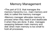 Memory Management •The part of O.S. that manages the memory hierarchy (i.e., main memory and disk) is called the memory manager •Memory manager allocates memory to process when they need it and deallocate it when they are done. It also manages swapping between main memory and disk when main memory is too small to hold all processes. Memory Managements Schemes • There are two types of memory managements: the ones that move back and forth between main memory and disk (i.e., swapping and paging) and those that do not. • The example of the second one is monoprogramming without swapping (rarely used today). In this approach only one program is running at a time and memory is used by this program and O.S. • Three ways of organizing the memory in monoprogramming approach is shown is next slide Relocation and Protection • When a program is linked (all parts of program are combined into a single address space), linker should know at what address the program will begin in memory. • Because the program each time is loaded into a different partition, its source code should be relocatable. • One solution is relocation during loading which means linker should modify the re-locatable addresses. • The problem is even this method can not stop the program to read or writes the memory locations belonging to the other users (i.e., protection problem) Relocation and Protection • Solution to both of these problems is using two special hardware registers, called base and limit registers. When process is scheduled, the base register is loaded with the address of start of its partition and limit register with the length of its partition. Example: base addr, X if loaded at location x=10 x + 10 20 2x + 3 23 x +40 50 Swapping • In the interactive system because sometimes there is not enough memory for the active processes, excess processes must kept on disk and brought in to run dynamically. • Swapping is one of the memory management technique, in which each process is brought in its entirely and after running it for a while putting it back on the disk. • The partitions can be variable that means number, location and size of the partitions vary dynamically to improve memory utilization Swapping • Swapping may cause multiple holes in memory in that case all the processes should move downward to be able to combine the holes into one big one ( memory compaction) • Swapping is slow and also if processes’ data segment grow dynamically there should be a little extra memory whenever a process is swapped in. If there is no space in the memory when processes growing they should be swapped out of the memory or killed (if there is no disk space). • Also if both stack segment (for return addresses and local variable) and data segment (for heap and dynamically allocated variables) of the processes grow, special memory configuration should be considered (see next slide) Issues with Variable Partitions • How do we choose which hole to assign to a process? (allocation strategy) • How do we manage memory to keep track of holes? (see next slide) • How do we avoid many small holes? One possible solution is compaction but there are several variations for compaction. The questions is which processes should be moved) Memory Management with Bitmaps • Each allocation unit in the memory corresponds to one bit in the bitmap (e.g. it is 0 if the unit is free and 1 if it is occupied) • The size of allocation unit is important. The smaller allocation unit the larger bitmap. • If the allocation unit is chosen large, the bitmap is smaller but if process size is not an exact multiple of the allocation unit the memory may be wasted Memory Management with Linked Lists • A linked list keeps track of allocated and free segments (i.e., process or hole). Memory Management with Linked Lists • If the list is sorted by address the combinations of terminating the process x can be shown as follows. List update is different for each situation. Using double-linked list is more convenient. Memory Management with Linked Lists For allocation of memory for new process allocation strategies are: • First fit : first available hole. Generates largest holes • Next fit: next hole. Search starts from the previous place instead of the beginning of the list • Best fit: finds the best hole with the size close to the size needed. It is slower and the results useless tiny holes • Worst fit: takes the largest hole • Quick fit: maintains the separate lists of common sizes such as 4KB,12KB and 20KB holes. It is fast but the disadvantage is merging of free spaces is expensive Virtual Memory • Overlays are the parts of program that are created by programmer. By keeping some overlays on disk it was possible to fit a program larger than memory in the memory. Swapping overlays in and out (they call each other) and also splitting a program to overlays were boring and time consuming. • To solve this problem virtual memory was devised in 1961. It means if the size of program exceeds the size of memory, O.S. keeps those part of the program currently in use, in main memory and the rest on disk. It can be used in single program and multiprogramming environments. Paging • Most of the virtual memory systems use a technique called paging, which is based on virtual addressing. • When a program references an address, this address is virtual address and forms virtual address space. A virtual address does not go directly to a memory bus. Instead it goes to Memory Management Unit (MMU) that maps virtual address onto physical memory address. (see next slide) Virtual Address Paging • Virtual address space is divided into the units called pages corresponding to the units in the physical memory called page frames. • Page table maps virtual pages onto page frames. (see next slide) • If the related page frame exist in the memory physical address is found and the address in the instruction transformed into physical address. • I