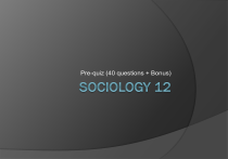 Pre-quiz (40 questions + Bonus) 1. Sociology is the study of: A. B. C. D. People in a society Interactions among people Social institutions All of the above 2. Which theory believes that people in society battle over scarce resources like money, power, and prestige? A. B. C. D. Structural functionalism Conflict Symbolic interaction Feminist 3. Which research method utilizes public records such as marriage and divorce certificates, police records, and birth and death certificates? A. B. C. D. Survey research Participant observation Experiment Secondary data analysis 4. A person who weighs 100 pounds steps onto a scale which indicates that they weigh 200 pounds. He/she gets off the scale, steps back on, and it still reads 200 pounds. That scale is considered: A. B. C. D. E. Reliable but not valid Valid but not reliable Both reliable and valid Neither reliable nor valid Obviously broken 5. Which of the following is NOT an ethic from the American Sociological Association that all researchers must follow? A. Monetarily compensate the respondents B. Protect the respondent’s mental/physical welfare C. Publish all findings D. State who funded the research E. All of the above are ethics 6. Sex and Gender are basically the same thing. • A. True • B. False 7. If a researcher wished to collect data from a group such as females in California or men over the age of 30, these groups would be known as: A. B. C. D. Sub-grouping Population Sample Random sample 8. When conducting research, all biases, prejudices, and assumptions must be suspended. A. True B. False 9. People who control the resources are called… A. Anomie B. Bourgeoisie C. Proletariat 10. Which research method would be likely to yield the most valid results for respondents in their natural setting? A. B. C. D. Experiment Observation Survey research Data analysis 11. What is Social Darwinism ? • A. Sociology should be value free – research should be conducted in a scientific manner excluding the researchers personal values and economic interests • B. a condition in which social control becomes ineffective as a result of the loss of shared values and a sense of purpose in society (used to explain the social conditions that in order to understand why people committed suicide – examining social facts that lie outside individuals) • C. the belief that those species of animals (including human beings) best adapted to their environment survive and prosper, whereas those poorly adapted die out 12. North America has a capitalist economy, with 16% of the population and 31% of the land. North America is an example of a(n) A. B. C. D. most industrialized nation least industrialized nation industrializing nation greedy nation 13. Which of the following choices is a proposed explanation as to why people are poor? A. B. C. D. All choices below it's the poor peoples fault Loss of jobs it's society's fault 14. What is the definition of an ethnic group? A. inherited biological traits B. shared distinctive identity C. shared cultural traits D. a minority treated unequally by a dominant group 15. An example of prejudice is... A. Workers divided by a racial or ethnic line B. All choices C. Cliques in high school D. Membership in a fraternity 16. Gender is defined as... A. attitudes and behaviors considered appropriate for females and males B. social characteristics considered proper for females and males C. negative stereotypes because of people and their age D. biological characteristics which distinguishes males and females 17. Peter Griffin is always leering and ogling Marge's chest in the work place. Recently, he has been giving her neck massages and rubbing her back. Marge repeated told him that it doesn't make her comfortable, yet he continues. The next day at work Peter is fired on the grounds of __________________________. 18. Which of these is NOT one of the functions required for a society to survive? A. Replace Members B. Preserve Order C. Exert Dominance D. Produce Goods 19. If a person is 54 years old, which of stages in the Life Course is he in? A. Early Middle Years B. Later Middle Years C. Young Adulthood D. Early Older Years 20. Which founding sociologist identified the bourgeoisie and proletariat classes? A. Emily Durkheim B. Karl Marx C. Max Weber D. Herbert Spencer 21. Which is not a characteristic of a group? A. Gender B. Size C. Popularity D. Socio economic status 22. What is a norm? A. Social rankings B. Groups C. Beliefs about values D. Standards of behaviour 23. Which norm is strongest in society? A. Folkway B. Sanction C. More D. Taboo 24. What is the meaning of ‘social phenomenon’? A. Values B. Beliefs C. Lifestyle D. An observable fact or event 25. What is the study of various aspects of past and present cultures? A. B. C. D. Correlation Bureaucracy Conflict Anthropology 26. What century did sociology take root? A. B. C. D. 15th 18th 20th 19th 27. Who is considered the founder of sociology? A. B. C. D. Auguste Comte Sigmond Freud Karl Marx Max Weber 28. Name 1 of the 4 most pervasive socializing agents 29. Society and culture are interdependent. Explain. 30. What is the difference between Nature and Nurture? 31. The largest number of domestic violence cases takes place among: A. B. C. D. friends boss and worker parents siblings 32. All of the following are examples of material culture except… A. Paper B. Computers C. Cars D. Language 33. State 3 elements of Hip Hip Culture 34. Contrary to the perception of many North Americans, mass killers and serial murders account for _________ percent of homicides each year. A. B. C. D. less than one less that 0.5 more than 1 more than 25 35. Many sports such as tennis and golf were originally played only by the rich. However, now people at all levels of society can participate in these activities. This demonstrates … A. How high culture can become popular culture B. Cultural diffusion C. Cultural imperialism D. That popular culture is more important than high culture 36