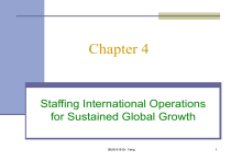 Chapter 4 Staffing International Operations for Sustained Global Growth IBUS 618 Dr. Yang 1 Chapter Objectives The previous two chapters have concentrated on the global environment and organizational contexts. We now focus on the managing people aspect. The aim is to establish the role of HRM in sustaining international business operations and growth. We will cover the following: Issues related to various approaches to staffing foreign operations; Reasons for using international assignments: position filling, management development, and organizational development; (cont.) IBUS 618 Dr. Yang 2 Chapter Objectives (cont.) Various types of international assignments: Standard assignments: Short-term, extended, and longer-term; Non-standard arrangements: Commuter, rotator, contractual, and virtual. The role of expatriates and non-expatriates in supporting international business activities (Flexpriates) The role of inpatriates in the corporate global strategy Return on investment of international assignments The role of the corporate HR functions IBUS 618 Dr. Yang 3 Approaches to Staffing General staffing policy on key positions at headquarters and subsidiaries Ethnocentric Polycentric Geocentric Regiocentric Constraints placed by host government Staff availability IBUS 618 Dr. Yang 4 Ethnocentric Strategic decisions are made at headquarters; Limited subsidiary autonomy; Key positions in domestic and foreign operations are held by headquarters’ personnel; PCNs manage subsidiaries. IBUS 618 Dr. Yang 5 Polycentric Each subsidiary is a distinct national entity with some decision-making autonomy; HCNs manage subsidiaries who are seldom promoted to HQ positions; PCNs rarely transferred to subsidiary positions. IBUS 618 Dr. Yang 6 Regiocentric Reflects a regional strategy and structure; Regional autonomy in decision making; Staff move within the designated region, rather than globally; Staff transfers between regions are rare. IBUS 618 Dr. Yang 7 Geocentric A global approach - worldwide integration; View that each part of the organization makes a unique contribution; Nationality is ignored in favor of ability: Best person for the job; Color of passport does not matter when it comes to rewards, promotion and development. IBUS 618 Dr. Yang 8 Staffing a New International Venture The company recently made An Australian wine company has successful and growing exports in three markets: U.K., U.S., and Scandinavia; Gained a global recognition for quality wine; Assisted by technological improvements, and aggressive marketing; Now the Board wants the company to “ride the Australian wave” and gain more market shares in the European continent. an acquisition in France, its first time FDI: Which is a middle-level player in the Fench home market; With efficient operation in the French context; Modest profit margin; Limited sales to EU neighboring countries; The Broad believes there is room for improvement particularly in production techniques and marketing IBUS 618 Dr. Yang 9 How would you staff the new venture? Staffing approaches to Factors to consider: consider? Strategic goal Key positions to be filled: Mode of entry Managing Director, head Degree of control of the new venture French culture and Production Manager labor law Marketing Manager EU works council Chief wine Technologist Competence transfer HR Manager Brands, the “Australian wave” Chief Finance Manager IBUS 618 Dr. Yang 10 Table 4-1a Advantages and Disadvantages of Using PCNs IBUS 618 Dr. Yang IHRM Chapter 4 11 11 Table 4-1b Advantages and Disadvantages of Using TCNs IBUS 618 Dr. Yang IHRM Chapter 4 12 12 Table 4-1c Advantages and Disadvantages of Using HCNs IBUS 618 Dr. Yang IHRM Chapter 4 13 13 Figure 4-1 Determinants of Staffing Choices IBUS 618 Dr. Yang IHRM Chapter 4 14 14 Reasons for International Assignments Position filling, e.g. Skills gap, launch of new endeavor, technology transfer Management development Training and development purposes, assisting in developing common corporate values Organizational development Need for control, transfer of knowledge, competence, procedures and practices IBUS 618 Dr. Yang 15 Types of International Assignments Short term: up to 3 months Troubleshooting Project supervision A stopgap until a permanent arrangement is found Extended: up to 1 year May involve similar activities as short-term assignments Long term Varies from 1 to 5 years The traditional expatriate assignment IBUS 618 Dr. Yang 16 Non-standard Assignments Commuter assignments Rotational assignments Contractual assignments Virtual assignments Some of these arrangements assist in overcoming the high cost of international assignments but are not always effective substitutes for the traditional expatriate assignment. IBUS 618 Dr. Yang 17 Table 4-2 Differences between Traditional and Short-term Assignments IBUS 618 Dr. Yang IHRM Chapter 4 18 18 Figure 4-2 The Roles of an Expatriate IBUS 618 Dr. Yang IHRM Chapter 4 19 19 The Role of Non-expatriates People who travel internationally yet are not considered expatriates as they do not relocate to another country Road warriors, globetrotters, frequent fliers Much of international business involves visits to foreign locations, e.g. Sales staff attending trade fairs Periodic visits to foreign operations, subcontractors, etc. Meeting with foreign agents, clients, distributors, suppliers, etc. IBUS 618 Dr. Yang 20 A Glamorous Life International business travelers cite the positives as: Excitement and thrills of conducting business deals in foreign locations Life style (top hotels, duty-free shopping, business class travel) General exotic nature IBUS 618 Dr. Yang 21 But a High Level of Stress! Home and family issues Frequent absence and separation Work arrangements Domestic side of position still has to be attended to Travel logistics Waiting in airports, etc. Health concerns Poor diet, lack of sleep, etc. Host culture issues Limited cultural training, lack of backup support IBUS 618 Dr. Yang 22 The R