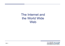 The Internet and the World Wide Web Slide 1 What is the Internet? • It is a vast network of computers that connects millions of people all over the world. • It is a collection of hardware and software in the form of a worldwide network. • A network is simply a collection of computers that support the sharing of information, software & hardware devices. • An Internet service provider (ISP) is a company that provides individuals, organisations, & businesses access to the Internet. Slide 2 Computers on the Internet • There are two basic types of computers on the Internet: – Servers – Clients • An Internet server computer (also known as an Internet host computer) is a computer that provides information & services to other computers & Internet users. • There are different types of severs such as mail servers, FTP servers, etc. • A web client is essentially the computer you use to access information on the server. Slide 3 Human communication • When we talk to each other we use a language- for example English, Kiswahili or Arabic. • We also follow certain ‘communication protocols’ or rules- for example when someone is speaking to you, you usually do not speak at the same time. • Can you think of other rules for communication between people? Slide 4 How is information communicated on the internet? • The internet also has various languages and ‘communication protocols’ • A communication protocol is a set of rules that computers follow to transfer information. These protocols allow different computers to communicate effectively. • Web pages, are written in Hypertext Markup Language (HTML)- this is the language • They are communicated according to Hyper Text Transfer Protocol (HTTP)- this is the communication protocol Slide 5 Types of protocols • http-hypertext transfer protocol – It supports the movement of information on the WWW • TCP/IP-transport control protocol/Internet protocol – A basic communication protocol that makes the Internet to work. – It defines the rules that allow various computers to communicate across the Internet. • ftp-file transfer protocol – Allows you to transfer files of information from one computer to another. Slide 6 How do you get connected to the internet? Slide 7 You need 4 things to get connected on the Internet 1. A computer • May be a notebook, a desktop, etc. 2. An Internet service provider (ISP) • Includes commercial ISPs, free ISPs, your institution, or your place of work 3. A modem • A telecommunication device that allows you to connect your computer to another or to a network of other computers. 4. Communications software • Web browsers and connectivity software. Web browsers allow you to access information on the Web e.g. Internet Explorer, Netscape, or Mozilla Slide 8 Who uses the Internet? The Internet has only been widely used since about 1995 with the Fast factsof...the 'World Wide Web' but its use has been increasing availability – ever By 1998 1.5 million Web pages born daily rapidly since: – By 2001 there were over 500 million users of the Internet – In 2003 Google performed 250 million searches per day! – In 2005 Google claims to search over 8 million pages of the Internet. – In December 2009 a survey from Netcraft (a company who provide Internet research data) had responses from 233,848,493 sites. • Slide 9 Slide 10 BUT… • The Internet is completely uncontrolled. Anyone can publish anything, letting you find ... well, almost ANYTHING at all! • The Internet is also completely DISORGANIZED just like a filing cabinet up-ended into a heap on the floor. •There is no structure, no catalogue, no comprehensive index, no guide to what information might be there. •Understand the Internet better, and you will search more successfully for useful information every time! Slide 11 Types of information found on the Internet • There are many types of information on the Internet. • Different Web sites have been created by different people or organizations, with different objectives. • Can you think of THREE different types of information that might be on the web? • There are many different TYPES of Web sites created on the Internet for different REASONS. Slide 12 Websites • • • • • • • • • News, weather and current affairs e.g. CNN, BBC, Aljazeera. These are profit making and aim at spreading information. Government Information- e.g. the Armed Forces, NASA, statistics e.g. Government, The Whitehouse. These are non-Profit and they provide information to citizens. Consumer Information- e.g health, cars, travel, new products... selling a product or service for profit. Religious- all denominations e.g. The Islamic religion, Non-governmental organisations- could be big or small, could provide reliable information or could be bias Education- schools, universities and colleges. e.g. Kwame Nkrumah University of Science and Technology. These are non-profit or profit making Entertainment- e.g. music, movies, games and media personalities e.g. TV Personal Information or viewpoints- from individuals or families, to large organizations and groups e.g. Family histories, Associations, Clubs. Research and publication- including research that may not yet be published elsewhere e.g. Current Research. Slide 13 Search Engines • Search Engines provide us with the ability to search the vast resources of the Internet • But WHAT is a Search Engine, and are they all the same? – Search Engines are used to find all types of information and media on the Internet. – Search Engines provide lists of Web sites. – Each Search Engine searches differently and finds different information. – NO single Search Engine will search the entire Internet. Slide 14 Search Engines (cont) – When you use a Search Engine it seems like you are directly searching the entire Web, but that's not really what happens. You are really searching a database or index of URL links. – You can only find 