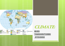 CLIMATE: WIND THUNDERSTORMS CYCLONES What is CLIMATE? Climate is a measure of the average pattern of variation in temperature, humidity, atmospheric pressure, wind, precipitation, atmospheric particle count and other meteorological variables in a given region over long periods of time. Climate is different from weather, in that weather only describes the short-term conditions of these variables in a given region. A region's climate is generated by the climate system, which has five components: atmosphere, hydrosphere, cry sphere, land surface, and biosphere.[1] Climate (from Ancient Greek klima, meaning inclination) is commonly defined as the weather averaged over a long period.[3] The standard averaging period is 30 years,[4] but other periods may be used depending on the purpose. Climate also includes statistics other than the average, such as the magnitudes of day-to-day or yearto-year variations. FACTORS OF CLIMATE: The climate of a location is affected by its latitude, terrain, and altitude, as well as nearby water bodies and their currents. Climates can be classified according to the average and the typical ranges of different variables, most commonly temperature and precipitation. The most commonly used classification scheme was originally developed by Wladimir Köppen. The Thornthwaite system,[2] in use since 1948, incorporates evapotranspiration along with temperature and precipitation information and is used in studying animal species diversity and potential effects of climate changes. The Bergeron and Spatial Synoptic Classification systems focus on the origin of air masses that define the climate of a region. Difference between climate and weather The difference between climate and weather is usefully summarized by the popular phrase "Climate is what you expect, weather is what you get.” The day to day conditions of the atmosphere at a place with respect to the temperature, humidity, rainfall, wind-speed, etc., is called the weather at that place. The weather is generally not the same on any two days and week after week. The average weather pattern taken over a long time, say 25 years, is called the climate of the place. Climate classification There are several ways to classify climates into similar regimes. Originally, climes were defined in Ancient Greece to describe the weather depending upon a location's latitude. Modern climate classification methods can be broadly divided into genetic methods, which focus on the causes of climate, and empiric methods, which focus on the effects of climate. Examples of genetic classification include methods based on the relative frequency of different air mass types or locations within synoptic weather disturbances. Examples of empiric classifications include climate zones defined by plant hardiness,[10] evapotranspiration,[11] or more generally the Köppen climate classification which was originally designed to identify the climates associated with certain biomes. A common shortcoming of these classification schemes is that they produce distinct boundaries between the zones they define, rather than the gradual transition of climate properties more common in nature. Climate change Climate change is the variation in global or regional climates over time. It reflects changes in the variability or average state of the atmosphere over time scales ranging from decades to millions of years. These changes can be caused by processes internal to the Earth, external forces (e.g. variations in sunlight intensity) or, more recently, human activities.[42] Variations in CO2, temperature and dust from the Rostock ice core over the past 450,000 years WIND Moving air is called WIND. In meteorology the term is usually applied to the natural horizontal motion of the atmosphere; motion in a vertical, or nearly vertical, direction is called a current. Winds are produced by differences in atmospheric pressure, which are primarily attributable to differences in temperature. Variations in the distribution of pressure and temperature are caused largely by unequal distribution of heat from the Sun, together with differences in the thermal properties of land and ocean surfaces. When the temperatures of adjacent regions become unequal, the warmer air tends to rise and flow over the colder, heavier air. Winds initiated in this way are usually greatly modified by the Earth's rotation. Winds may be classified into four major types: the prevailing winds, the seasonal winds, the local winds, and the cyclonic and anticyclone winds, including cyclones, hurricanes, and tornadoes. Anemometer (Greek, anemos, “wind”; metron,”measure”), an instrument that measures wind speed. The most common kind of anemometer consists of three or four cups attached to short rods that are connected at right angles to a vertical shaft. As the wind blows, it pushes the cups, which turn the shaft. The number of turns per minute is translated into wind speed by a system of gears similar to those in the speedometer of a motor vehicle. Wind velocity is also measured by the pressure of the air blowing into a Pitot tube (an L-shaped tube, one end open towards the flow of air and the other end connected to a pressure-measuring device), or electrically by the cooling effect of the wind on a heated wire, which causes the electrical resistance of the wire to change. THUNDERSTORMS and LIGHTINING A flash of lightning rips through the night sky. Lightning is the visible electric discharge that occurs between rain clouds or between a rain cloud and the earth. All thunderstorms are dangerous. Every thunderstorm produces lightning. While lightning fatalities have decreased over the past 30 years, lightning continues to be one of the top three storm-related killers in the United States. In 2010 there were 29 fatalities and 182 injuries from lightning. Although most lightning victims survive, people struck by lightning often report a variety of long-term, debilitating symptoms. Other associated dangers 