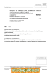 Centre Number Candidate Number Candidate Name UNIVERSITY OF CAMBRIDGE LOCAL EXAMINATIONS SYNDICATE Joint Examination for the School Certificate and General Certificate of Education Ordinary Level CHEMISTRY 5070/4 PAPER 4 Alternative to Practical OCTOBER/NOVEMBER SESSION 2001 1 hour Candidates answer on the question paper. No additional materials required. TIME 1 hour INSTRUCTIONS TO CANDIDATES Write your name, Centre number and candidate number in the spaces at the top of this page. Answer all questions. Write your answers in the spaces provided on the question paper. All essential working must be shown. INFORMATION FOR CANDIDATES The number of marks is given in brackets [ ] at the end of each question or part question. You should use names, not symbols, when describing all reacting chemicals and the products formed. FOR EXAMINER’S USE This question paper consists of 14 printed pages and 2 blank pages. SB (SLC/KN) QK11385/2 © UCLES 2001 http://www.xtremepapers.net [Turn over For Examiner’s Use 2 1 Name the apparatus shown below. 10 20 30 40 50 ..............................................................................................................................................[1] 2 A student was given some hydrated copper(II) sulphate crystals, CuSO4.xH2O. They were placed in a previously weighed test-tube which was then reweighed. (a) What colour are hydrated copper(II) sulphate crystals? ......................................................................................................................................[1] Mass of test-tube + hydrated copper(II) sulphate crystals Mass of test-tube = 9.25 g = 5.40 g (b) Calculate the mass of hydrated copper(II) sulphate used in the experiment. ......................................................................................................................................[1] The crystals were gently heated until they became anhydrous, ie no more water vapour was given off. The crystals changed colour and became powdery. (c) What colour was the copper(II) sulphate after heating? ......................................................................................................................................[1] Mass of test-tube + copper(II) sulphate after heating = 7.90 g (d) (i) Calculate the mass of copper(II) sulphate which remained after heating. ................................................................................................................................... (ii) Calculate the mass of water lost from the crystals. ................................................................................................................................... [2] 5070/4/O/N/01 For Examiner’s Use 3 (e) Calculate (i) the relative formula mass of anhydrous copper(II) sulphate, (Ar: Cu, 64; S, 32; O, 16) ................................................................................................................................... (ii) the relative molecular mass of water. ................................................................................................................................... [2] (f) Using your answers to (d) and (e), calculate (i) how many moles of anhydrous copper(II) sulphate remained after heating, ................................................................................................................................... (ii) how many moles of water were lost on heating. ................................................................................................................................... [2] 5070/4/O/N/01 [Turn over For Examiner’s Use 4 (g) The value of x in the formula CuSO4.xH2O can be found as follows. answer to (f)(ii) x = ––––––––––––– answer to (f)(i) Calculate the value of x. Hence write the formula of hydrated copper(II) sulphate crystals. The formula is ..............................................................................................................[2] 3 A student separated benzene (b.p. 80 °C) and methylbenzene (b.p. 111 °C) by using the apparatus shown below. water in thermometer A B water out C electric heater benzene and methylbenzene mixture (a) What error has the student made in setting up the apparatus? ......................................................................................................................................[1] 5070/4/O/N/01 For Examiner’s Use 5 (b) (i) Name the apparatus A. ................................................................................................................................... (ii) Why is it used? ................................................................................................................................... [2] (c) (i) Name the apparatus B. ................................................................................................................................... (ii) Why is it used? ...............................................................................................................................[2] (d) Why was an electric heater rather than a flame used to heat the mixture? ......................................................................................................................................[1] (e) (i) What was the reading on the thermometer when the first few drops of distillate appeared in C? ................................................................................................................................... (ii) What was this distillate? ................................................................................................................................... (iii) How did the student know when all of the first fraction had distilled over? ...............................................................................................................................[3] 5070/4/O/N/01 [Turn over For Examiner’s Use 6 In questions 4 to 8, place a tick in the box against