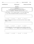 Name: _________________________________________ Code # _________ UCSD Physics 2B Practice Exam 1 Summer Session 2008 ID: X Charges, Force & Fields READ ME !!! Helpful Hints: Do this exam a few times... Once without the answers, Once after seeing the solutions & Once again with your formula sheet This is a good time to add formulas/constants to your sheet. Remember, this is a timed exam... work swiftly so you have time to check your answers. 1. A positive charge q 1 = +63.0 nC is placed at a distance r = 15.0cm from a negative charge q 2 = −45.0 nC . What is the magnitude of the force on one charge due to the other? A. 1.13 × 10 −3 N B. 1.70 × 10 −4 N C. 1.02 × 10 −7 N D. 1.25 × 10−13 N 2. How many electrons must be transferred to an electrically neutral body to produce a total net charge q tot = −125nC ? A. 1.25 × 10 −7 B. 7.81 × 10 11 C. 1.28 × 10 12 D. 3.45 × 10 11 3. An initially neutral empty vacuum chamber designed to contain a hot plasma is injected with n p = 1.67 × 10 23 protons and n e = 7.99 × 10 22 electrons. What is the net charge inside the chamber? A. +3.95 × 10 4 C B. +1.39 × 10 4 C C. −3.95 × 10 4 C 1 D. −1.39 × 10 4 C Name: ________________________ ID: A 4. Three charges q 1 = +22.0 μC , q 2 = −44.0 μC and q 3 = +10.0 μC are placed in a line as shown below where the distance r 1 = 1.00 cm and r 2 = 0.750 cm. What is the magnitude and direction of the force on the center charge q 2 ? Take the plus direction to the right. A. +1.67 × 10 4 N B. −1.58 × 10 5 N C. −1.67 × 10 4 N D. +1.58 × 10 5 N 5. A charge q = 23.7mC feels a force F = 525N at a certain point in space. What is the magnitude of the electric field at that point? A. 2.22 × 10 1 N C B. 2.22 × 10 4 N C C. 4.51 × 10−2 N C D. 4.51 × 10−5 N C 6. Two charges q 1 = 40.0 μC and q 2 = 20.0 μC are separated by a distance r = 2.00mm and located along a line as shown below. What is the magnitude and direction of the electric field at point x? Take right as the plus direction. A. −6.75 × 1010 N C B. +6.75 × 1010 N C C. +1.35 × 1010 2 N C D. −1.35 × 1010 N C Name: ________________________ ID: A 7. A thin rod of infinite length carries a linear charge density λ = 1.7 × 10 −6 C / m. What is the magnitude of the electric field at a distance r = 4.2 cm from the rod? A. 7.3 × 10 5 N C B. 1.7 × 10 11 N C C. 1.4 × 10 7 N C D. 2.3 × 10 6 N C 8. An infinitely long straight wire carries a linear charge density λ = 2.2 × 10 −9 C / m. A cardboard tube from an exhausted bathroom tissue roll is placed as shown in the diagram below. If the tube length L = 15 cm and radius R = 6.6 cm, what is the electric flux passing through the tube? A. 37 k N ⋅ m2 C2 B. 68 k N ⋅ m2 C2 C. 37 N ⋅ m2 C D. 68 N ⋅ m2 C 9. Two infinite sheets of charge are separated by a distance d = 1.20mm and carry opposite charge C densities σ = 1.30 × 10 −10 2 . What is the electric field between the sheets? m A. 14.7 N C B. 29.4 N C C. 1.15 × 10 −21 3 N C D. 1.08 × 10−7 N C Name: ________________________ ID: A 10. Two concentric spheres carry charges +Q on the inner sphere and −Q on the outer. If the inner sphere has radius R and the outer sphere 2R, what is the electric field at a point just outside the outer sphere? Take the direction pointing radially out as positive. A. kQ R B. − 2 kQ R C. − 2 kQ (2R) 2 D. Zero 11. A perfectly spherical balloon of radius R = 22.0 cm has no net charge. If a point charge q = 1.60 × 10−9 C is placed at it center, what is the electric flux passing through the balloon? A. 181 N ⋅ m2 C B. 65.0 N ⋅ m2 C C. 297 N ⋅ m2 C D. 466 N ⋅ m2 C 12. A non-conducting sphere of radius r = 3.00 cm carries a uniform volume charge density C ρ = 5.00 × 10−7 3 . What is the magnitude of the electric field at its surface R = 3.00 cm. m A. 36.0 N C B. 232 N C C. 147 N C D. 565 N C 13. A point charge +q = +35nC is directly above a point charge −q = −35nC separated by distance d = 4.0cm. What is the magnitude and direction of the dipole moment p? A. 1.4 × 10 −9 C ⋅ m ↓ B. 1.4 × 10 −9 C ⋅ m ↑ C. 2.8 × 10 −9 C ⋅ m ↓ 4 D. 2.8 × 10 −9 C ⋅ m ↑ Name: ________________________ ID: A 14. The force between two very small particle is found to be F. If the separation distance r between them is doubled without altering the charges, the force between them becomes A. 4F B. 2F C. 1 F 2 D. 1 F 4 15. Electric charges of the opposite sign A. have the same magnitude B. attract each other C. repel each other D. exert no force on each other 16. A non-conducting sphere of radius R = 1.30 × 10 −2 m carries a uniformly distributed total charge Q = 6.60 × 10 −5 C . What is the volume charge density ρ inside the sphere? A. 12.4 C m3 B. 7.18 C m3 C. 0.311 mC m3 D. 22.7 kC m3 17. A solid non-conducting cylinder of radius R = 1.33 × 10 −2 m and length L = 8.74 × 10 −1 m is given a r non-uniform electric charge density which varies with distance r from the axis as ρ (r) = ρ 0 where R C ρ 0 = 5.88 × 10 −3 3 . What is the total net charge contained in the cylinder? Hint: try making your m differential charge elements in the shape of nested cylindrical shells of length L and radius r and then integrate the charge density times the volume elements as r → 0,R. A. 2.85μ C B. 1.90μ C C. 5.71μ C 5 D. 1.43μ C Name: ________________________ ID: A 18. An electric field of strength E = 31.7 μ N / m passes through a square sheet of side s = 2.66 m at an angle θ = 11.6 ° from the sheet normal as shown in the diagram below. How much electric flux passes through the sheet? A. 8.26 × 10 −5 B. 2.20 × 10 −4 N ⋅ m2 C N ⋅ m2 C C. 1.70 × 10 −5 D. 4.51 × 10 −5 N ⋅ m2 C N ⋅ m2 C 19. An electric dipole vector p = 25.0nC ⋅ m makes an angle θ = 61.0° with a uniform electric field vector N E = 3.00 × 10−6 . What is the torque on the dipole? C A. −7.25 × 10 −14 N ⋅ m B. −1.94 × 10 −14 N ⋅ m C. 3.64 × 10 −14 N