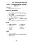 Unit 4b: Foundational Beliefs--Russian Orthodox Unit 4b: Foundational Beliefs--Russian Orthodox Objectives At the end of this unit, you will Be aware of the following • Self-governing nature of Orthodox Eastern Churches • Orthodox emphasis on prayer and worship rather than doctrine • Place of icons in Orthodox Eastern practice • Theology of suffering • Baptism and the Eucharist as the most significant orthodox sacraments • Roman Catholic authority is the Bishop of Rome (Pope) • Importance of the Seven Ecumenical Councils to Orthodox Eastern practice Identify • • • • • • • Ecumenical Patriarch Great Schism Icons Theotokos Jesus Prayer Liturgy Mysticism • • • • • • Chrismation Eucharist Holy unction Pope Homily Sacrament Realize • Importance of monastic communities with the orthodox tradition • Observance of the church calendar in Orthodox Eastern practice 179 Unit 4b: Foundational Beliefs--Russian Orthodox • Place of fasting in the Orthodox Eastern tradition • Seven sacraments of Orthodox Eastern practice Different positions on church authority-Orthodox Eastern and Roman Catholic • Reasons for environmental concerns within orthodoxy 180 Unit 4b: Foundational Beliefs--Russian Orthodox Unit 4b: Russian Orthodox Belief 1. Introduction Five major regions mark the territorial boundaries of the Orthodox Church. Over 200 million adherents belong to the church worldwide. a. Muslim borders This church exists in ancient outposts in the Islamic world--Constantinople (Istanbul), Alexandria, Antioch, and Jerusalem. b. Greek world Cyprus and Greece--where the churches trace their lineage to Paul and Barnabas--have a strong orthodox tradition. Greece is the only country where the orthodox faith is the official state church. c. Romania and Georgia In Romania, with over 15 million members, and Georgia are non-Greek/Slavonic speaking churches. d. Slavs Serbia, Bulgaria and Russia are home to the Slavonic Orthodox churches. e. Other areas Finland, the Czech Republic, Western Europe, Australia, America and Albania round out those countries with churches affiliated with the orthodox tradition. 181 Unit 4b: Foundational Beliefs--Russian Orthodox 2. Practice a. Self-governing churches “Autocephalous” describes the self-governing nature of orthodox churches. While each church is independent of others, they possess full agreement on matters of doctrine. Full sacramental communion is practiced throughout the loose federation. Constantinople, Alexandria, Antioch, Jerusalem and Moscow are among the hierarchical heads. No church has overall power, yet the Ecumenical Patriarch of Constantinople is seen as the “first among equals.” This historic center for orthodox practice is in ways similar to the Archbishop of Canterbury with the Anglican communion. b. Leadership Priests serve as “spiritual fathers” to their congregations. At the parish level, priests may marry. Celibate bishops, drawn from monastic and other communities, minister at higher leadership levels. Only males may serve at the altar as priests, deacons, or altar boys. Women participate in all other areas of church life--lead congregational singing, paint icons, teach classes, serve on parish councils and read epistle lessons. Monastic communities enjoy healthy respect within the tradition. Monasteries remind the faithful of the depths of spirituality; keep the faith alive during difficult times; combat heresy; interrupt political influences; and provide sources for church leadership at higher levels. 182 Unit 4b: Foundational Beliefs--Russian Orthodox Parish priests are addressed as “Father” with accompanying first name. The terms patriarch, catholicos, metropolitan or archbishop refer to senior bishops who normally serve in the primary city of the territory of influence. An archimandrite is a title of honor for priest-monks. The Ecumenical Patriarchate (Church of Constantinople) is headed by the ecumenical patriarch, an honorific title for the symbolic 'head' of the Orthodox Church. 3. Belief "Orthodoxy is not just a kind of Roman Catholicism without a Pope, but something quite different..." --Timothy Ware, The Orthodox Church, p. 10 a. Break with Rome Orthodoxy’s break with the Roman Catholic Church stemmed as much from societal/political forces as from matters of doctrine. The great schism--where the Pope excommunicated the Orthodox--occurred in 1054. As an outcome of the Council of Florence (1439), two central issues of disagreement--submission to papal authority in Rome and filioque (the doctrine that the Holy Spirit precedes not just from the Father but also from the Son)--galvanized the rift between the two communions. Orthodoxy sees itself as being in continuity with the church since apostolic times, an outlook it continues to this day. It sees no Middle Ages, Reformation, or Counter-Reformation as part of its heritage. Rather, orthodoxy emphasizes a constancy with the church of the earliest ecumenical creeds and councils. 183 Unit 4b: Foundational Beliefs--Russian Orthodox b. Teaching authority Orthodox and Roman Catholic churches shared the same history for over half of their ecclesiastical life. While both bodies honor the same seven Sacraments, and see the interpretation of Scripture as the church’s responsibility rather than of private interpretation, they differ significantly-especially in the following two areas concerning church authority. (1) Seven Ecumenical Councils Eastern Orthodoxy sees doctrine as mediated in the Seven Ecumenical Councils--all held before A.D. 787. Essentials of Christian belief, expressed in early creeds of the church and the Seven Councils, are relatively few. All other pronouncements--such as purgatory, indulgences, the Immaculate Conception, the assumption of Mary--which are held as doctrine by the Roman Catholic Church, orthodoxy sees as “innovations.” Eastern Orthodoxy sees the church as continuing early church tradition rather than develo