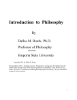 Introduction to Philosophy By Dallas M. Roark, Ph.D. Professor of Philosophy (Emeritus) Emporia State University Copyright 1982 by Dallas M. Roark Revised edition, 2016. All rights reserved. Permission in writing must be obtained from the author before any part of this work may be reproduced or transmitted in any form or by any means, electronic or mechanical, including photocopying and recording, or by any information storage or retrieval system. 1 CONTENTS Chapter I What is Philosophy? Chapter II How Do We Know? Chapter III What Do We Know? Chapter IV When Can We Say We Know? Chapter V Knowledge and Method in Science, Philosophy, and Religion Chapter VI Metaphysics: Definitions and Issues Chapter VII Metaphysics: Origins Chapter VIII Man: Mystery and Wonder Chapter IX Naturalism Chapter X Idealism Chapter XI Realism Chapter XII Pragmatism Chapter XIII Existential Philosophy Chapter XIV Logical Empiricism Chapter XV Philosophies of the East Chapter XVI Post-Modernism Chapter XVII Values--Ethics Chapter XVIII Belief in God (Some Aspects of a Philosophy of Religion) Chapter XIX Some Ingredients of a Christian Philosophy 1 15 39 60 73 97 114 134 158 184 205 224 245 268 284 315 322 337 416 2 Chapter I What is Philosophy? Part I. Definitions Defining philosophy is as difficult as trying to define love. The word philosophy is not much help. Philosophy is a combination of two Greek words, philia sophia, meaning love of wisdom. In ancient times a lover of wisdom could be related to any area where intelligence was expressed. This could be in business, politics, human relations, or carpentry and other skills. Philosophy had a "wholeness" approach to life in antiquity. In contrast to this, some modern definitions restrict philosophy to what can be known by science or the analysis of language. In today's world there is a popular use of the word philosophy. Philosophy is a term applied to almost any area of life. Some questions may express this general attitude: what is your philosophy of business? banking? driving a car? or your philosophy of the use of money? If this popular misuse of the word were to prevail, one may admit that anyone who thinks seriously about any subject is a philosopher. If we do this, we are ignoring the academic disciplines, or study of philosophy. If this very general definition is accepted, everyone becomes a philosopher. It becomes true, paradoxically, that when everyone is a philosopher, no one is a philosopher. This becomes so loose a definition that philosophy becomes meaningless as a definition. If this definition prevailed, it would mean that a philosopher is anyone who says he is a philosopher. Because of this inadequacy it becomes apparent that we have to look elsewhere for a definition of philosophy. Because the original meaning of the word, philosophy, does not give us much for specific content, we will turn to descriptive definitions. A descriptive definition of philosophy is that it seeks to describe its functions, goals, and reasons for existence. In the following pages a number of these definitions will be set forth and examined. A word of warning is offered to the beginning student of philosophy. The beginner may despair over diverse definitions. Students who come from a scientific background frequently expect concise, clear, and universally accepted definitions. This will not be true in philosophy and it is not universally true concerning all issues in any science or non-scientific study or discipline. The diversity of opinion in philosophy becomes a source of embarrassment for the beginner when asked to explain to parents or unknowing friends just what a course in philosophy is all about. It might 3 be expected that one of the oldest disciplines or subjects in academia should achieve some uniformity or opinion, but this is not the case. Yet in spite of diversity, philosophy is important. Plato declared that philosophy is a gift the gods have bestowed on mortals.1 This may reflect man's ability to reason about the world as well as man's life within it. Socrates' famous statement, "Know thyself," reflects this aim of philosophy. Plato also warned against the neglect of philosophy. He wrote that "land animals came from men who had no use for philosophy. . . ."2 In light of this it might help to threaten the reader with the warning: if you don't take philosophy seriously, you will turn into a pumpkin! But more seriously, men live by philosophies. Which one will it be? We now turn to consider several definitions of philosophy. These will include the historical approach, philosophy as criticism, philosophy as the analysis of language, philosophy as a program of change, philosophy as a set of questions and answers, and philosophy as a world-view. Along the way we will also analyze the definitions and attempt to reach some conclusions about this analysis. A. The Historical Approach Remember our question: what is philosophy? According to this approach philosophy is really the study of historical figures who are considered philosophers. One may encounter the names of Socrates, Plato, Aristotle, Augustine, Thales, Philo, Plotinus, Aquinas, Kant, Erigena, Hume, Marx, Hegel, Russell, Wittgenstein and many more. All are considered philosophers. What holds them together since they are so diverse in many of their views? One answer lies in their common set of problems and concerns. Many were interested in the problems of the universe, its origin, what it is in its nature, the issue of man's existence, good and evil, politics, and other topics. (This may serve as a link to another definition to be considered later.) The argument for the historical approach is that no real understanding of philosophy can be had unless one understands the past. Philosophy would be impoverished if it lost any of the names above. Some argue that knowing the history of philosophy is required for a positive appreciation of philosophy, and necessary if one is to make creative contributions to the 