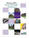 Business Office “Count on Satisfaction” Financial Manager Handbook Table of Contents Introduction Introduction to the Financial Manager Handbook Page i Banner 1.1. Banner Finance Access Request Form 1.2. Banner Finance Training Manual Section 1 Cash Handling 2.1. Cash Handling Financial Manager Responsibilities 2.2. Change and Petty Cash Funds Financial Manager Responsibilities Section 2 Accounts Payable 3.1. Invoices 3.2. Emergency Hand Cut Requests 3.3. Check Cycle Deadlines 3.4. End of Fiscal Year Deadlines 3.5. Trainings Section 3 Section 4 Section 5 6.1. Budget Transfers 6.2. Online Requisitions 6.3. Budget Development 6.4. End of Fiscal Year Deadlines 6.5. Trainings Section 6 7.1. Grant Financial Manager Responsibilities with Grant Funds Section 7 Travel TimeForce Budget Grants 4.1. Department Signature Authority Form 4.2. Budget 4.3. Travel Authorization (In-State and Out-of-State) 4.4. Travel Cancellations 4.5. Employee in District Mileage Reimbursement and Authorization Form 4.6. Standard Mileage Method Form 4.7. Travel Vouchers (In-State and Out-of-State) 4.8. Travel Vouchers for In-District Mileage 4.9. Student Travel 4.10. International Travel Payment Procedures (other than Canada & Mexico) 4.11. Check Cycle Deadlines 4.12. End of Fiscal Year Deadlines 4.13. Trainings 5.1. Financial Manager TimeForce Responsibilities 5.2. Supervisors 5.3. TimeForce Timecards 5.4 TimeForce Training Continued Financial Manager Handbook Business Office “Count on Satisfaction” Table of Contents (Continued) Position Control 8.1. Notice of Employment 8.2. NOE: Funding Source Information 8.3. NOE: Incomplete 8.4. Examples of Information Missing from NOE’s 8.5. Approval of Salary Budget Transfers 8.6. Approval of Release of Information 8.7. Available Balances for Non-Grant Funding 8.8. Effect of Overtime on Balances 8.9. Department Signature Authority Form Section 8 General Accounting 9.1. IDT/Journal Entries 9.2. Procedures and Forms Section 9 General Ledger Chart of Accounts 10.1. Chart of Accounts Financial Manager Responsibilities Section 10 Trainings and Communication 11.1. Trainings 11.2. Communication Section 11 Tuition Tables 12.1. Tuition Tables Outline 12.2. Process Section 12 http://finance.southtexascollege.edu/businessoffice/ Financial Manager Handbook Introduction This handbook has been prepared to give you clear, concise, and accessible information related to fiscal activities which each Financial Manager will encounter. More extensive information is available upon request or can be located at : http://finance.southtexascollege.edu/businessoffice/index.html. From time to time, you will receive updated information concerning changes in procedures. The manual is intended solely to provide guidance, and although it provides much detail, it does not cover every situation. Questions about the information should be directed to the Business Office at 872-4646. Revised: June 3, 2011 Date Prepared: May 20, 2011 i Section 1 Banner Financial Manager Handbook 1 Banner 1. Banner 1.1. Banner Finance Access Request Form This form serves as communication to the Business office to grant access to the Finance Module in Banner. Please review the revised form. A comment section has been included for special instructions. Also we have included a fund column to accompany the organization column which is usually how access is granted. Online Requisitioning access can be requested for only those employees that prepare requisitions for an organization. Please also use this form to inform the Business Office of when an employee is no longer with your department or if they should not be assigned to certain organizations or funds under your management. The delete access should be checked off for removal of assignments. Form BO-7200 may also be found on the Business Office website at: http://finance.southtexascollege.edu/businessoffice/forms.html. Should you have any questions, feel free to contact Sunil Rajwani, System Analyst at the Business Office at 872-4663 or via e-mail: strajwani@southtexascollege.edu. 1.2. Banner Finance Training Manual This manual is available on the Business Office website and can be accessed by going to the following link:http://finance.southtexascollege.edu/businessoffice/forms/banner/Banner_Finance_Training.pdf. This manual is intended to help provide support and guidance in understanding key elements of the Banner Finance Module. Section 1 South Texas College Banner Finance Access Request Form Return Form To: Sunil T. Rajwani STC Business Office Phone Number: (956) 872-4663 E-mail: strajwani@southtexascollege.edu Financial Manager: Requested for: Department: Phone number: Date: Fax number: Action needed: Create new Banner access Prior Banner Access? Yes Fund Code Modify prior Banner access No Delete prior Banner access Banner ID - A# Fund Name STC's e-mail: Organization Code Organization Name Comments: ** Please complete another form for access to accounts under a different financial manager. On-line Requisitioning Access Yes No Department on-line requisition entry will allow requisitions to be entered into the purchasing system and encumber funds. On-line requisition approval will allow requisitions to be approved for transfer to a purchase order. Financial Manager's Signature Date Employee's Signature Date Business Office Use Only Comptroller's Approval Approved Signature Purchasing Director's Approval Denied Approved Date Signature Security Class: Business Office Denied Date Date Completed: BO - 7200 Revised 8/10/09 Section 1 Section 2 Cash Handling Financial Manager Handbook 2. 2 Cash Handling Cash Handling 2.1. Cash Handling Financial Manager Responsibilities Assign the responsibility of receipting and accounting for funds to one individual or as few as possible Assure that the responsible employee o Full time permanent employee o Must be certified by the Business Office as a cash collector o Understand the importance of internal controls Establish an effective interna