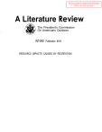 This file was created by scanning the printed publication. Errors identified by the software have been corrected; however, some errors may remain. A Literature Review The President’s Commission On Americans Outdoors INT4901 Publication #165 RESOURCE IMPACTS CAUSED BY RECREATION RESOURCE IMPACTS CAUSED BY RECREATION David N. Cole Systems for Environmental Management Missoula, Montana THE IMPORTANCE OF THE TOPIC The pursuit of recreational activities inevitably has an effect on the resource--vegetation, soil, wildlife, and water. Whether these impacts are considered to be positive or negative depends on the management objectives of the area affected. The severity of the positive or negative response, which dictates the acuteness of the need for mitigation measures, is also influenced by management objectives. Generally, the problems associated with a given level of impact increase as we move from the more urban and developed end of the recreational opportunity spectrum toward the primitive and wild end of the spectrum (Clark and Stankey 1979). Impact problems are particularly common in wilderness. Vegetation impacts on campsites are reported to be, a problem by managers of 71 percent of all wilderness areas. Soil impacts on trails are a problem in 61 percent of wilderness areas. Wildlife disturbance and water pollution are reported to be problems in 33 and 18 percent of wilderness areas, respectively (Washburne and Cole 1983). The reasons for concern about impacts are numerous. In wilderness and nature preserves, impacts compromise the objective of preserving natural conditions. Elsewhere impacts can make recreational areas and facilities less attractive, desirable, or functional. Loss of tree cover on campsites, erosion of trails, and attraction of pest wildlife species are examples. These impacts can substantially increase maintenance costs. Finally, onsite impacts can damage offsite areas, such as where erosion of off-road vehicle (ORV) trails causes siltation of streams. ISSUES, PROBLEMS, AND RECOMMENDATIONS From this literature review, the folIowing issues and problems seem particularly important: 1. The controversy between the strategies of concentrating or dispersing use particularly troublesome in dispersed use areas, especially wilderness. concentration and facility’ development are key strategies for minimizing impact in recreation areas (McEwen and Tocher 1976). In dispersed areas, however, concentration reduces solitude and leads to unacceptable levels of impact, human waste, water pollution, and bear encounter problems. Moreover, most facility development is deemed inappropriate. On the other hand, dispersal can lead to widespread proliferation of impacts. More guidance on the merits of dispersal or concentration in different situations is needed, particularly for wilderness. This will require more research on relationships between amount of use and site deterioration and rehabilitation, as well as experimentation with dispersal and concentration strategies. A Literature Review Management-l 2. Off-road vehicle impacts are particularly serious and difficult to manage. ORV impacts are particularly troublesome because impact potential is so high. Riders frequently seek out terrain that is particularly susceptible to impact and object to being confined to areas of concentrated use. We need more concensus on where ORV use is and is not appropriate. Then we need to experiment further with means of confining and mitigating ORV impacts where they are accepted. 3. Increased use of recreation areas during the off-season may be particularly detrimental to wildlife. Our understanding of wildlife impacts in general is insufficient. A primary concern should be given to evaluating the impacts of winter recreation use. 4. Our ability to rehabilitate impacted recreation sites is insufficient. Considerable time, money, and effort are being expended trying to rehabilitate damaged sites, but success has generally been poor. We lack the research base and personal experience (much rehabilitation work is done by untrained, short-term volunteers) to rehabilitate sites quickly and cost effectively. More basic research is needed on the impact process and how detrimental changes can be reversed. Rehabilitation efforts should also be given a higher priority; we need more experimentation, documentation, and communication of results. 5. Our ability and commitment to monitoring impacts are poor. Research has only been able to develop systems for monitoring the most obvious and readily observable impacts. Management seldom assigns monitoring a sufficiently high priority to ensure that it is conducted in a careful and systematic matter. Consequently, data collected are often of little or no value. Monitoring needs to be a higher priority task for recreation area managers. Only through monitoring can scarce resource management funds be efficiently allocated. 6. Research on recreational impacts has never been supported on a sustained basis. Nobody has ever been able to pursue a long-term career in this field. Consequently, the only research available tends to be short term and superficial in nature. This is inconsistent with the widely perceived importance of impact problems and the dozens of careers available in other recreation fields. Support for academic positions and positions with governmental research. organizations should be provided. This would encourage long-term and more significant research, promote transfer of technologies to managers, and improve the educational breadth of recreation managers. SUMMARY OF FINDINGS Of the four resources impacted by recreation, vegetation and soil have been studied much more frequently than wildlife, water, or air. Even for vegetation and soil, however, most studies have been rather cursory descriptive studies. Most descriptive studies fall into one of four categories. In the first category are studies of the effects of specific activities. Examples would be the 