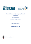 Theoretical Issues in Sign Language Research Conference 10 – 13 July 2013 University College London DELEGATE HANDBOOK TISLR is the research conference of the Sign Language Linguistics Society CONTENTS 2 3 4 5-7 7-9 9-10 11-12 13 14 16-18 Welcome TISLR committees General Information for delegates Programme Poster Session 1 Poster Session 2 Poster Session 3 UCL venue map and WiFi connection Local area and places to eat Delegate list TISLR 11 is hosted by University College London DCAL Centre (ESRC Deafness Cognition and Language Research Centre) 49 Gordon Square London WC1H 0PD, England Tel: +44(0)20 7679 8679 Fax: +44(0)20 7679 8691 Minicom: +44(0)20 7679 8693 E-mail: dcal@ucl.ac.uk Web: www.ucl.ac.uk/dcal We are very grateful to the National Science Foundation (Award No. BCS-1251849) and the National Technical Institute for the Deaf for their help with interpreting services and to our sponsors and contributors: Access to Work The Economic and Social Research Council The Embassy of Japan Fireco Gallaudet University Press John Benjamins Publishers Mocaplab Mouton de Gruyter National Science Foundation Rochester Institute of Technology Sieratzki Charitable Trust University College London Equality & Diversity Team Professor Bencie Woll FBA, Director University College London 49 Gordon Square 10 July 2013 London WC1H 0PD Tel: +44 (0)20 7679 8670 Fax: +44 (0)20 7679 8691 Minicom/Textphone: +44 (0)20 7679 8693 Web: www.dcal.ucl.ac.uk E-mail: b.woll@ucl.ac.uk TH THE 11 CONFERENCE ON THEORETICAL ISSUES IN SIGN LANGUAGE RESEARCH On behalf of DCAL, UCL, and London, welcome to TISLR XI! The first international conference on sign language research was held in Stockholm in 1979. Since then, this series of conferences which later became TISLR (and the official conference of the Sign Language Linguistics Society) has become the major international forum for sign language researchers. TISLR XI is the largest yet, with researchers from over 35 countries taking part. I would like to thank the members of the Scientific Committee, who reviewed an enormous number of high quality abstracts, the members of the Organising Committee, who have worked tirelessly since TISLR X, the Communication Support Team, and Claire Lister and the UCL Institute of Child Health (ICH) conference team. TISLR XI could not take place without the support of its sponsors (in alphabetical order): Access to Work, the Economic and Social Research Council, the Embassy of Japan, Fireco, Gallaudet University Press, John Benjamins Publishers, Mocaplab, Mouton de Gruyter, National Science Foundation, Rochester Institute of Technology, Sieratzki Charitable Trust, the Sign Language Linguistics Society, and University College London Equality and Diversity, and to those individuals who made personal donations. We hope you enjoy and benefit from the conference. We will do our best to make sure you have a great time – academically and socially - while you are here. Professor Bencie Woll FBA Director, DCAL Research Centre and Professor of Sign Language and Deaf Studies 2 TISLR 11 Organising Committees at UCL DCAL Planning Committee: Bencie Woll (Chair) Claire Lister Gary Morgan Manjula Patrick Christopher Stone Robin Thompson Summer School Committee: Kearsy Cormier Jordan Fenlon Neil Fox Eva Gutierrez Pamela Perniss Venue Committee: Elizabeth Graham Manjula Patrick Kate Rowley Volunteer Committee: Mischa Cooke Tanya Denmark Manjula Patrick Interpreting committee: Susan Booth Elizabeth Graham Christopher Stone Alan Wendt Programme Committee: Robert Adam Joanna Atkinson Kearsy Cormier Mairead Macsweeney Gary Morgan Christopher Stone Robin Thompson Bencie Woll Scientific Committee: Penny Boyes-Braem (Center for Sign Language Research, Basel, Switzerland) Carol Padden (University of California, San Diego, USA) Diane Brentari (University of Chicago, USA) Roland Pfau (University of Amsterdam, The Netherlands) Carlo Cecchetto (University of Milan, Bicocca, Italy) Jennie Pyers (Wellesley College, USA) David Corina (University of California, Davis, USA) Josep Quer (Universitat Pompeu Fabra, Spain) Onno Crasborn (Radboud University, The Netherlands) David Quinto-Pozos (University of Texas, Austin, USA) Paul Dudis (Gallaudet University, USA) Christian Rathmann (University of Hamburg, Germany) Karen Emmorey (San Diego State University, USA) Pawel Rutkowski (University of Warsaw, Poland) Elizabeth Engberg-Pedersen (University of Copenhagen, Denmark) Wendy Sandler (University of Haifa, Israel) Carlo Geraci (Institut Jean-Nicod, Paris, France) Markus Steinbach (University of Göttingen, Germany) Tommi Jantunen (University of Jyvaskyla, Finland) Ted Supalla (University of Rochester, USA) Terry Janzen (University of Manitoba, Canada) Rachel Sutton-Spence (University of Bristol, UK) Trevor Johnston (Macquarie University, Australia) Diane Lillo-Martin (University of Connecticut, USA) Gladys Tang (Chinese University of Hong Kong, Hong Kong) Gaurav Mathur (Gallaudet University, USA) Martha Tyrone (Haskins Laboratories, USA) Rachel Mayberry (University of California, San Diego, USA) Myriam Vermeerbergen (Lessius University College, Belgium) David McKee (Victoria University of Wellington, New Zealand) Virginia Volterra (Institute of Cognitive Sciences & Technologies, National Research Council, Italy) Richard Meier (University of Texas, Austin, USA) Ronnie Wilbur (Purdue University, USA) Johanna Mesch (Stockholm University, Sweden) Sherman Wilcox (University of New Mexico, USA) Ronice Müller de Quadros (Universidade Federal de Santa Catarina, Brazil) Ulrike Zeshan (University of Central Lancashire, UK) Adam Schembri (La Trobe University, Australia) Victoria Nyst (Leiden University, The Netherlands) 3 GENERAL INFORMATION: Registration & certificates Please sign in at registration on your first day of attendance only. Your personal Certificate of Attendance will be available at the Enquiries desk in the South Cloisters during break times. Social events All delegates are 