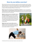 When you hear the word exercise, what comes to mind? If you’re like most people, “exercise” conjures images of people who are super fit and trim spending hours each day running and lifting weights at the gym. But let’s be honest – for most of us, this type of exercise routine is simply not practical or feasible. So, now is the time to erase those images of exercise from your mind. We’re going to broaden our perspective to think about physical activity in a whole new way. Myth #1: Exercise has to be vigorous to be beneficial for my health. The current recommendations actually emphasize accumulating moderate activity throughout the week. So, what is moderate activity? Anything that’s brisk enough to get your heart pumping and make you break a sweat but not so intense that you can’t still carry on a conversation. Myth #2: In order for exercise to be beneficial, I have to work out for a long time. You do not have to complete your physical activity in long sessions. Most days you will not be able to set aside 30-­‐60 minutes for exercise. That doesn’t mean you can’t fit physical activity into your life! You can break it up into bouts as short as 10 minutes and accumulate activity throughout the day this way. The key is to be creative and find ways to fit activity into your existing schedule. Myth #3: I have to go to a gym or fitness center to exercise. While public exercise facilities offer lots of great equipment, classes, and knowledgeable personnel, they are by no means a necessity. There are many things you can do at home with little or no equipment. © 2015 Physical Activity Intervention Research Laboratory, Kansas State University When we consider the three myths we have just debunked, a common theme emerges: physical activity does not have to be planned, structured activity that cuts into your busy schedule. While this is the way exercise is traditionally defined, physical activity is anything that gets your muscles working and your heart pumping. Engaging in physical activity during your leisure time is just one way to be active. You can also accumulate physical activity as part of your job, for transportation, or as part of your household and caregiving responsibilities. Always be thinking about the little things you can do to build more activity into your day. Here are a few ideas to get you started: v Do a free cable on-­‐demand workout for 10 minutes first thing in the morning v Put on your favorite music and dance around the house while you do chores v Check out some exercise DVDs at the local library and try a variety of programs to find out which you like the best v If you have a treadmill or elliptical at home, record your favorite TV shows and only allow yourself to watch them while you’re working out v Try an active video game v Walk or bike to work v Print as you go rather than waiting until you have a bunch of stuff to print at once; then send your documents to a network printer on the opposite side of your office/building v Keep athletic shoes at the office so you can go for a quick walk on your lunch break or whenever you need to clear your head v Stand up while you make/take phone calls v Do crunches or push-­‐ups after you send an email v Tear out the exercise pages from a fitness magazine and keep them all in a folder. Then pull a few pages out and try something different each day. v Set an alarm to go off every hour, and get up and move around for a few minutes every time the alarm goes off v Start a pedometer challenge with coworkers v Suggest walking/standing meetings at work © 2015 Physical Activity Intervention Research Laboratory, Kansas State University