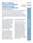 Outdated Publication, for historical use. CAUTION: Recommendations in this publication may be obsolete. Steps to a Healthier You: A Summary of the 2005 Dietary Guidelines for Americans and the Food Guide/MyPyramid Kansas State University Agricultural Experiment Station and Cooperative Extension Service Mary Meck Higgins, PhD, RD, LD, CDE Do you want to feel better today and stay healthy for tomorrow? Then read on. Following just some of the recommendations can have health benefits. Q. What are Dietary Guidelines? A. The Dietary Guidelines are designed to enhance the health of people over two years of age who have no chronic health conditions, and to reduce the future risk for many diseases (such as heart disease, certain kinds of cancer, stroke, type 2 diabetes and osteoporosis). They are revised every five years by the U.S. Department of Health and Human Services and the Department of Agriculture. Q. What is a healthy diet? A. A healthy diet emphasizes fruits, vegetables, whole grains, and fat-free or low-fat milk and milk products. It includes lean meats, poultry, fish, beans, eggs, nuts, seeds and small amounts of oils. It is low in saturated fats, trans fats, cholesterol, salt (sodium), added sugars and alcohol. Assistance programs can help people of all ages with limited resources buy groceries for a better diet. To find out more, call toll free 1-800-221-5689. Q. How can I make smart choices from every food group? A. Make half your grains whole. Vary your veggies. Focus on fruits. Get calcium-rich foods and beverages. Go lean with protein. Know the limits on fats, salt, added sugars and alcohol. Make these choices throughout the day, even when you eat out and are on the go. For instance, eat whole grains for breakfast. On a long commute or a shopping trip, pack fresh fruit, cutup vegetables, string cheese sticks or a handful of unsalted nuts. When grabbing lunch, have a sandwich on whole grain bread and a beverage without added sugars, such as low-fat or fat-free milk or water. In a restaurant, choose steamed, grilled or broiled dishes instead of fried foods. Fact Sheet The Dietary Guidelines and the Food Guide/MyPyramid encourage us to make wiser food and beverage choices, to eat fewer calories and to be more physically active. How can you do this? And why are these changes important for health? This publication contains questions and answers (Q and A) that summarize recent dietary advice. 1 Outdated Publication, for historical use. CAUTION: Recommendations in this publication may be obsolete. Look at how – and why – to follow the guidelines. Make half your grains whole. When choosing grains, select whole wheat breads, tortillas and cereals; brown or wild rice; oatmeal and popcorn. To determine if a food is whole grain, look for one of the following phrases or words first on the label’s ingredient list: whole wheat, oatmeal, whole oats, bulgur, graham flour, whole grain corn, whole rye, brown rice or wild rice. Foods may or may not be whole grain products if they are labeled with these words: multigrain, stone ground, 100% wheat, cracked wheat, seven grain or bran. Refined grains are not whole grains. Examples of refined grain products are enriched white flour, enriched white bread, degermed cornmeal and white rice. Refined grains have been milled, which removes the bran and germ, along with dietary fiber, iron and many B vitamins. Milling gives grains a finer texture and an improved shelf life. Most refined grains are enriched, which means that certain nutrients are added back. Fiber is not added back to enriched grains. Most adults should eat 3 to 4 ounce equivalents of whole grains and 5 to 8 ounce equivalents total of all grains, each day. In general, 1 slice of bread, 1 cup of ready-to-eat cereal or 1/2 cup of cooked rice, cooked pasta or cooked cereal can be considered as 1 ounce equivalent from the grains group. One large bagel or muffin is usually 3 or 4 ounce equivalents of grains. To control calories and eat more whole grains, substitute a whole grain for a refined grain product. For instance, eat whole wheat bread instead of white bread, or brown rice instead of white rice. Choose grain foods that are low in fats or oils, sodium and added sugars. Grains, especially whole grains, provide many nutrients vital for health. Grains are important sources of several B vitamins (thiamin, riboflavin, niacin and folic acid), minerals (iron, magnesium and selenium) and dietary fiber. Vary your veggies. Try to have several different kinds of vegetables each day. Vegetables may be raw or cooked; fresh, frozen, canned or dried; and may be whole, cut-up, mashed or juiced. Each week, choose dark green vegetables (such as romaine lettuce, broccoli and spinach), orange vegetables (such as carrots, sweet potatoes, pumpkin and winter squash), cooked dry beans and peas (such as lentils, split peas or kidney beans), starchy vegetables (such as white potatoes, corn and green peas) and other vegetables (such as tomatoes, green beans, cabbage and onions). Most adults should eat 2 to 3 cups of vegetables each day. In general, 1 cup of raw or cooked vegetables or vegetable juice, or 2 cups of raw leafy greens can be considered as 1 cup from the vegetable group. The healthiest choice for canned vegetables has no added salt. Go light on salad dressings and sauces or seasonings, which often add calories, fat and sodium to vegetable dishes. For better health, choose dark green and orange vegetables and cooked dry beans and peas more often. Also select highpotassium vegetables often, such as continued on page 4 2 Outdated Publication, for historical use. CAUTION: Recommendations in this publication may be obsolete. Q. What is MyPyramid? A. It is a logo to remind consumers to make healthy food choices and to be physically active every day. In 2005 it replaced the Food Guide Pyramid. It is intended to encourage people in the United States to eat a variety of foods in moderation and in the right pro