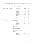 2011 GLOBAL SCHOOL-BASED STUDENT HEALTH SURVEY RESULTS Philippines Survey Public Use Codebook Data Location 17-17 18-18 19-19 Standard Variable Name Q1 Q2 Q3 Question Code and Label Country Question Number Q1 Q2 Q3 How old are you? 11 years old or younger 1 12 years old 2 Unweighted Frequency 20 Weighted Percent 0.5 205 5.7 3 13 years old 980 20.0 4 14 years old 1,350 22.0 5 15 years old 1,310 24.8 6 16 years old or older 1,384 27.0 Missing 41 What is your sex? Male 1 Female 2 2,279 49.5 2,986 50.5 Missing 25 In what grade are you? First Year 1 Second Year 2 1,246 28.9 1,832 26.2 3 Third Year 1,112 23.8 4 Fourth Year 1,037 21.1 Missing 20-23 Q4 Q5 How tall are you without your shoes on? (Note: Data are in meters.) 24-29 Q5 Q6 How much do you weigh without your shoes on? (Note: Data are in kilograms.) 30-30 Q6 Q7 During the past 30 days, how often did you go hungry because there was not enough food in your home? Never 1 63 1,858 33.3 2 Rarely 1,292 27.2 3 Sometimes 1,742 32.7 4 Most of the time 250 4.4 5 Always 125 2.4 Missing 23 1 2011 GLOBAL SCHOOL-BASED STUDENT HEALTH SURVEY RESULTS Philippines Survey Public Use Codebook Data Location 31-31 Standard Variable Name Q7 Country Question Number Question Code and Label Q8 During the past 30 days, how many times per day did you usually eat fruit, such as bananas, mangoes, or papayas? I did not eat fruit during the 1 past 30 days Less than one time per day 2 Q8 Q9 Q9 Q10 266 5.3 1,386 25.5 1 time per day 1,635 30.9 4 2 times per day 980 19.2 5 3 times per day 593 12.0 6 4 times per day 128 2.5 7 5 or more times per day 210 4.7 During the past 30 days, how many times per day did you usually eat vegetables, such as tomatoes, kangkong, cabbage, or stringbeans? I did not eat vegetables 1 during the past 30 days Less than one time per day 2 1 time per day 3 4 2 times per day 5 6 7 92 253 5.5 769 14.6 1,569 27.8 1,398 26.2 3 times per day 823 16.3 4 times per day 121 2.8 5 or more times per day 335 6.9 Missing 33-33 Weighted Percent 3 Missing 32-32 Unweighted Frequency During the past 30 days, how many times per day did you usually drink carbonated soft drinks, such as Coke or Pepsi? I did not drink carbonated 1 soft drinks during the past 30 days Less than one time per day 2 22 503 8.6 2,747 49.5 1,044 20.1 3 1 time per day 4 2 times per day 585 12.9 5 3 times per day 240 5.2 6 4 times per day 59 1.4 7 5 or more times per day 93 2.2 Missing 19 2 2011 GLOBAL SCHOOL-BASED STUDENT HEALTH SURVEY RESULTS Philippines Survey Public Use Codebook Data Location 34-34 35-35 Standard Variable Name Q10 Q11 Country Question Number Question Code and Label Unweighted Frequency Weighted Percent Q11 During the past 7 days, on how many days did you eat food from a fast food restaurant, such as McDonalds, Jollibee, or Pizza restaurants? 0 days 1 3,096 54.8 Q12 2 1 day 1,406 28.3 3 2 days 402 8.8 4 3 days 194 4.3 5 4 days 64 1.4 6 5 days 55 1.4 7 6 days 10 0.2 8 7 days 43 0.8 Missing 20 During the past 30 days, how many times per day did you usually clean or brush your teeth? I did not clean or brush my 1 teeth during the past 30 days Less than 1 time per day 2 1 time per day 3 Q12 Q13 1.0 111 2.1 402 7.2 4 2 times per day 1,706 31.8 5 3 times per day 2,660 50.8 6 4 or more times per day 357 7.0 Missing 36-36 42 During the past 30 days, how often did you wash your hands before eating? Never 1 Rarely 2 12 43 0.8 104 2.3 642 12.6 Most of the time 1,151 21.7 Always 3,310 62.6 Missing 40 3 Sometimes 4 5 3 2011 GLOBAL SCHOOL-BASED STUDENT HEALTH SURVEY RESULTS Philippines Survey Public Use Codebook Data Location 37-37 38-38 39-39 Standard Variable Name Q13 Q14 Q15 Question Code and Label Country Question Number Q14 Q15 Q16 During the past 30 days, how often did you wash your hands after using the toilet or latrine? Never 1 Unweighted Frequency Weighted Percent 57 1.0 99 1.8 2 Rarely 3 Sometimes 452 7.6 4 Most of the time 671 12.3 5 Always 3,974 77.3 Missing 37 During the past 30 days, how often did you use soap when washing your hands? Never 1 Rarely 2 53 1.0 130 2.7 808 14.7 Most of the time 1,314 25.1 Always 2,969 56.6 Missing 16 3 Sometimes 4 5 During the past 12 months, how many times were you physically attacked? 0 times 1 1 time 2 3,555 66.9 768 14.8 3 2 or 3 times 593 11.4 4 4 or 5 times 161 3.0 5 6 or 7 times 59 1.3 6 8 or 9 times 25 0.4 7 10 or 11 times 20 0.3 8 12 or more times 83 1.8 Missing 26 4 2011 GLOBAL SCHOOL-BASED STUDENT HEALTH SURVEY RESULTS Philippines Survey Public Use Codebook Data Location 40-40 41-41 Standard Variable Name Q16 Q17 Question Code and Label Country Question Number Q17 Q18 During the past 12 months, how many times were you in a physical fight? 0 times 1 1 time 2 Q18 Q19 Weighted Percent 3,470 63.4 1,010 20.8 3 2 or 3 times 533 11.3 4 4 or 5 times 122 2.5 5 6 or 7 times 67 1.4 6 8 or 9 times 13 0.2 7 10 or 11 times 6 0.1 8 12 or more times 21 0.3 Missing 48 During the past 12 months, how many times were you seriously injured? 0 times 1 1 time 2 2,518 51.8 1,281 29.4 3 2 or 3 times 584 13.4 4 4 or 5 times 119 2.6 5 6 or 7 times 46 1.0 6 8 or 9 times 26 0.7 7 10 or 11 times 14 0.3 8 12 or more times 36 0.8 Missing 42-42 Unweighted Frequency During the past 12 months, what was the most serious injury that happened to you? I was not seriously injured 1 during the past 12 months I had a broken bone or a 2 dislocated joint I had a cut or stab wound 3 I had a concussion or other 4 head or neck injury, was knocked out, or could not breathe I had a gunshot wound 5 6 7 8 I had a bad burn I was poisoned or took too much of a drug Something else happened to me Missing 666 3,650 73.0 250 5.5 266 7.0 101 2.4 12 0.3 15 0.4 8 0.1 563 11.3 425 5 2011 GLOBAL SCHOOL-BASED STUDENT HEALTH SURVEY RESULTS Philippines Survey Public Use Codebook Data Location 43-43 44-44 Standard Variable Name Q19 Q20 Country Question Number Question Code and Label Q20 During the past 12 months, what was the major cause of the most serious injury that happened to you? I was not 