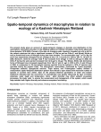 International Research Journal of Biochemistry and Bioinformatics Vol. 1(4) pp. 084-088, May, 2011 Available online http://www.interesjournals.org/IRJBB Copyright © 2011 International Research Journals Full Length Research Paper Spatio-temporal dynamics of macrophytes in relation to ecology of a Kashmir Himalayan Wetland Sameera Siraj, A.R.Yousuf and M. Parveen* Centre of Research for Development (CORD) *P.G. Department of Zoology The University of Kashmir, Srinagar, J&K, India, 190006 Accepted 26 May, 2011 The present study gives an account of spatio-temporal changes in diversity and distribution of the macrophytic community structure in the Shalbug wetland of Kashmir Himalaya, India during about last three decades (1978-2006). Perusal of the data on changing water chemistry revealed not only a shift in the cationic spectrum but also a significant increase in Total as well as Ortho-P, and Nitrate, Nitrite as well as Ammonical forms of Nitrogen during last three decades. The concentration (mgl-1) of Ca, Mg, Na and K has respectively changed from an average of 24.2, 4.4, 1.9 and 0.9 in 1978 to 109, 41, 16 and 5 in 2006. Moreover, while the average Total P has increased from 227µg/l in 1978 to 250 µg/l in 2006, the Ortho-P during the same period increased from 32.2 µg/l to 43 µg/l. The Nitrate, Nitrite and Ammonical forms of Nitrogen have increased respectively from 128, 6.7 and 6.1 µg/l in 1978 to 374, 16 and 219 µg/l in 2006. In comparison to 20 macrophytic species reported from the wetland in 1978, 27 species were recorded during the present study. The macrophytic communities, dominated by Typha angustata, Phragmites australis, Sparganium erectum, Trapa natans, and Potamogeton natans, showed a characteristic spatio-temporal distribution pattern from littoral to open waters with maximum number of species in summer than winter. Data on the physico-chemical parameters of water and bottom sediments indicated that the occurrence of macrophytes was greatly influenced by type of bottom substrate, water depth and temperature. Since plant diversity may affect wetland ecosystem processes, the study calls to ensure the conservation and management of the system, which would help maintain both higher diversity and enhance ecosystem functioning. Key words: Kashmir Himalaya, Macrophytes, Shalbug wetland, Water chemistry, spatio-temporal, substrate. INTRODUCTION Macrophytes comprise an important component of aquatic biota, especially in nutrient rich wetland ecosystem (Seabloom 2003), contributing significantly towards primary production and influencing various hydro-chemical processes. In addition, macrophytes also serve as a complex habitats which offer support, protection and food to aquatic fauna. (Raspapov et al 2002; Tessier et al, 2004). Aquatic macrophytes are highly important to invertebrates as substrates for periphyton and epiphytic food, refuges from predation, heterogeneous substrates for co-existence, and upon senescence and death as detrital food sources. Besides, *Corresponding author Email: pzsameera@gmail.com the presence of submerged macrophytes, serves as an important constituent of food for fish community (Yousuf and Firdous ,2001; Crowder et al 1982 ), for avifauna (Pandit 1982). The pattern of aquatic plant species diversity and distribution has been related to water chemistry by a number of previous studies as well (Spence 1967; Seddon 1972; Kadono 1982; Heegaard et al 2001). Moreover, distribution of species in a plant community in a habitat is also determined by changes in water level and depth (Hudon et al 2004), substrate composition and interactions with other plant or animal communities (Leslie et al. 1983). Some information has been generated over the years on ecology, species composition and production of macrophytes in various waterbodies of the Kashmir valley (Rather et al., 2007; Wani et al., 2007; Mahdi et al., Siraj et al. 085 MATERIAL AND METHODS 25 X 25 cm2 in case of the low growing emergent and ground layer species and 1 X 1 m2 in case of the tall growing emergent species. However, the rooted-floating leaf types and submerged macrophytic species were collected using Ekman dredge (Welch, 1948). The same protocol was followed for sampling the macrophytes during the present study. The species composition at present in the wetland was worked out during March 2005 to Feberuary 2006. Every month 10 quadrats of 25 × 25 cm were laid randomly in each of the well differentiated vegetational zones of the wetland. The macrophytes occurring in each quadrat were collected and identified to determine their species wise list. The individuals of each species were counted to work out their abundance. Study area and sampling sites Water Analysis Shalbug wetland (Figure 1), situated in the deltaic region of the Sindh Nallah, about 18 km from Srinagar to the west of the Anchar Lake is an important aquatic ecosystem of Kashmir Himalaya. It harbours rich diversity of resident and migratory avifaunal species as well as macrophytes of high socioeconomic importance. The water body is under myriad anthropogenic perturbations that threaten its survival and the problem is exacerbated by heavy silt load brought into it through various feeding channels from the Sindh Nallah. Six sampling sites were selected in the wetland. Site W1 was chosen from the Shalbug Nallah, Site W2 from the open water area of the wetland having rich population density of submerged macrophytes, Site W3 near the inlet from the Anchar Lake, Site W4 was located in rooted floating leaf type vegetation zone, Site W5 was located at the outlet connected with the Sindh stream and Site W6 was located in emergent vegetation zone. The sampling was carried out on monthly basis for a period of one year (Dec 2004- Nov 2005). Water samples were analyzed in accordance with APHA(1998), Mackereth (1973) and Council of Scientific and Industrial Research (CSIR) (1974). 2007). However, with regard to Shalbug wetland just a few stu
