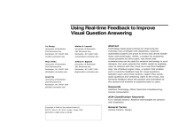 Using Real-time Feedback to Improve Visual Question Answering Yu Zhong Walter S. Lasecki Abstract University of Rochester University of Rochester 252 Elmwood Ave. 252 Elmwood Ave. Rochester, NY 14627 USA Rochester, NY 14627 USA zyu@cs.rochester.edu wlasecki@cs.rochester.edu Phyo Thiha Jeffrey P. Bigham University of Rochester University of Rochester 252 Elmwood Ave. 252 Elmwood Ave. Rochester, NY 14627 USA Rochester, NY 14627 USA pthiha@cs.rochester.edu jbigham@cs.rochester.edu Technology holds great promise for improving the everyday lives of people with disabilities; however, automated systems are prone to errors and cannot handle many real-world tasks. VizWiz, a system for answering visual questions for blind users, has shown that crowdsourcing can be used for assistive technology in such domains. Our work extends the VizWiz model by enabling users to interact with the crowd via a real-time feedback loop. We introduce Legion:View, a system that enables such a real-time feedback loop for visual questions between users and crowd workers. Legion:View sends audio questions and streaming video to the crowd, and forwards feedback about the position and orientation of the camera and answers to questions back to users. Grant He University of Rochester 252 Elmwood Ave. Rochester, NY 14627 USA ghe3@u.rochester.edu Keywords Assistive Technology, Blind, Real-time Crowdsourcing, Human Computation ACM Classification Keywords K.4.2 [Social Issues]: Assistive technologies for persons with disabilities Copyright is held by the author/owner(s). General Terms CHI’12, May 5–10, 2012, Austin, Texas, USA. Human Factors, Design ACM 978-1-4503-1016-1/12/05. Instructions are likely on the other side of the box. … Box is mostly out of frame to the right. … Preheat to 400, remove from box, cover edges with foil and put on tray, cook 70 minutes Figure 1. Sequence of pictures taken with VizWiz to answer the question “How do I cook this?” Each question submission was answered quickly, but it took the crowd workers about 10 minutes to help the user frame the right part of the box before answering the question. Introduction One role of assistive technology (AT) is to help people with disabilities interpret the world around them. This often requires solving complex Artificial Intelligence (AI) problems, such as computer vision, which machines cannot yet do reliably and accurately. One approach for achieving the promise of AT now is to have a dynamic group of workers available on-demand, which has proven to be a valuable tool for developing deployable AT systems. Using the crowd leverages human computation to handle problems that automated methods cannot yet reliably solve. Workers can be recruited at low cost from services such as Amazon’s Mechanical Turk or CrowdFlower. This allows those developing AT to provide affordable systems without having to wait for AI research to reach a stage where it is able to solve all of the necessary problems. VizWiz [2] is a mobile application that enables users to ask questions about their visual environment by first taking a picture, then recording an image and submitting it to the crowd, their social network, or an automated image recognition system. Answers from workers are then forwarded directly back to the user. Figure 1 shows that even though individual answers are obtained quickly, answering sequences of questions can be time consuming. In this paper, we describe Legion:View, a system designed to provide real-time answers and feedback to audio questions about a user’s visual environment. Unlike VizWiz, Legion:View forwards a video stream to crowd workers, allowing for real-time guidance in taking pictures and for follow-up audio questions to be submitted. This avoids the need to resubmit questions and re-recruit workers in the event of a problem with the image or audio. It also means that subsequent questions are distributed to workers with knowledge of the domain and task. We first describe the design of the system and its current implementation, followed by preliminary usability tests. We conclude with a discussion of our findings on how workers interact with Legion:View, and future work to extend the system in navigation tasks. until they choose to take the picture. Machine vision is used to identify the primary object in the initial frame, then track it as the user zooms out, giving the user audible cues to follow in order to keep it centered in the frame. Legion:View uses a similar approach to cue the user, but does not rely on machine vision, which is prone to losing track of the object, and cannot tell if appropriate information is being captured in the frame. Design Background Legion [3] was the first system to engage crowd workers in a closed-loop fashion, and perform continuous tasks in real-time. This is accomplished by creating a virtual network computing (or remote desktop) style interface with the crowd. Multiple workers are shown a video stream of the interface and all contribute input simultaneously. Legion then aggregates their input in real-time using an input mediator and forwards it back to the user’s interface as a single control stream. Legion:View uses this model, but implements an input mediator that is customized to handle the two classes of worker input separately. VizWiz [2] used the quikTurKit script for TurKit [4] to maintain a queue of workers who completed older tasks until a new one was submitted. This effectively sped up the response time by increasing the number of workers available. This method of engaging workers inspired the closed-loop approach used in Legion. Adrenaline [1] shows that these crowds can be recruited in less than two seconds and kept around until a task is ready. EasySnap [6] is an application that helps blind users take photographs by first having them frame the image at close range, then move progressively farther away In order to improve on visual question answering for blind users, Legion:View adds th