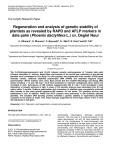International Research Journal of Plant Science Vol. 1(3) pp. 048-055, septembre 2010 Available online http://www.interesjournals.org/IRJPS Copyright © 2010 International Research Journals Full Length Research Paper Regeneration and analysis of genetic stability of plantlets as revealed by RAPD and AFLP markers in date palm (Phoenix dactylifera L.) cv. Deglet Nour A. Othmani1, S. Rhouma1, C. Bayoudh2, R. Mzid4, N. Drira3 and M. Trifi1 1 Laboratoire de Génétique moléculaire, Immunologie et Biotechnologie, Faculté des Sciences de Tunis, 2092- ElManar Tunis, Tunisia 2 Laboratoire de Culture in vitro, Centre Régional de Recherches en Agriculture Oasienne, 2260 Degache- Tunisia 3 Laboratoire des Biotechnologies Végétales Appliquées à l’amélioration des cultures, Faculté des Sciences de Sfax, B.P. 802, 3018 Sfax, Tunisia 4 Laboratoire de physiologie moléculaire des plantes, Centre de Biotechnologie de Borj Cédria, 01 Hammam-Lif. Tunisia. Accepted 6 August 2010 The 2,4-Dichlorophenoxyacetic acid (2,4-D) induced somatic embryogenesis of Tunisian date palm (Phoenix dactylifera L.) cultivar, Deglet Nour and analysis of the true-to-type conformity of the derived plantlets were investigated in this study. For this purpose, two polymerase chain reaction (PCR)-based methods namely, randomly amplified polymorphic DNA (RAPD) and amplified fragment length polymorphism (AFLP) markers were used. Data proved that the modified Murashige and Skoog (MS) -1 media including 1, 10 and 100 mg.l 2,4-D have permitted an intensive callogenesis when leaves are incubated in dark. Subcultures on MS medium supplemented with 0.1 mg.l-1 2,4-D stimulated a rapid maturation of somatic embryos in light. A mean of 120 somatic embryos were developed from 0.5 mg callus within 3 months. Embryos germination and conversion to plantlets were successfully achieved after transfer to free plant growth regulators MS medium. On the whole, 75% plantlets survival was established in soil. In addition, RAPD and AFLP analysis were performed in 180 randomly selected plantlets. The resultant DNA banding profiles exhibited a genetic stability of regenerated plantlets compared to the plants of origin. This result strongly supported the true-to-type nature of the in vitro derived plants in date palm. Keywords: 2,4-D, Date palm, plant regeneration, somatic embryogenesis. INTRODUCTION The date palm (Phoenix dactylifera L.), (2n = 36), an *Corresponding author : degletbey@yahoo.fr Abbreviations: 2,4-D: 2,4-Dichlorophenoxyacetic acid AFLP: Amplified fragment length polymorphism; IBA: Indole-3-Benzylaminopurin; RAPD: Random Amplified Polymorphic DNA out-breeding heterozygous dioecious perennial monocot. This fruit crop is of great importance in the oases development not only for date production but also for the maintenance of socio-economical and environmental stability of the arid areas in North Africa and the Middle East (Zaid and De Wet 1999). Due to its out-breeding and heterozygous nature, date palm progenies consisted of 50% of male trees and 50% of females that are not true-to-type (Carpenter and Ream 1976). Therefore, its conventional propagation is made by offshoots. However, this method is very limited in Othmani et al. 049 Table 1: Composition of media used for date palm in vitro regeneration -1 Meduim composition (mg l ) MS salts MS vitamins Fe-EDTA Sucrose Myo-inositol Glycine Glutamine KH2PO4 Adenine Difco agar 2,4-D Activated charcoal time and in number to establish new date palm plantations. Moreover, several genotypes did not produce offshoots and those issued from other cultivars are difficult to root. In addition, seed-propagation palms do not bear true to type and required up to seven years before fruiting stage. In order to overcome these hybridization difficulties, in vitro tissue culture multiplication methods have provided alternative strategy either for mass propagation of elite cultivars or for date palm improvement. For instance, somatic embryogenesis is reported to be a relatively consistent strategy for genetically homogeneous plant micropropagation (Kanita and Kothari 2002). It should be stressed that the process of in vitro propagation via tissue culture may cause genetic and epigenetic alterations inducing somaclonal variation (Kaeppler et al. 2000). For example, variegation, variation in leaf structure and in overall plant growth pattern, trees that do not form inflorescences, or trees that produce seedless parthenocarpic fruits (McCubbin et al. 2000). Most of these phenotypes are detected in the early stages of plant growth, while some off-types can only be detected in the field, several years after planting (Cohen et al. 2004). Conformity of the derived plants constitutes the main criteria for large scale use particularly for new groves establishment. Therefore, certification of the derived plants’ conformity is required. For this purpose, the use of the Williams et al. (1990) random amplified polymorphic DNA (RAPD) and the Vos et al. (1995) amplified fragment length polymorphism (AFLP) methods have been reported as reliable, quick and inexpensive procedures to identify clones and cultivars and to assess somaclonal variation in date palm (Trifi et al. 2000; Saker et al. 2006; Bekheet et al. 2007; Rhouma et al. 2008; Othmani 2010). The present study portrays the achievement of the in vitro propagation of the Tunisian date palm elite cultivar, Deglet Nour, through somatic embryogenesis M1 4,568 1 65 50,000 100 2 100 120 30 7,000 0 300 M2 4,568 1 65 50,000 100 2 100 120 30 7,000 1 300 M3 4,568 1 65 50,000 100 2 100 120 30 7,000 10 300 M4 4,568 1 65 50,000 100 2 100 120 30 7,000 100 300 and the assessment of somatic embryo derived plants certification using RAPD and AFLP markers. MATERIALS AND METHODS Plant material Juvenile leaves of 1-3 cm in length sampled from 20 years old date palm plants (Phoenix dactylifera L. cv. Deglet Nour) were used. These were randomly collected from trees growing in plantati
