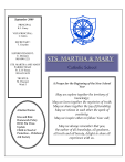 September 2009 PRINCIPAL K.J. Carey VICE-PRINCIPAL: C. Klein SECRETARY: T. Crayden SUPERINTENDENT: E. McGuire 905-890-1221 STS. MARTHA AND MARY PARISH TEAM: Fr. E. D’Souza 905-625-5670 TRUSTEE: M. Pascucci Ward 3 Attached Forms: Kiss and Ride Homework Policy H1N1 Flu Virus Update Child in Need of Protection – Children’s Aid Society STS. MARTHA & MARY Catholic School 1760 Bough Beeches Blvd., Mississauga, Ontario L4W 2B9 905-624-9625 A Prayer for the Beginning of the New School Year May we explore together the territory of knowledge; May we learn together the mysteries of truth; May we share together the joy of friendship; May we release in each other the spark of creativity; May we inspire others to follow Your call; May we always remember that you, the author of all knowledge, all goodness, all truth and all beauty, delight to share all experience with us. A SCHOOL HOURS Sts. Martha and Mary school hours for the 2008-2009 school year remain as before: Grades 1 - 8 Lunch JK/SK 9:00 - 12:00 12:00 - 1:00 1:00 - 3:30 9:00 - 11:30 1:00 - 3:30 STUDENT ABSENCES As in the past, we ask that you call the school on the days your child will be absent. This is a safety precaution that can save precious moments should there ever be an emergency situation. We thank you for your continued support in following this procedure. Upon reaching the school answering service, please leave the following information: a) Date of absence b) Student's full name c) Grade level and teacher d) Reason for absence e) Date of return Please continue to call on each day that your child is absent. When your child returns to school, please provide the teacher with a note regarding the specific reason for the absence. Attendance Line:905-624-9625 ext 1 PROFESSIONAL ACTIVITY DAY Friday, September 18, 2009 is a Professional Activity Day. Students do not attend school on this day. Teachers will be involved in Adult Faith Development and reorganization of classes if necessary. PICTURE DAY Wednesday, September 23, 2009 is Picture Day for all students at Sts. Martha and Mary School. Pictures will be returned in plenty of time for Christmas. PRINCIPAL’S MESSAGE As this new school year begins, I would like to extend a very warm welcome to all the new and returning families in our school community and to welcome all those returning to Sts. Martha and Mary School and to introduce myself as your new school administrator. A special greeting is also extended to our Junior Kindergarten children who are starting school for the first time. We are fortunate to welcome our returning staff members. Many have worked diligently over the summer months in various educational capacities such as, taking courses, attending summer institutes and setting up classrooms for the new school year. We are pleased to announce the return of Mrs. Boots and Mrs. Ciccolini to the teaching faculty. We welcome, Ms. Daly to the French as a Second Language Department. Our custodial staff, Mr. Criminale,Mr. Massis and Mr. Barberan, who diligently prepared the school for your children. My heartfelt appreciation is extended to them and each of the educational and administrative staff who have truly extended themselves in preparing the school for another year of academic challenges. As we anticipate the successes of the year ahead, I encourage you to remember that each success will be the result of the mutual support and respect we as parents and educators show one another. It is very important that the reputation of positive relationships of the past continue throughout the upcoming year. As our students mature we are reminded that their beliefs, ideals and sense of responsibility, friendship and family are constantly challenged and the common language and support we share as role models in their lives will impact greatly on their values. Our school community is strengthened through our partnerships, none being more important than our parish team and our active School Council. Our students respond respectfully and eagerly to each faith and school initiative; this can only be attributed to the values modeled by their parents. The staff of Sts. Martha and Mary School is happily committed to working with its partners to continue to support each child in their quest for knowledge, happiness and spiritual development. All my best for a wonderful school year God Bless. K.J. Carey Principal CURRICULUM NIGHT Please join us at Sts. Martha and Mary on the evening of Thursday, September 24, 2009 for a community barbeque and Curriculum Night. Classroom visits begin at 7 pm. Mark this date on your calendars and plan to attend this great kick-off to the new school year! More information will follow. Our Virtue for September….Faith To begin the new school year, we’ll focus our attention on the first of our virtues – faith. Faith is the great virtue of believing in God and trusting that God is with us. A faithful person believes that we are created, guided by and destined to be reunited with God. A faithful person believes that God’s plan for us includes the right to be safe, especially at school. A Faithful person… • Prays regularly and reverently • Learns from Scripture stories • Honours people’s God-given names • Assumes that there is good in everyone • Accepts the God-given worth of themselves and others Gracious and merciful God of all creation, You have loved us since before we were born. From our mothers’ wombs to our eternal place in heaven You have given us the gifts to live and grow in safety. We come to You now asking for the grace and strength to follow Your plan and to form a safe, caring, inclusive community here at Sts. Martha and Mary Catholic School. May our faith in You and Your plan lead us to know and feel Your presence among us. We ask this in name of Jesus, Your Son, who lived to show us Your way. Amen. OUR STAFF AS OF SEPTEMBER 18, 2009 Grade Teacher Room Number JK AM SK JK/SK 1 1 2 2 3 3/4 4 5 5 6 6 7 7 8 8 SERC S. Tannus 102 M. Fl