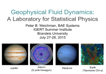 Geophysical Fluid Dynamics: A Laboratory for Statistical Physics Peter B. Weichman, BAE Systems IGERT Summer Institute Brandeis University July 27-28, 2015 Jupiter Saturn (S pole hexagon) Neptune Earth (Tasmania Chl-a) Global Outline 1. Statistical Mechanics, Hydrodynamics, and Geophysical Flows (introduction & overview) 2. Statistical mechanics of the Euler equation (technical details & some generalizations) 3. Survey of some other interesting problems (shallow water dynamics, magnetohydrodynamics, turbulence in ocean internal wave systems) General Theme: Seeking beautiful physics in idealized models (And hoping that it still teaches you something practical!) Part 1: Statistical Mechanics, Hydrodynamics, and Geophysical Flows http://nssdc.gsfc.nasa.gov/image/planetary/jupiter/gal_redspot_960822.jpg Outline (Part 1) 1. 2. 3. 4. 5. 6. The Great Red Spot and geophysical simulations Euler’s equation and conservation laws Relation to 2D turbulence: inverse energy cascade Thermodynamics and statistical mechanics Equilibrium solutions Laboratory experimental realizations: Guiding center plasmas 7. Geophysical comparisons: Jovian and Earth flows Target Name: Jupiter Spacecraft: Voyager Produced by: NASA Cross Reference: CMP 346 Date Released: 1990 http://www.solarviews.com/cap/jup/vjupitr3.htm HUBBLE VIEWS ANCIENT STORM IN THE ATMOSPHERE OF JUPITER When 17th-century astronomers first turned their telescopes to Jupiter, they noted a conspicuous reddish spot on the giant planet. This Great Red Spot is still present in Jupiter's atmosphere, more than 300 years later. It is now known that it is a vast storm, spinning like a cyclone. Unlike a low-pressure hurricane in the Caribbean Sea, however, the Red Spot rotates in a counterclockwise direction in the southern hemisphere, showing that it is a high-pressure system. Winds inside this Jovian storm reach speeds of about 270 mph. The Red Spot is the largest known storm in the Solar System. With a diameter of 15,400 miles, it is almost twice the size of the entire Earth and one-sixth the diameter of Jupiter itself. The long lifetime of the Red Spot may be due to the fact that Jupiter is mainly a gaseous planet. It possibly has liquid layers, but lacks a solid surface, which would dissipate the storm's energy, much as happens when a hurricane makes landfall on the Earth. However, the Red Spot does change its shape, size, and color, sometimes dramatically. Such changes are demonstrated in highresolution Wide Field and Planetary Cameras 1 & 2 images of Jupiter obtained by NASA's Hubble Space Telescope, and presented here by the Hubble Heritage Project team. The mosaic presents a series of pictures of the Red Spot obtained by Hubble between 1992 and 1999. Astronomers study weather phenomena on other planets in order to gain a greater understanding of our own Earth's climate. Lacking a solid surface, Jupiter provides us with a laboratory experiment for observing weather phenomena under very different conditions than those prevailing on Earth. This knowledge can also be applied to places in the Earth's atmosphere that are over deep oceans, making them more similar to Jupiter's deep atmosphere. Image Credit: Hubble Heritage Team (STScI/AURA/NASA) and Amy Simon (Cornell U.). http://nssdc.gsfc.nasa.gov/photo_gallery/photogallery-jupiter.html Voyager 2 (1989) images of Neptune’s Great Dark Spot, with its bright white companion, slightly to the left of center. The small bright Scooter is below and to the left, and the second dark spot with its bright core is below the Scooter. Strong eastward winds -- up to 400 mph -- cause the second dark spot to overtake and pass the larger one every five days. The spacecraft was 6.1 million kilometers (3.8 million miles) from the planet at the time of camera shuttering. http://nssdc.gsfc.nasa.gov/photo_gallery/photogallery-neptune.html Jupiter’s Great Red Spot A theorist’s/simulator’s cartoon -plane approximation: • Shear boundary conditions • Coriolis force • Weather bands MODEL: (Marcus, Ingersol,…) Two-dimensional inviscid Euler equation (Why? Why not!) P. Marcus simulations: dipole initial condition http://www.me.berkeley.edu/cfd/videos/dipole/dipole.htm http://www.me.berkeley.edu/cfd/videos/dipole/dipole.htm Initial condition: _ O O Two blobs of opposite vorticity, + and Turbulent cascade + t Final condition: + blob survives, appears stable O - blob disperses O Basic question: Dynamical Stability ? Statistical equilibrium Vortex Hamiltonian? Ergodicity? YES! Sometimes! P. Marcus simulations: perturbed ring initial condition http://www.me.berkeley.edu/cfd/videos/ring/ring.htm http://www.me.berkeley.edu/cfd/videos/ring/ring.htm The Euler equation Coriolis force Basic inviscid Euler Driving and Dv ( r , t ) 2 p(r, t ) f (r ) zˆ v(r, t ) v(r, t ) f (r, t ) dissipation Dt D v (r , t ) - Convective derivative Dt t v (r , t ) - Velocity field - Pressure field p (r , t ) 1 E dr (r, t ) | v(r, t ) |2 - Kinetic energy 2 ω(r, t ) v(r, t ) - Vorticity field (scalar in d=2) f (r ) 2 E sin( L ) - Coriolis parameter (rotating coordinate system) - Viscosity F( r , t ) - Driving force, often stochastic Constraints and Conservation Laws Determines pressure field p(x,t) Implies existence of stream function: (a) Incompressibility: v(r, t ) 0 v(r, t ) (r, t ) ( y , x ) [ (r, t ) const.] (r, t ) 2 (r, t ) (b) Angular momentum: L dr r v(r, t ) (axially symmetric domains) 1 2 d r r (r, t ) (boundary term) 2 (c) Energy: 1 E dr | v(r, t ) |2 2 1 dr dr ' (r, t )G (r, r ' ) (r ' , t ) 2 Analogy: Vorticity ↔ Charge density 2D Coulomb Green function 2G (r, r ' ) (r r ' ) ( bdy conds ) G (r, r ' ) 1 | r r'| , | r r ' | 0 ln 2 R0 More constraints and Conservation Laws (d) → () All powers of the vorticity! Dv(r, t ) p(r, t ) Dt v(r, t ) 0 Vorticity is D ( r , t ) 0 freely self Dt advecting n dr (r , t ) n d n D (r , t ) dr (r , t ) n 1 0 dt Dt Convenient parametrization: 0, x 0 G ( ) dr [ (r, t )], ( x) 1, x 0 Alternate form: More