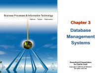 Chapter 3 Database Management Systems PowerPoint Presentation by Charlie Cook Copyright © 2004 South-Western. All rights reserved. Learning Objectives • To describe and analyze major approaches used to process data related to business events • To describe major business events in merchandising, service and manufacturing firms • To explain complexities and limitations of using traditional data management approaches • To recognize the advantages of using the database approach to data management • To be able to perform basic processes involved in database design and implementation Copyright © 2004 South-Western. All rights reserved. 3–2 Event-Driven Approach • Raw data is captured as events occur. • Minimum data to be collected/stored: Who What Where When • Data can be aggregated to meet user requirements. Copyright © 2004 South-Western. All rights reserved. 3–3 Overview of Order-to-Sales Process for a Merchandising or Manufacturing Firm FIGURE 3.1 Copyright © 2004 South-Western. All rights reserved. 3–4 Overview of Order-to-Sales Process for a Service Firm FIGURE 3.2 Copyright © 2004 South-Western. All rights reserved. 3–5 Managing Data Files • Character A basic unit of data (e.g., number) • Field A collection of related characters (e.g., customer name) • Record A collection of related data fields • File A collection of related records Copyright © 2004 South-Western. All rights reserved. 3–6 Data Maintenance: Add Customer Record FIGURE 3.3a Copyright © 2004 South-Western. All rights reserved. 3–7 Data Maintenance: Add Customer Record (cont’d) FIGURE 3.3b Copyright © 2004 South-Western. All rights reserved. 3–8 Business Event Data Processing: Enter Customer Order FIGURE 3.4 Copyright © 2004 South-Western. All rights reserved. 3–9 Applications-based File Approach to Data Management FIGURE 3.5a Copyright © 2004 South-Western. All rights reserved. 3–10 Database Approach to Data Management FIGURE 3.5b Copyright © 2004 South-Western. All rights reserved. 3–11 Record Layouts Under an Applications Approach to Data Management FIGURE 3.6 Copyright © 2004 South-Western. All rights reserved. 3–12 The Database Approach • Decouples data from applications such that data are independent. • Database is shared by applications. • Data can be easily accessed by report generators. • Query programs must use a database management system (DBMS) and the operating system (OS). Copyright © 2004 South-Western. All rights reserved. 3–13 Database Management Systems (DBMS) • A set of integrated programs designed to simplify the tasks of creating, accessing, and managing a database. • DBMS functions: Defining the data. Defining the relationships among data (e.g., whether the data structure is relational or object-oriented). Interfacing with the operating system Mapping each user’s view of the data (through subschema to schema). Copyright © 2004 South-Western. All rights reserved. 3–14 Database Management Systems (DBMS) (cont’d) • Schema A description of the configuration of record types and data items and the relationships among them. Defines the logical structure of the database. Defines the organizational view of the data. • Subschema A description of a portion of a schema. DBMS map each user’s view of the data from subschemas to the schema. Copyright © 2004 South-Western. All rights reserved. 3–15 Schemas and Subschemas TI 3.1 Copyright © 2004 South-Western. All rights reserved. 3–16 Record Layouts as Tables FIGURE 3.7a Copyright © 2004 South-Western. All rights reserved. 3–17 Record Layouts as Tables (cont’d) FIGURE 3.7b Copyright © 2004 South-Western. All rights reserved. 3–18 Advantages of the Database Approach • Nonredundant data • Ease of maintenance • Reduced storage costs • Data integrity • Data independence: shareability/flexibility • Privacy/security Copyright © 2004 South-Western. All rights reserved. 3–19 Attribute Hierarchy for the Entity CLIENT FIGURE 3.8 Copyright © 2004 South-Western. All rights reserved. 3–20 Developing Model Representations for Entities and Attributes FIGURE 3.9a Copyright © 2004 South-Western. All rights reserved. 3–21 Developing Model Representations for Entities and Attributes (cont’d) FIGURE 3.9b Copyright © 2004 South-Western. All rights reserved. 3–22 Relationships • Strategy for identifying entity relationships affecting the logical design of a database Consider existing and desired information requirements of users Evaluate entity pairs to improve attribute descriptions of entities Evaluate each entity to identify recursive relationships among entities Copyright © 2004 South-Western. All rights reserved. 3–23 Object-Oriented Database Model TI 3.3 Copyright © 2004 South-Western. All rights reserved. 3–24 Example of a Relation (EMPLOYEE) and Its Parts FIGURE 3.10 Copyright © 2004 South-Western. All rights reserved. 3–25 Modeling Relationship Types FIGURE 3.11 Copyright © 2004 South-Western. All rights reserved. 3–26 Constraints on Data Model Relationships FIGURE 3.12 Copyright © 2004 South-Western. All rights reserved. 3–27 FIGURE 3.13 An Integrated Model for the Billing and Human Resources Processes Copyright © 2004 South-Western. All rights reserved. 3–28 Schema for the Billing and Human Resources Portion of the Database FIGURE 3.14 Copyright © 2004 South-Western. All rights reserved. 3–29 Referential Constraints for the Relational Schema FIGURE 3.15 Copyright © 2004 South-Western. All rights reserved. 3–30 Linking Two Relations in a Many-to-Many Relationship FIGURE 3.16 Copyright © 2004 South-Western. All rights reserved. 3–31 Implementation of the Relational Schema FIGURE 3.17a Copyright © 2004 South-Western. All rights reserved. 3–32 Implementation of the Relational Schema (cont’d) FIGURE 3.17b Copyright © 2004 South-Western. All rights reserved. 3–33 Entity-Relationship (E-R) Diagram for Discussion Questions 3-