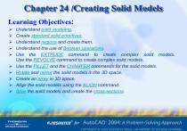 Chapter 24 /Creating Solid Models Learning Objectives: Understand solid modeling. Create standard solid primitives. Understand regions and create them. Understand the use of Boolean operations. Use the EXTRUDE command to create complex solid models. Use the REVOLVE command to create complex solid models. Use the FILLET and the CHAMFER commands for the solid models. Rotate and mirror the solid models in the 3D space. Create an array in 3D space. Align the solid models using the ALIGN command. Slice the solid models and create the cross-sections. Chapter 24 /Creating Solid Models CREATING PREDEFINED SOLID PRIMITIVES The solid primitives form the basic building blocks for a complex solid. The number of lines in a solid model representation is controlled by the value assigned to the ISOLINES variable. The number of lines determines the number of computations needed to generate a solid. If the value is high, it will take significantly more time to generate a solid on the screen. The FACETRES system variable controls the smoothness in the shaded and rendered objects. ACIS has six predefined solid primitives that can be used to construct a solid model : Learning Objectives • BOX • SPHERE • CONE • TORUS • CYLINDER • WEDGE Chapter 24 /Creating Solid Models • Creating a Solid Box You can use the BOX command to create a solid rectangular box or a cube. This command provides a number of options for creating the box. These options are: • Two Corner Option • Center-Length Option • Corner-Cube Option • Two Corner Option This is the default option and using this option you can create a solid box by defining the first corner of the box and the other corner of the box, see figure. Note that the length of the box will always be taken along the X axis, the width along the Y axis and the height along the Z axis. Creating the box using the two corner option Learning Objectives Predefined Primitives Chapter 24 /Creating Solid Models • Center-Length Option The center of the box is the point where the center of the gravity of the box lies. This option is used to create a box by specifying the center of the box, as well as the length, width, and height of the box, see figure. • Corner-Cube Option This option is used to create a cube starting from a specified corner. Since you are creating a cube, it will prompt for only the length of the cube that will also be the width and the height (figure). Learning Objectives Creating the box using the Corner-Length option Creating the cube using the Corner-Cube option Solid Box Chapter 24 /Creating Solid Models • Creating a Solid Cone The CONE command creates a solid cone with an elliptical or circular base. This command provides you with the option of defining the height of the cone or the location of the apex of the cone. Defining the location of the apex will also define the height of the cone and the orientation of the base of the cone from the XY plane. The methods of creating circular and elliptical cones are discussed next. • Circular Cone Learning Objectives • Elliptical Cone Predefined Primitives Chapter 24 /Creating Solid Models • Circular Cone This method is used to create a cone with a circular base (figure (a)). To specify the apex (figure (b)), enter A at the Specify height of cone or [Apex] prompt. Figure (a) Figure showing a circular cone Learning Objectives Figure (b) Creating a cone using the Apex option Solid Cone Chapter 24 /Creating Solid Models • Elliptical Cone Using this method you can create a cone that has the elliptical base. To create an elliptical cone, enter E at the Specify center point for base of cone or [Elliptical] <0,0,0> prompt. You will be prompted to create the base ellipse for the cone. You can create the base ellipse using any of the methods for drawing the ellipse. However, you cannot specify the rotation in this case for defining the other axis. You will have to specify the length of the other axis. Once you have entered all these values, you will be prompted to specify the height of the cone or the apex of the cone. Figure shows an elliptical cone. Learning Objectives An elliptical cone Solid Cone Chapter 24 /Creating Solid Models • Creating a Solid Cylinder You can use the CYLINDER command to create a solid cylinder. Similar to the CONE command, this command also provides you with two options for creating the cylinder: circular cylinder and elliptical cylinder. This command allows you to define the height of the cylinder or the center of the other end for creating an inclined cylinder. The options for creating different types of cylinders are discussed next. • Circular Cylinder Learning Objectives • Elliptical Cylinder Predefined Primitives Chapter 24 /Creating Solid Models • Circular Cylinder This option is used to create a cylinder with circular base (figure (a)). You can also create an inclined cylinder by specifying the center of the other end (figure (b)). This is done by entering C at the Specify height of cylinder or [Center of other end] prompt. Figure (a) Creating circular cylinder Learning Objectives Figure (b) Specifying the center of the other end Solid Cylinder Chapter 24 /Creating Solid Models • Elliptical Cylinder This option is used to create a cylinder with an elliptical base. The elliptical cylinder can be created by entering E at the Specify center point for base of cylinder or [Elliptical] <0,0,0> prompt. You will be prompted to create the ellipse for the base. You can create the ellipse for the base using any of the methods for creating the ellipse. Note that you can not define the other axis using the rotation method. You can specify the height of the cylinder or the center of the other end of the cylinder, see figures. Creating an elliptical cylinder Learning Objectives Specifying the center of the other end Solid Cylinder Chapter 24 /Creating Solid Models • Creating a Solid Sphere The SPHERE command is used to create a solid sphere (figure). When you choose t
