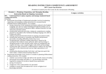 READING INSTRUCTION COMPETENCE ASSESSMENT 2007 Content Specifications Worksheet Created by the CSU Center for the Advancement of Reading Domain 1—Planning, Organizing, and Managing Reading Instruction Based on Ongoing Assessment Campus Activities 001 Understand how to plan, organize, and manage standards-based reading instruction. Including: Demonstrate knowledge of fundamental principles involved in planning, organizing, and managing reading instruction in a research-based, standards-based reading program. For example: a. basing instruction on the standards/curriculum outlined in the English Language Arts (ELA) Content Standards through the primary use of California State Board of Education (SBE)–adopted materials for both instruction and intervention b. ensuring that instruction provides a balanced, comprehensive reading program as described in the California Reading/Language Arts (RLA) Framework (2007) c. making instructional decisions based on ongoing assessment results d. ensuring that instruction is systematic and explicit and promotes prevention of reading difficulties before they occur e. recognizing that systematic reading instruction is based on the assumption that students master particular skills and knowledge at designated points in time and that earlier skills are foundational and requisite for later, more complex higher-order skills and knowledge f. ensuring that daily instruction is differentiated to address the full range of learners in the classroom and conveys high expectations to all learners g. ensuring that planning includes both short- and long-term goals that lead to daily, evidence-based learning objectives Demonstrate knowledge of key factors to consider in planning differentiated reading instruction. For example: a. students' assessed knowledge and skills in the specific area(s) of reading b. prerequisite knowledge and skills (i.e., the knowledge and skills required for students to be able to benefit from instruction) c. pacing of instruction d. complexity of the content/skills to be presented e. scaffolds to ensure that all students have access to higher-level knowledge and skills 1 Domain 1—Planning, Organizing, and Managing Reading Instruction Based on Ongoing Assessment Campus Activities Demonstrate knowledge of how to organize and manage differentiated reading instruction and interventions to meet the needs of all students. For example: a. using flexible grouping, individualized instruction, and whole-class instruction as needed b. using all components of core California SBE–adopted materials to make grade-level content accessible to all students c. recognizing that students should be grouped for interventions according to the severity of their difficulties (i.e., benchmark, strategic, and intensive groups) Demonstrate knowledge of components of effective instructional delivery in reading as described in the California RLA Framework (2007). For example: a. orientation (e.g., engagement, teacher demonstration) b. presentation (e.g., explicit instruction, modeling, pacing) c. structured and guided practice (e.g., reinforcement, questioning, feedback, corrections, peer-mediated instruction) d. independent practice and application Demonstrate knowledge of strategies for engaging students in reading instruction and motivating them to progress in their reading development. For example: a. providing instruction that enables students to develop the skills necessary for successful reading b. creating a stimulating learning environment c. providing appropriate reading materials (e.g., readable and interesting) d. reading aloud to students e. encouraging parents/guardians to read to their children and to model the value of reading at home for pleasure and information Demonstrate knowledge of a variety of strategies for promoting purposeful independent reading of a wide variety of narrative/literary and expository/ informational texts (e.g., teaching students how to select books at appropriate reading levels, using students' personal interests to help motivate and increase independent reading, providing structured independent-reading opportunities in class, supporting at-home reading) and methods for monitoring students' independent reading (e.g., studentmaintained reading logs, book reports, formal and informal oral presentations, class discussions, book talks). 2007 RICA Content Specifications 2 CSU Center for the Advancement of Reading Domain 1—Planning, Organizing, and Managing Reading Instruction Based on Ongoing Assessment Campus Activities Demonstrate knowledge of factors involved in creating a literacy-rich environment and strategies for promoting students' lifelong appreciation for reading for pleasure and for information (e.g., encouraging book clubs, literature circles, author studies, and other reading discussion groups; helping students use reading to set and pursue their own research goals). Demonstrate knowledge of support systems that can be used to promote the skillful teaching of reading (e.g., reading coach, grade-level team meetings and professional development that are focused on instruction and California SBE–adopted materials). 002 Understand the purposes of reading assessment and best practices related to standards-based entry-level assessment, monitoring of student progress, and summative assessment. Including: Demonstrate knowledge of the three primary purposes of reading assessment: a. entry-level assessment (e.g., using standards/curriculum-based assessments to determine the extent to which students possess crucial prerequisite skills and knowledge expected at their grade level and to determine students' current skills and knowledge in a specific area of reading prior to planning instruction and/or intervention in that area) b. monitoring of student progress—for example: conducting curriculum-based assessment on an ongoing basis to determine whether students are progressing adequately toward achieving standards analyzing wheth