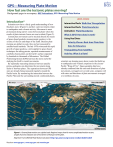 GPS—Measuring Plate Motion How fast are the tectonic plates moving? Background pages to accompany: IRIS’ Animations: GPS–Measuring Plate Motion Introduction* Scientists now have a fairly good understanding of how the plates move (Figure 1) and how such movements relate to earthquakes and volcanic activity. Movement is most pronounced along narrow zones between plates where the results of plate-tectonic forces are most evident (Figure 2). Current plate movement can be tracked directly by means of space-based geodetic measurements; geodesy is the science of the size and shape of the Earth. Because plate motions are global in scale, they are best measured by satellite-based methods. The late 1970s witnessed the rapid growth of space geodesy, a term applied to space-based techniques for taking precise, repeated measurements of carefully chosen points on the Earth’s surface separated by hundreds to thousands of kilometers. The Global Positioning System (GPS) has been the most useful for studying the Earth’s crustal movements. By repeatedly measuring distances between specific points, geologists can determine the movement along faults or between plates. The separations between GPS sites are already being measured regularly around the Pacific basin. By monitoring the interaction between the Pacific Plate and the surrounding mostly continental plates, HOT LINKS: Interactive Flash: Walk-Run Triangulation Interactive Flash: Plate Boundaries Animation: Plate Boundaries What is GPS? How does it work? Using Real Data: Velocity Viewer: Real-time Plate Rate Data for Educators Triangulating from Satellites Activity: What is a Rate? scientists are learning more about events that build up to earthquakes and volcanic eruptions in the circumPacific “Ring of Fire”. Space-geodetic data have already confirmed that the rates and directions of plate movements, averaged over several years, compare well with rates and directions of plate movements averaged over millions of years. Figure 1: General plate motions on a global scale. Regional maps show far more complicated motion vectors. Length of arrows indicates rate of movement of that part of the plate. Map from From UNAVCO Plate Motion Calculator: http://sps.unavco.org/crustal_motion/dxdt/model/ *Text from www.gps.gov/, www.usgs.gov and www.faa.gov Before GPS how did we know the plates were moving? Two lines of evidence unlocked the mystery: Seemingly related rock types great distances apart and the magnetic polarity recorded by ocean-floor rocks. Alfred Wegener (1880-1930) found that large-scale geological features on separated continents often matched very closely when the continents were brought together. For example, the Appalachian Mountains of eastern North America matched with the Scottish Highlands, and the distinctive rock strata of the Karroo system of South Africa were identical to those of the Santa Catarina system in Brazil. He was ostracized for his theory of “continental drift” because the all-important geology of ocean basins that confirm plate tectonics and continental drift was not sufficiently understood until the 1960s and 70s. Evidence of past rates of plate movement on a smaller scale can be obtained from geologic mapping. If a rock formation of known age—with distinctive composition, structure, or fossils—mapped on one side of a plate boundary can be matched with the same formation on the other side of the boundary, then measuring the distance that the formation has been offset can give an estimate of the average rate of plate motion. This simple but effective technique has been used to determine the rates of plate motion at divergent boundaries, for example the Mid-Atlantic Ridge, and transform boundaries, such as the San Andreas Fault. The oceans floors were a key piece to the puzzle. Because the ocean-floor magnetic striping records the flip-flops in the Earth’s magnetic field, scientists, knowing the timings of magnetic reversals, can calculate the average rate of plate movement over time spans of several million years. These average rates of plate separations can range widely. The Arctic Ridge has the slowest rate (less than 2.5 cm/yr), and the East Pacific Rise near Easter Island, in the South Pacific about 3,400 km west of Chile, has the fastest rate (more than 15 cm/yr). B. an Pla te North Amer ic Juan d e Fuca Plate A. Figure 2: Plate velocities from Plate Boundary Observatory (PBO) A.) LEFT—Map of the western U.S. shows movement across the San Andreas fault zone in California (Red arrows indicate direction and rate of relative motion; yellow lines = active faults) . B.) ABOVE—The northeast-trending vectors of Washington and northern Oregon show that this part of the North American plate is being pushed toward the northeast by the subducting Juan de Fuca Plate. These plates are locked together by immense friction along the plate boundary. The stored elastic energy is released every 300 – 500 years in a great (M9) earthquake. Subduction zones occur around the Pacific Rim (the “Ring of Fire”). Recent great earthquakes at subduction zones include the Sumatra 2004 and Chile 2010 earthquakes. Maps from UNAVCO : http://geon.unavco.org/unavco/IDV_for_GEON_gps.html (click for details and activity) • A rate is a speed of motion • Velocity has both magnitude (rate = speed) and direction of motion • Velocities are represented by vectors • Vectors can be mathematically manipulated • Vectors can be used to describe properties of motion Every day we use rates to describe events that happen over a period of time. Perhaps you drove 65 miles per hour to school this morning because you were running late, or you rode on an amusement park ride last weekend that went 80 miles per hour. Each time you describe a change in position with respect to time, you have used a rate to do it. Rates can be described mathematically as: rate = distance / time. Velocity can be represented an arrow, whose length equals the r